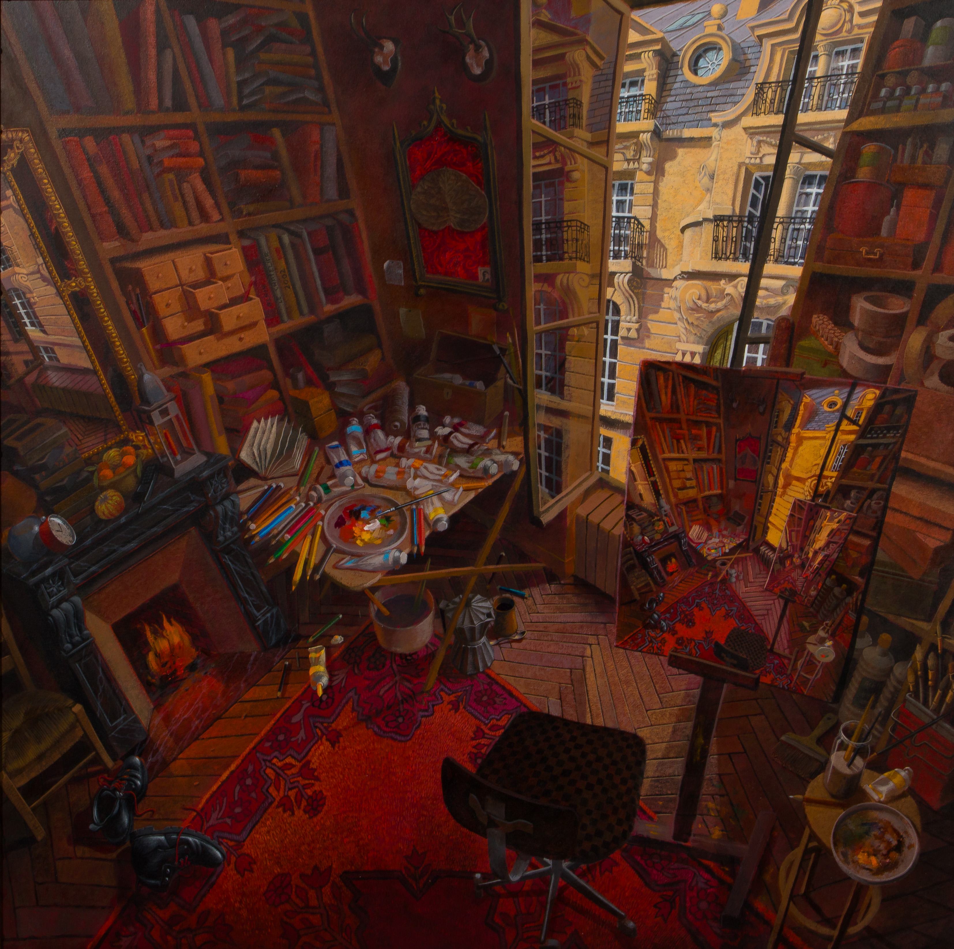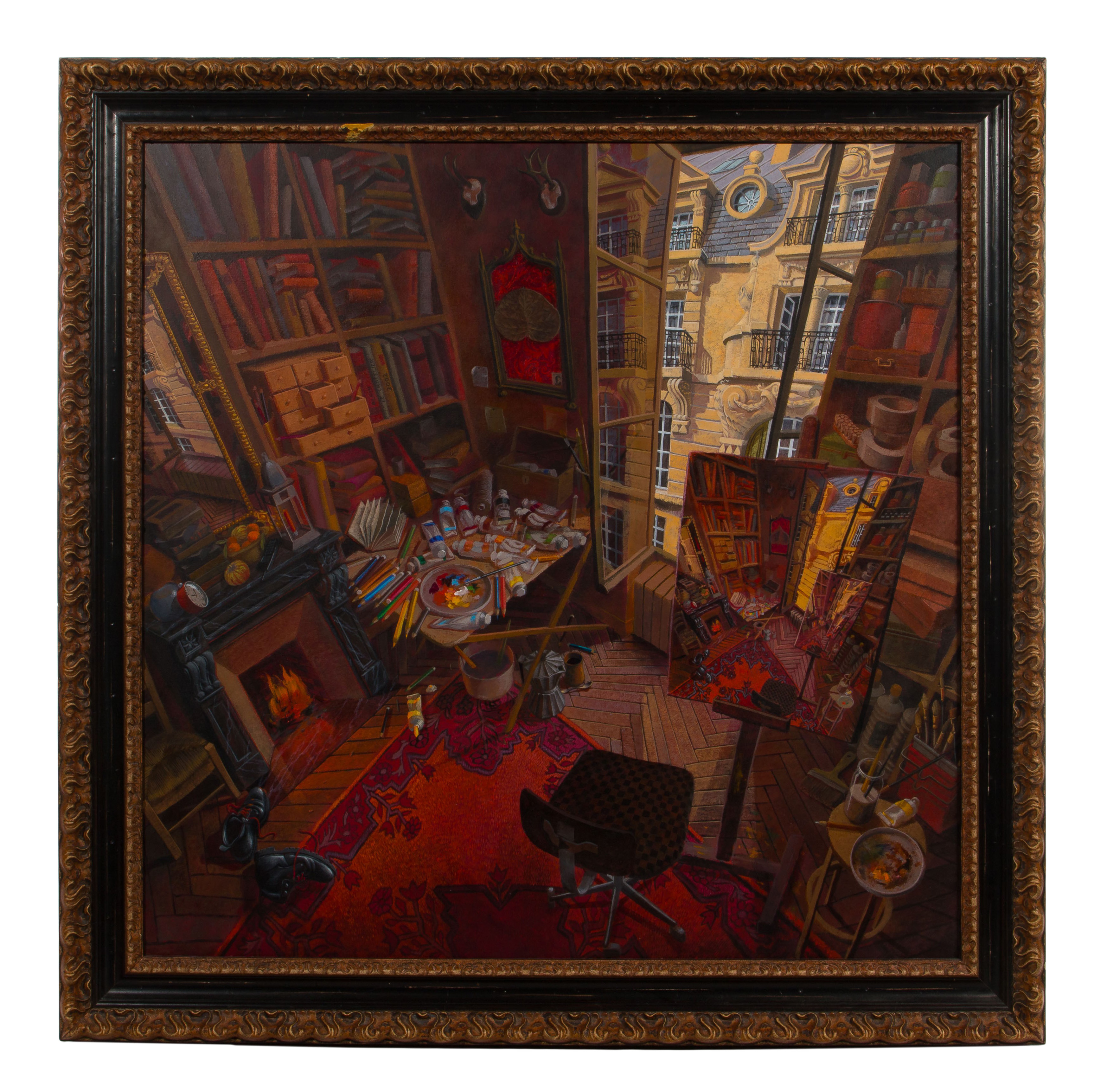 2002, signed on binding of book, depicting an artist studio, in a carved wood frame