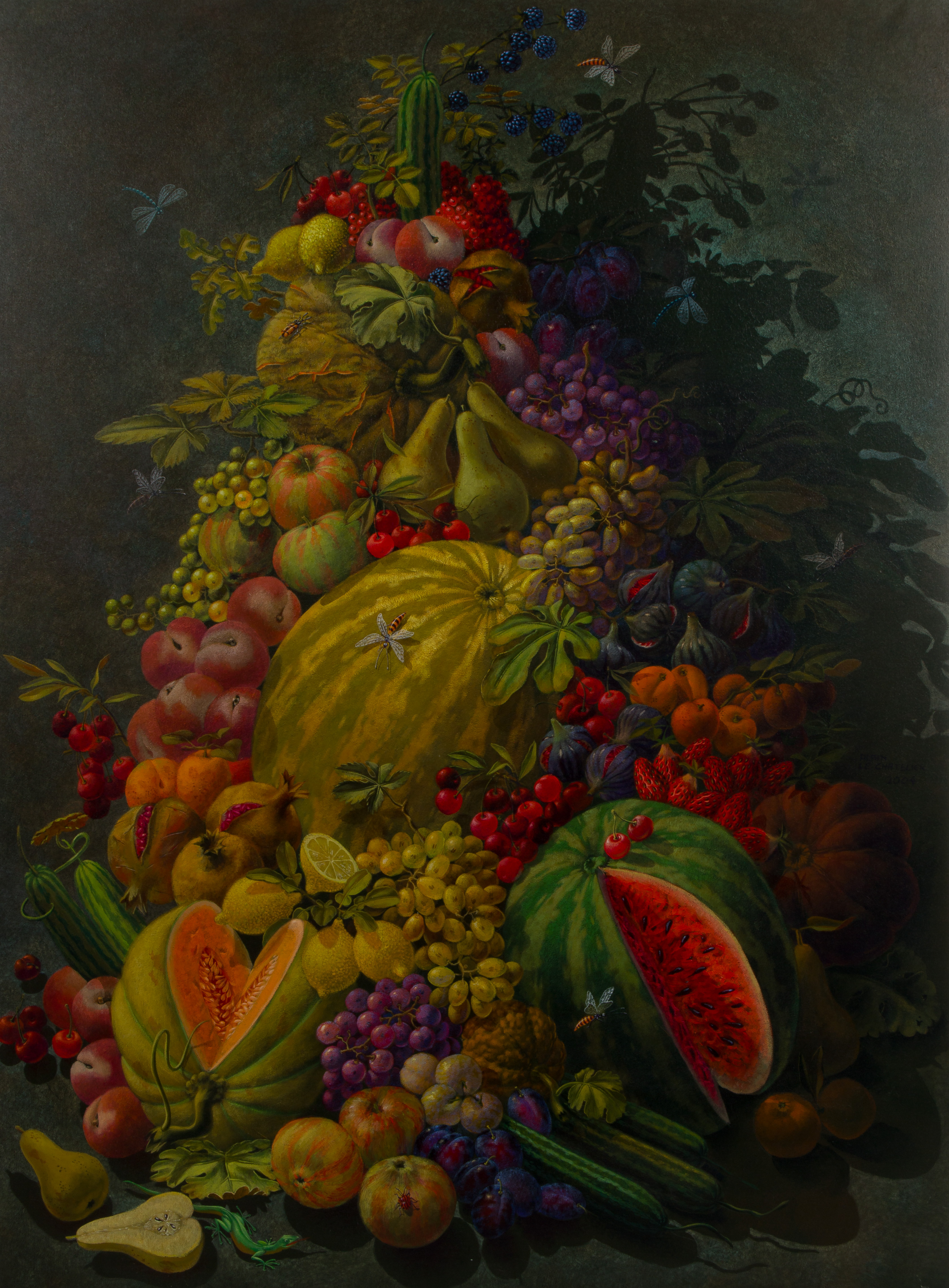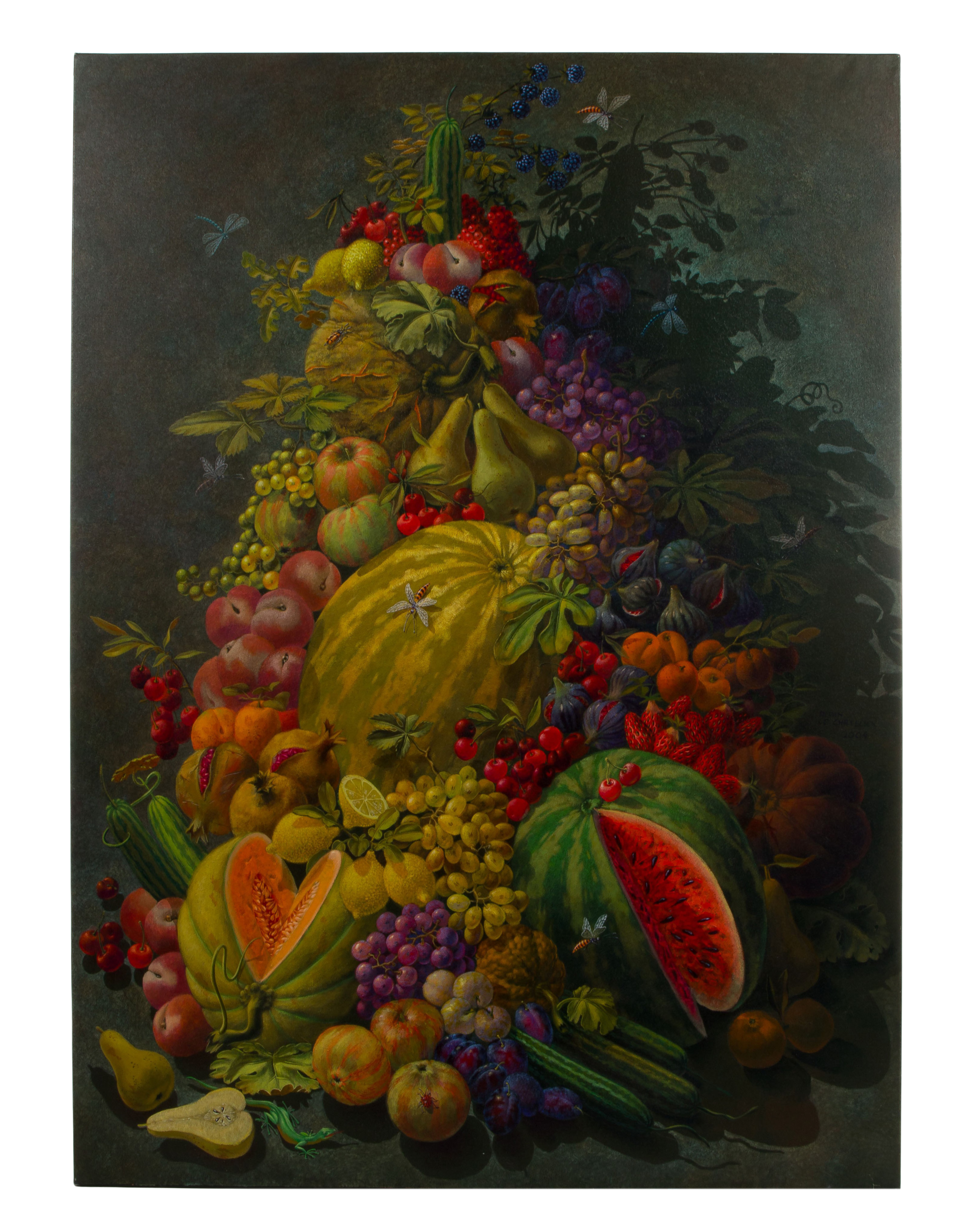 2005, signed right side, a still life of insects and fruit, canvas wrapped, unframed