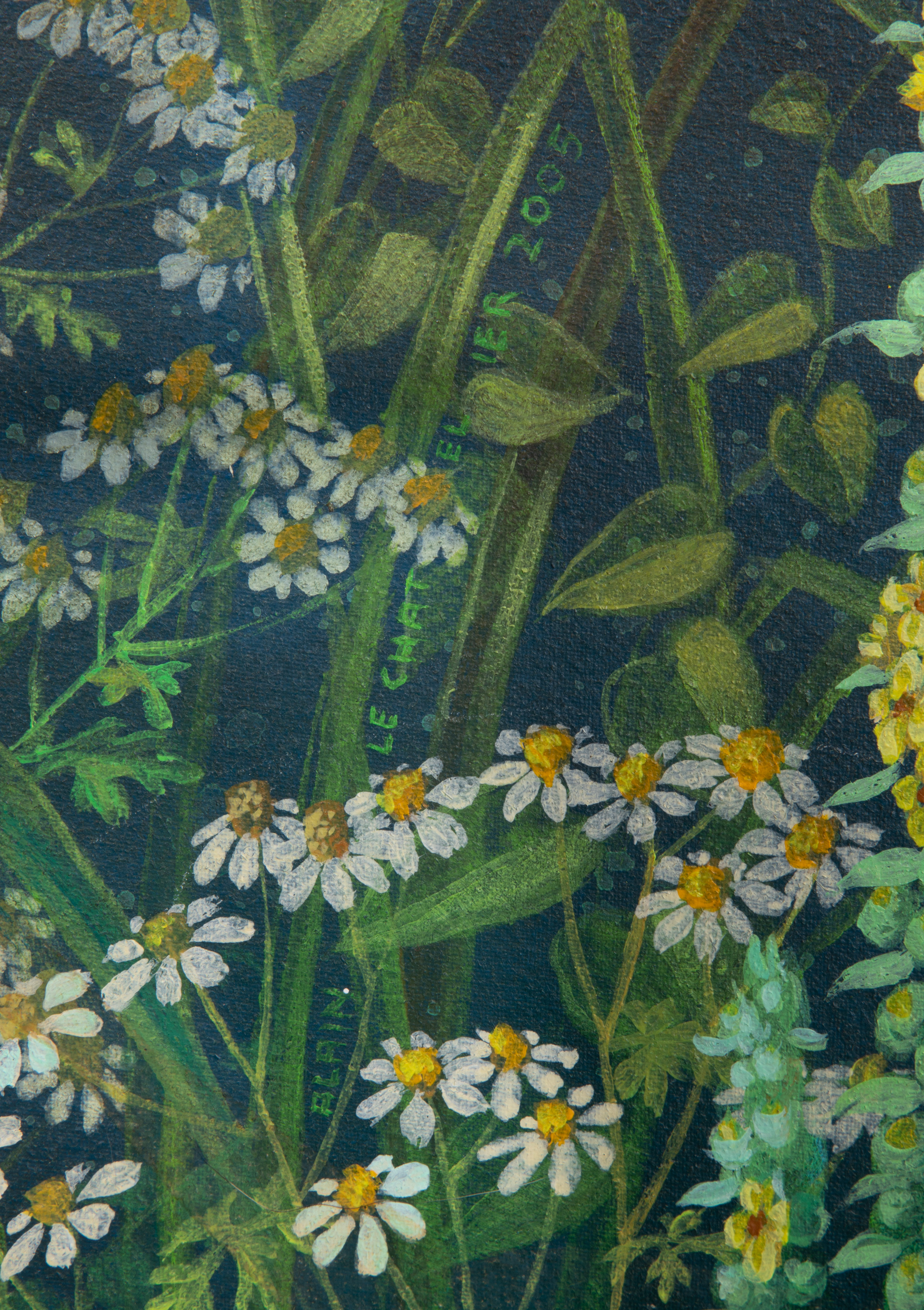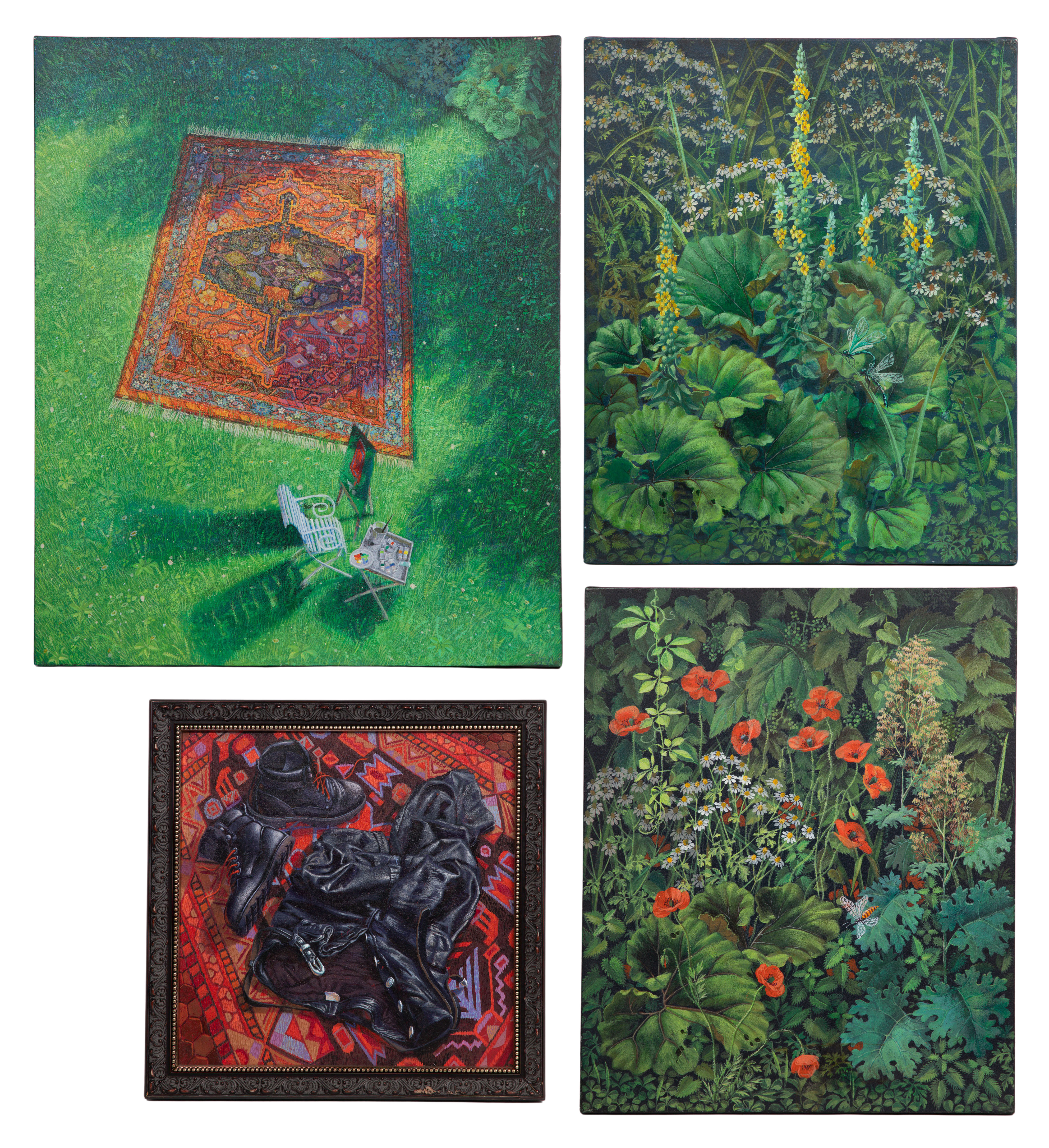 (4) items including (2) depicting wildflowers signed and dated 2005 within image, upper left and upper right quadrant and an undated and unsigned depiction of an Asian rug spread on a lawn, gallery wrapped canvas on stretchers, unframed as well as an unsigned depiction of black leather shoes and clothing on an Asian carpet having a wood frame