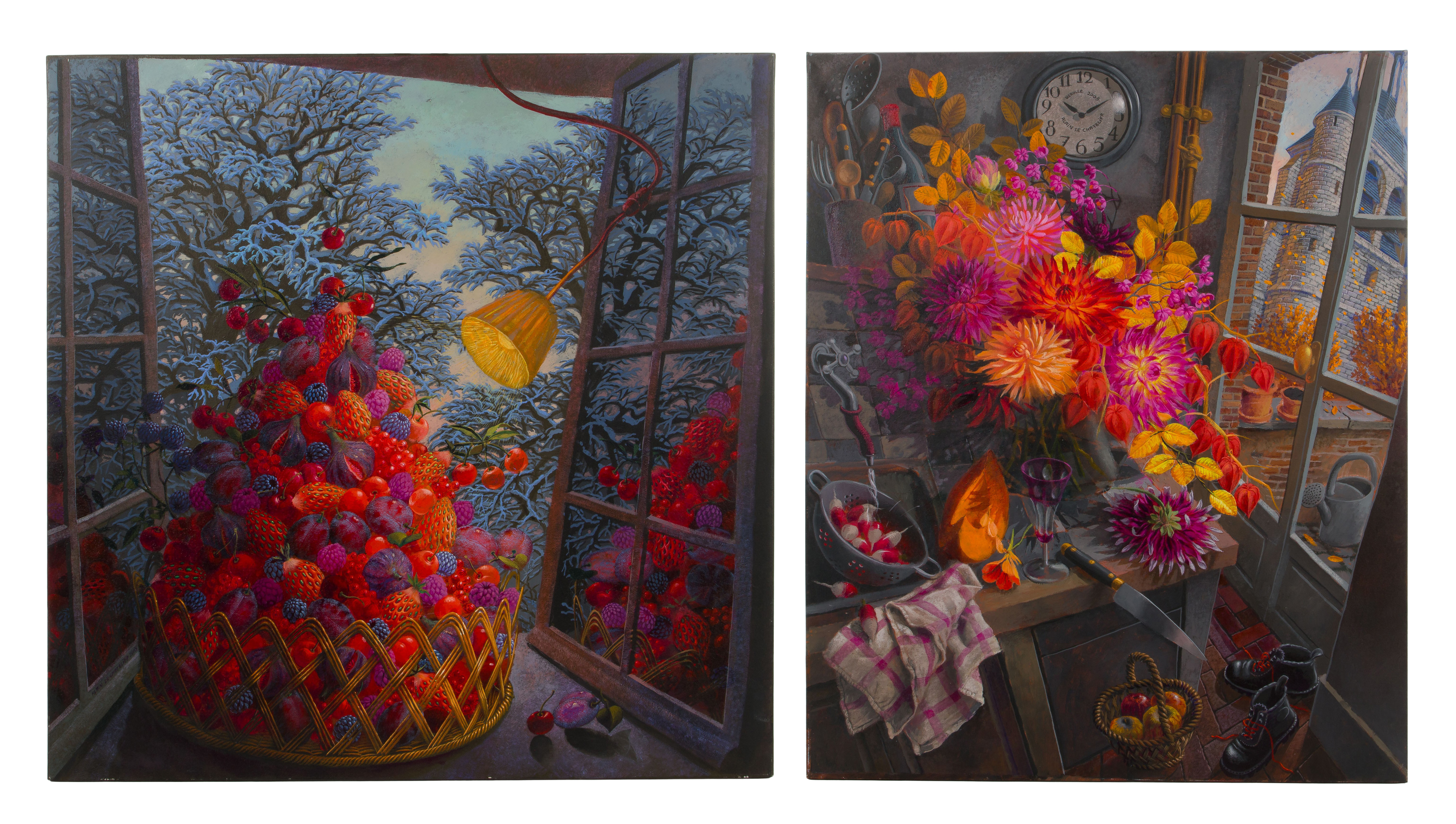 (2) items including a 2005 still life of fruit under a grow light, signed lower left window and a 2008 kitchen scene, signed in clock, both gallery wrapped