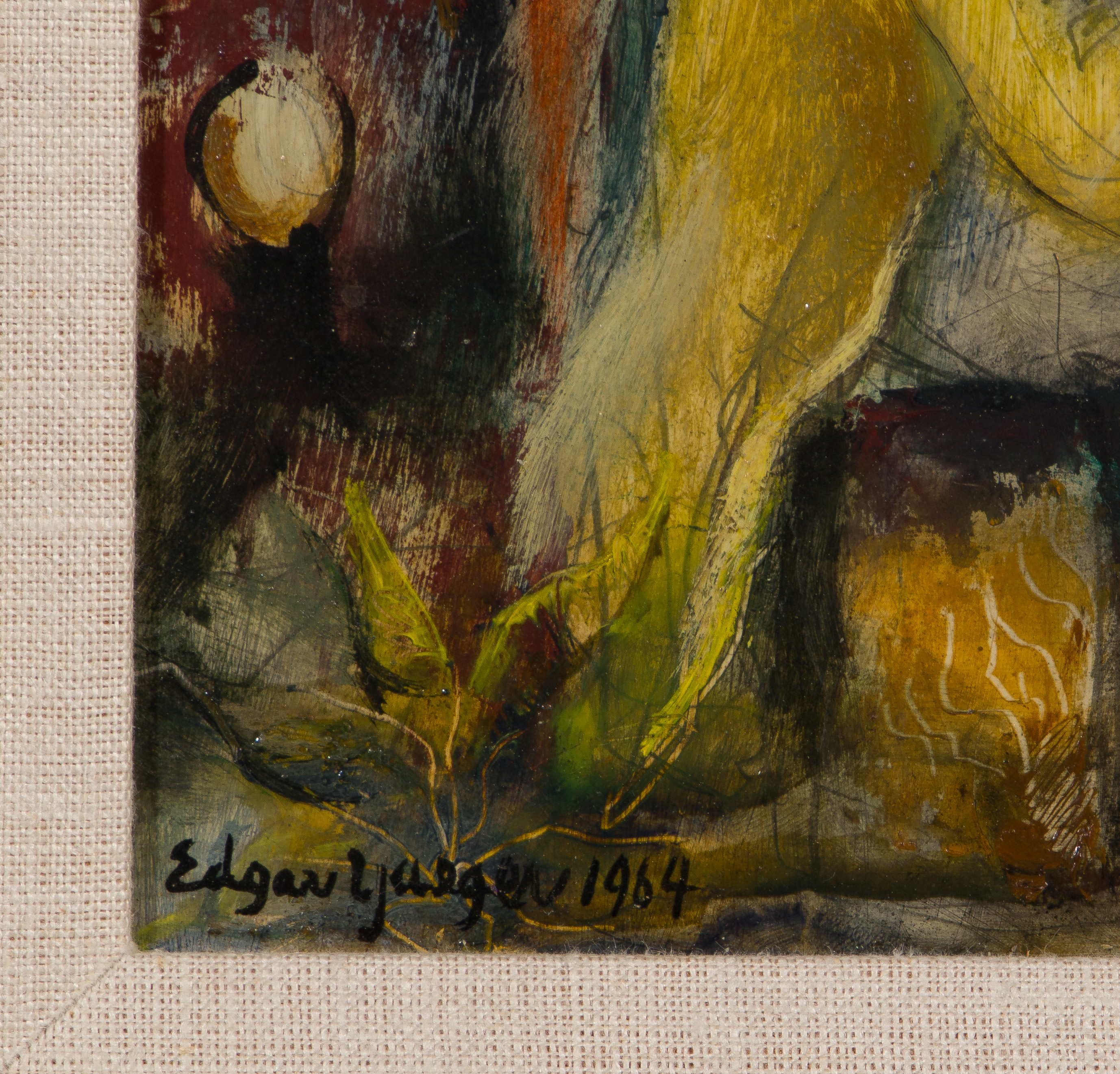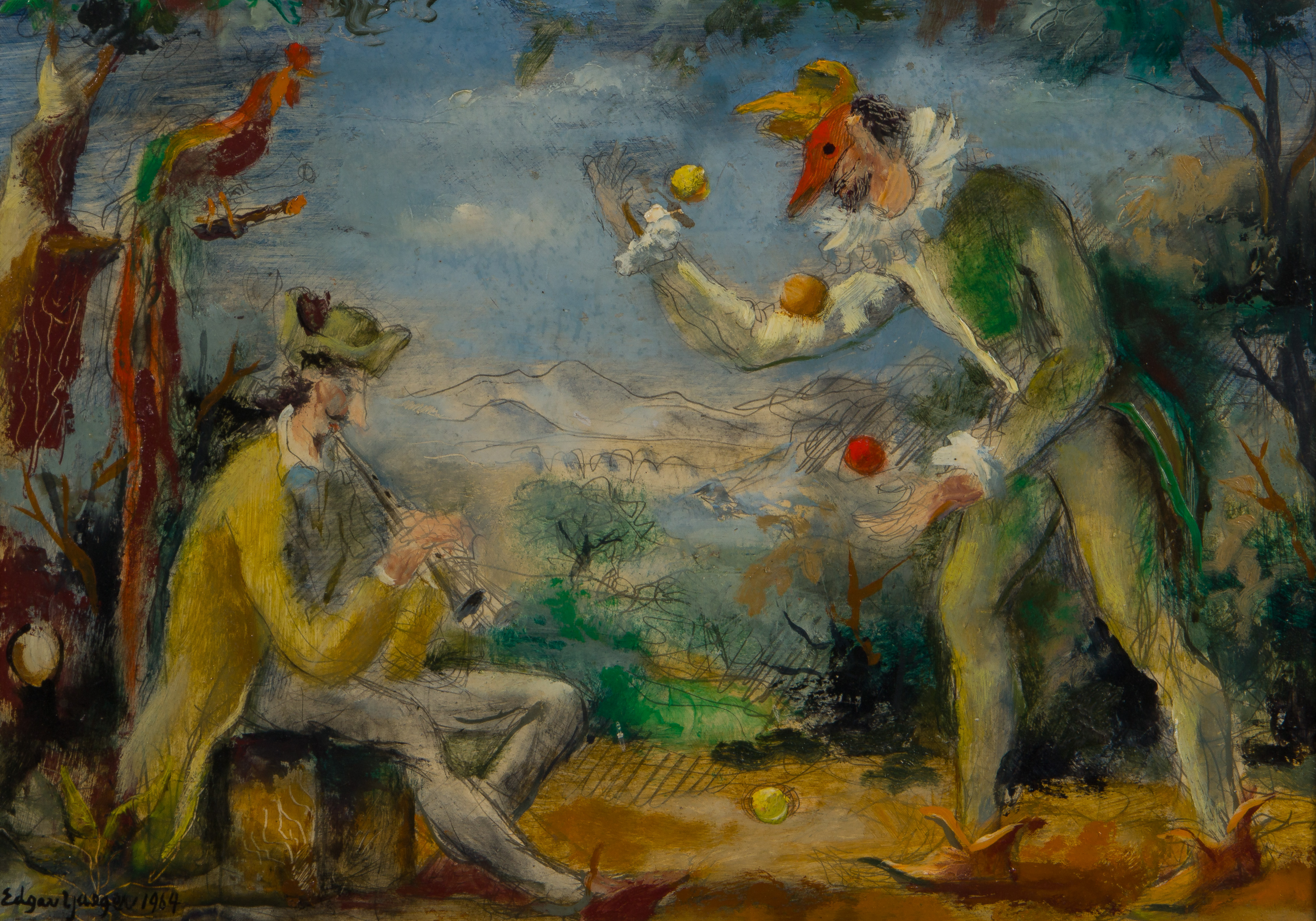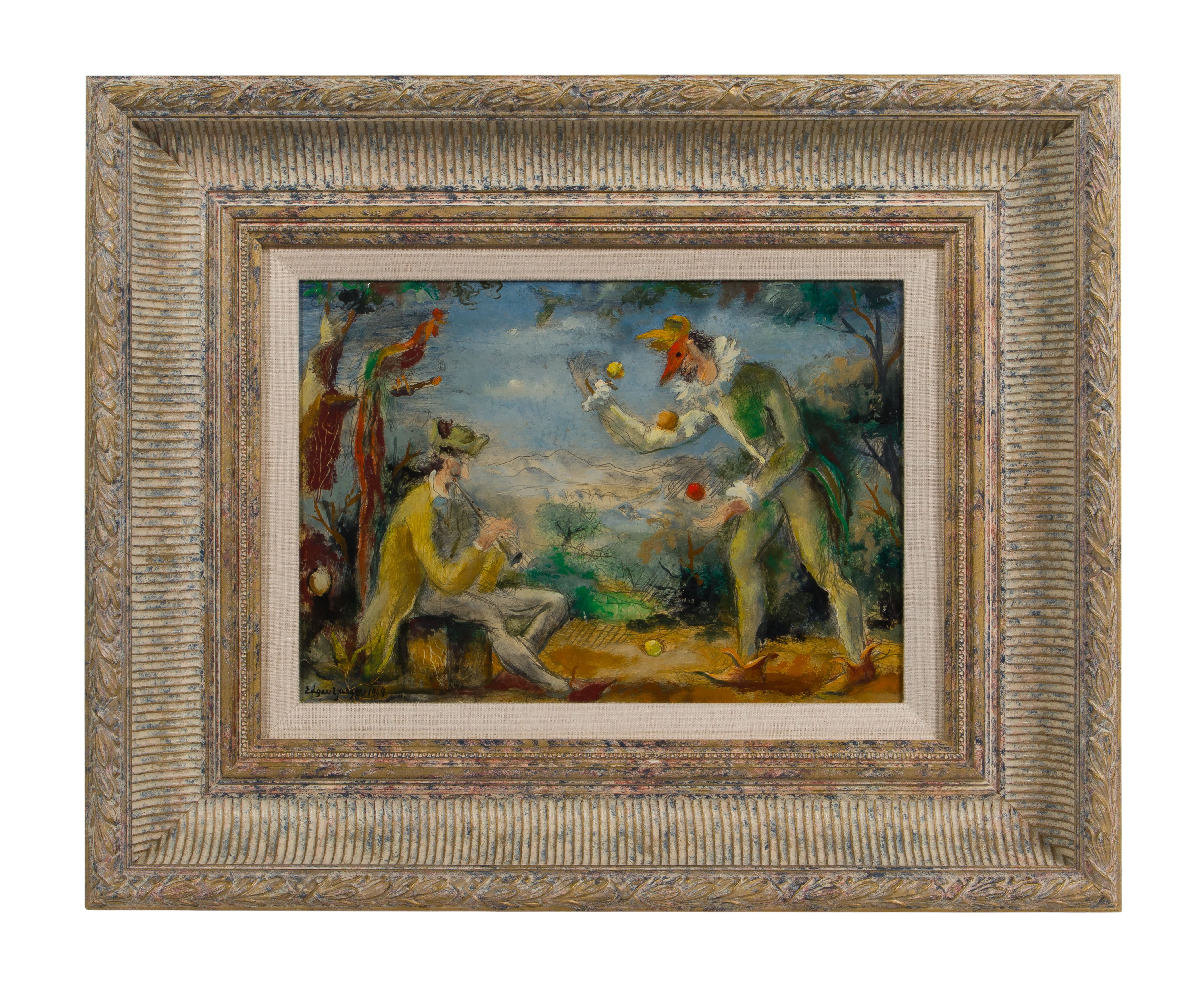 1964, signed lower left, depicting a musician and jester, in a painted wood frame