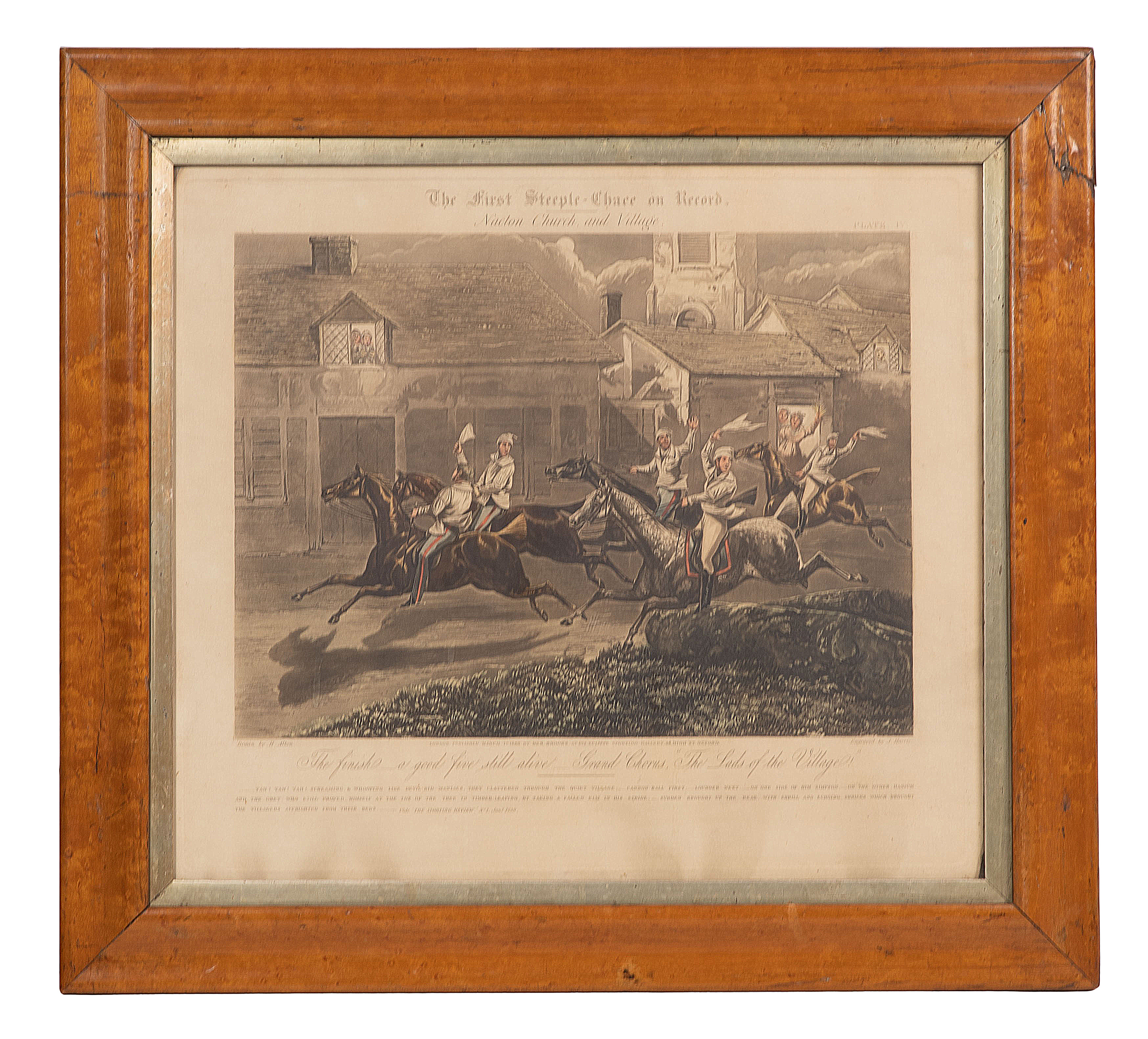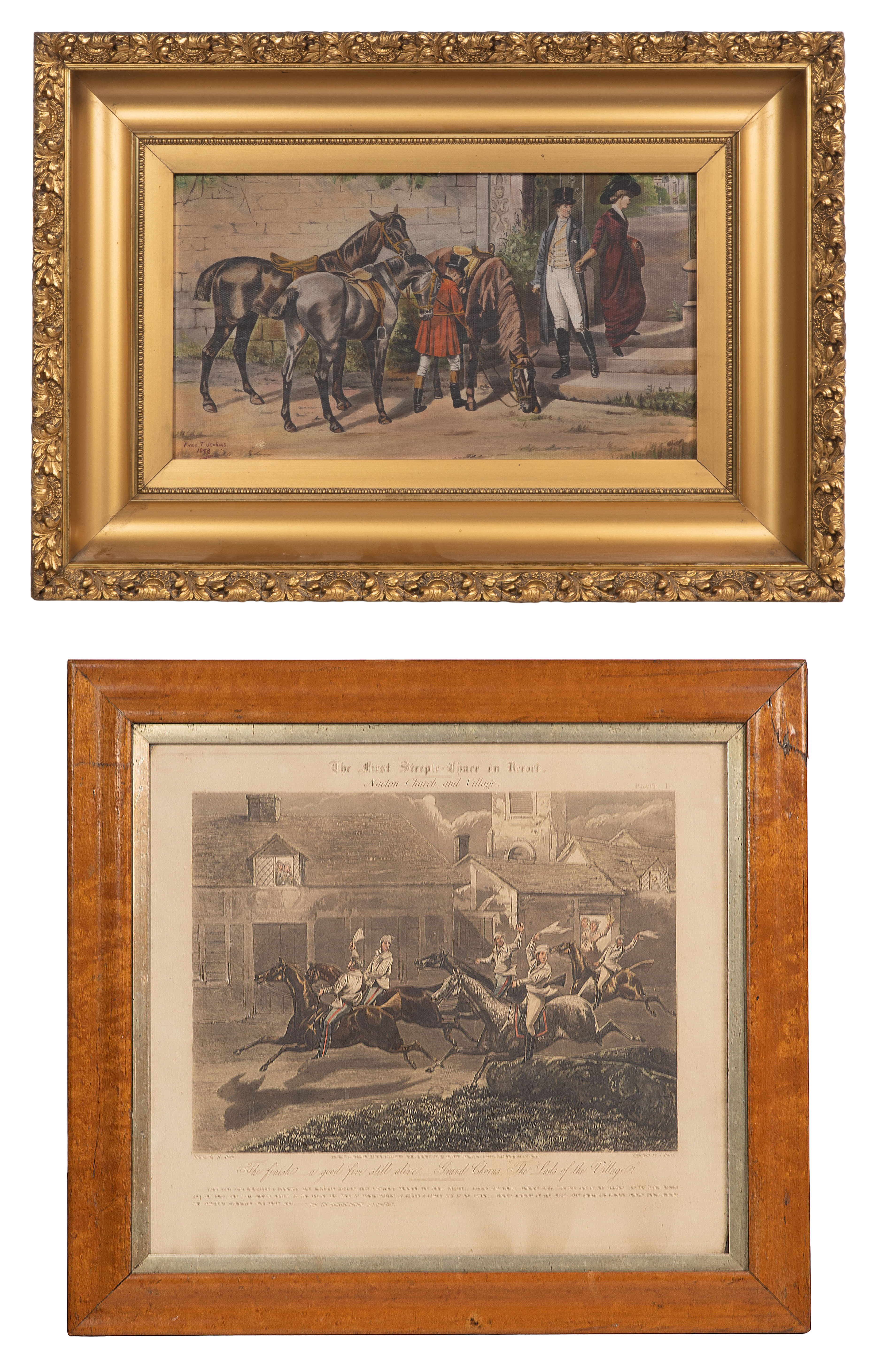 (2) total items including an 1898, signed depiction of gentry and horses, having a gold-tone gesso on carved wood frame; together with a hand-colored aquatint etching ‘The First Steeple-Chase on Record’ by J. Harris after a drawing by H. Allen and published by Ben Brooks of ‘The Sporting Review’ issue #1, London, 1839, (14.5 X 16.5-inch plate line) behind glass in a wood frame