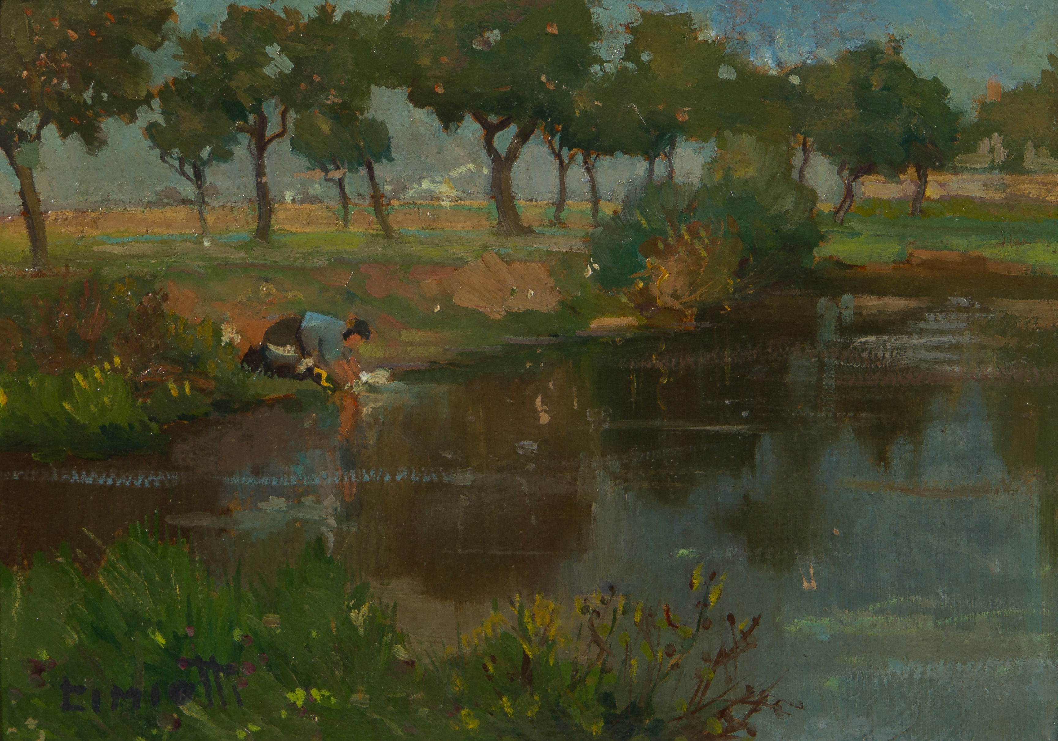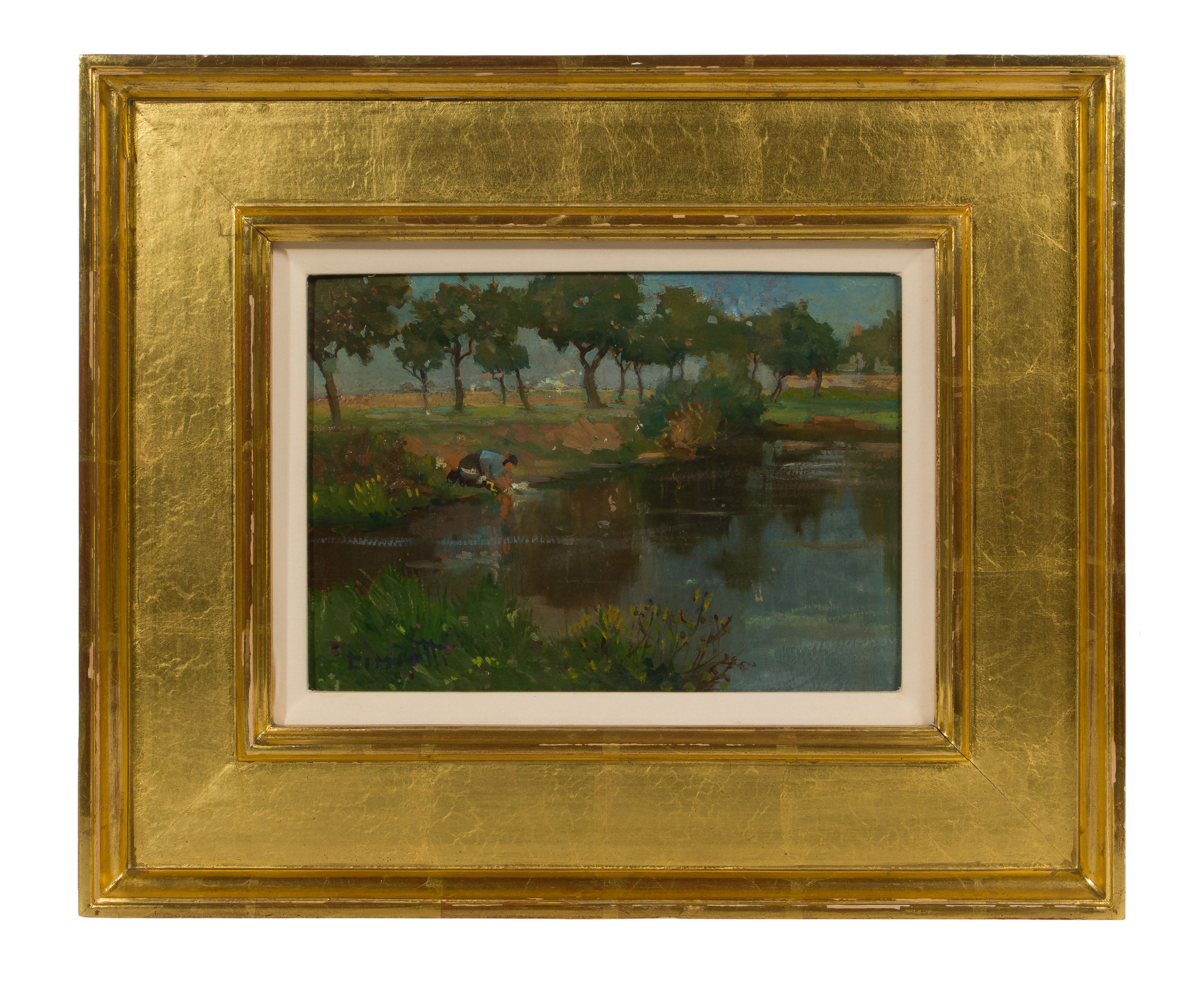 (2) undated, signed items including ‘The Village’ and ‘Woman Washing Clothes’ depicting a figure washing clothes in a stream, in matching gilt wood frame