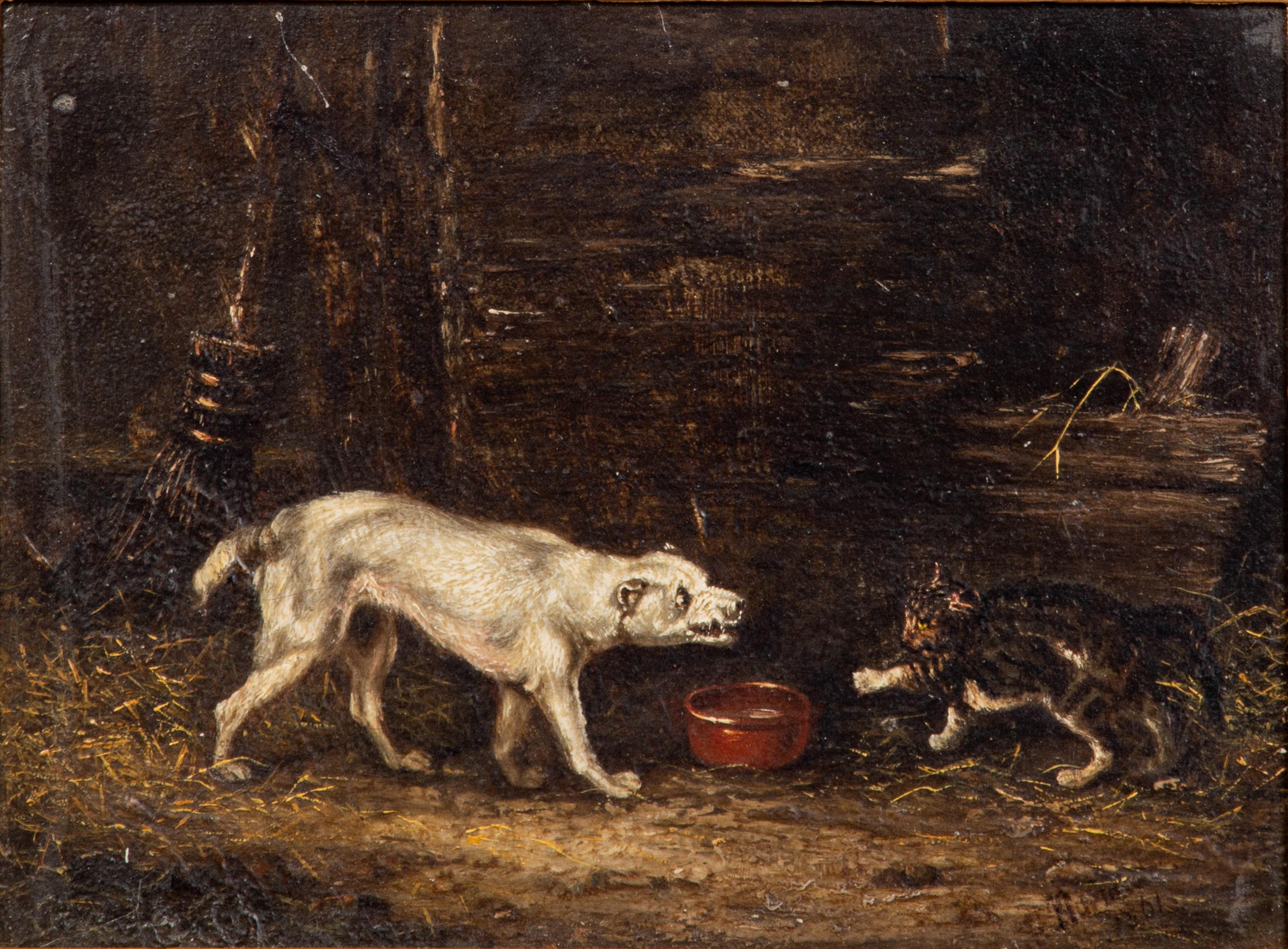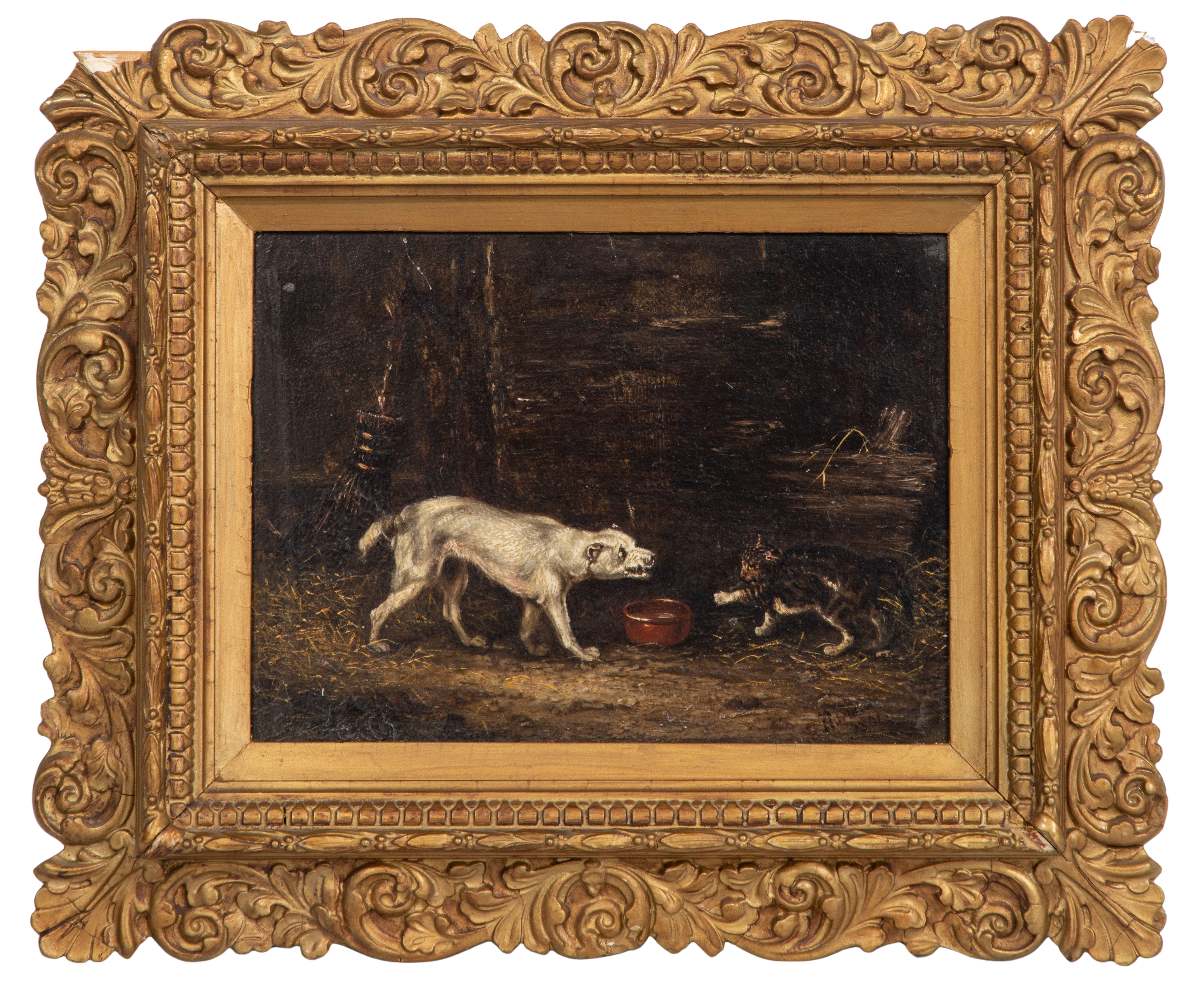 1861, signed lower right, depicting a dog and cat fighting over a dish of food, in a painted gold-tone gesso on wood frame