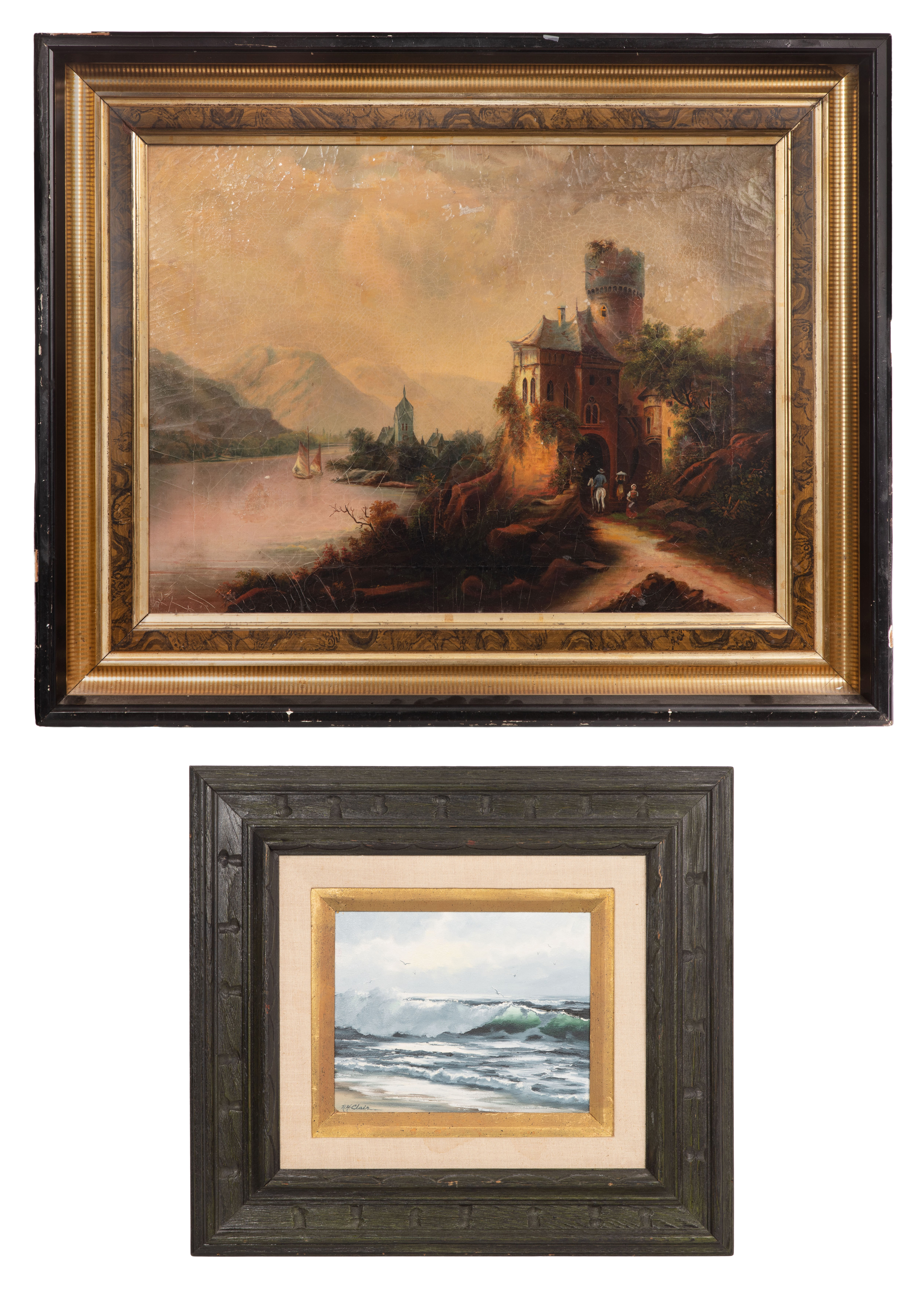 (2) total items including the undated and unsigned depiction of a ruined castle and riverside town having figures and sailboats, in a black and gold-tone gesso on carved wood frame; together with a signed ‘Roberta H. Clair’ (American b.1931) oil on board California seascape in a linen lined wood frame