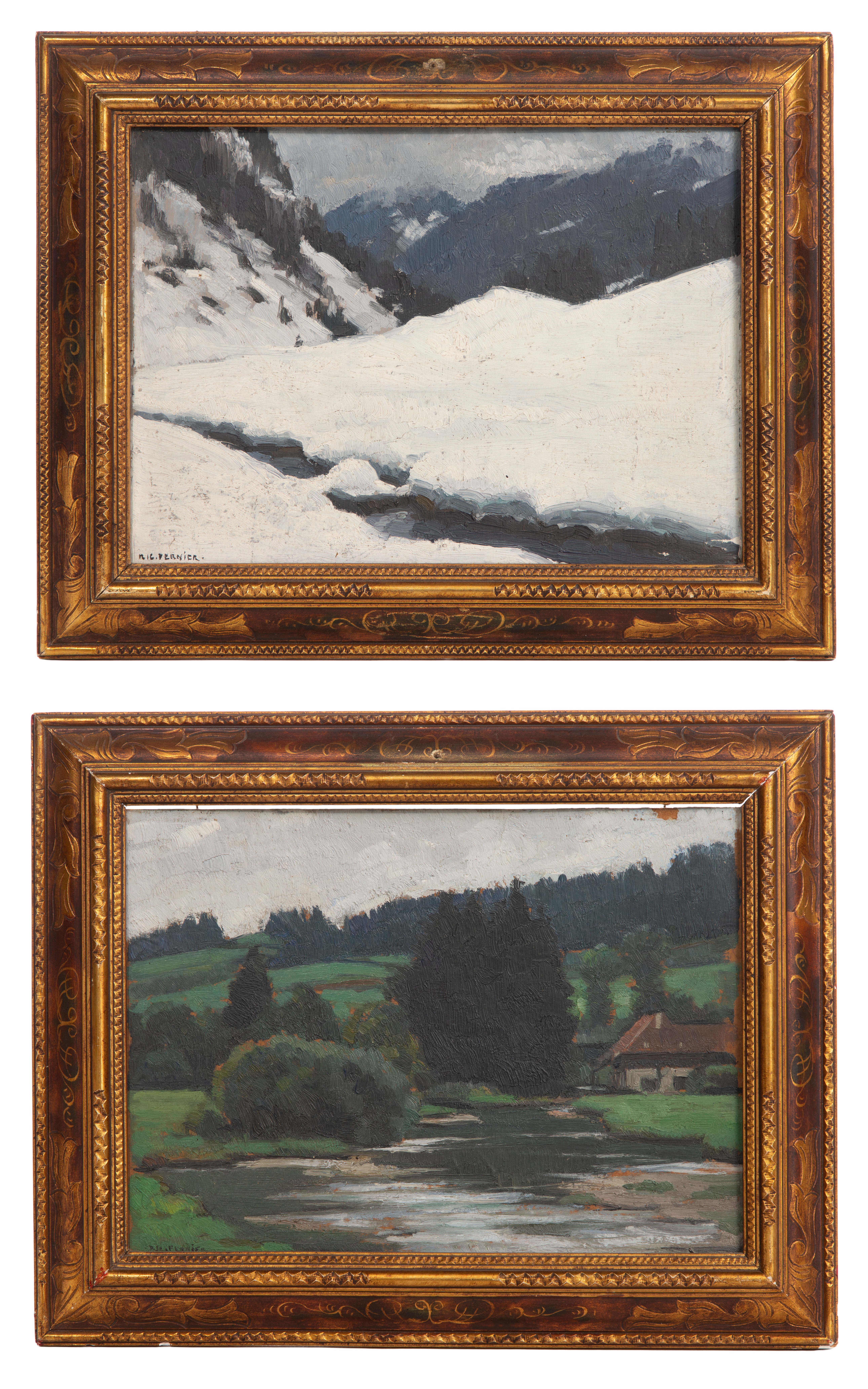 (2) items including a snowy mountain scene and a forested river valley, both signed lower left, the river valley having pencil signature and studio address verso, the mountain having printed name and address, both in gold-tone chip carved wood frames