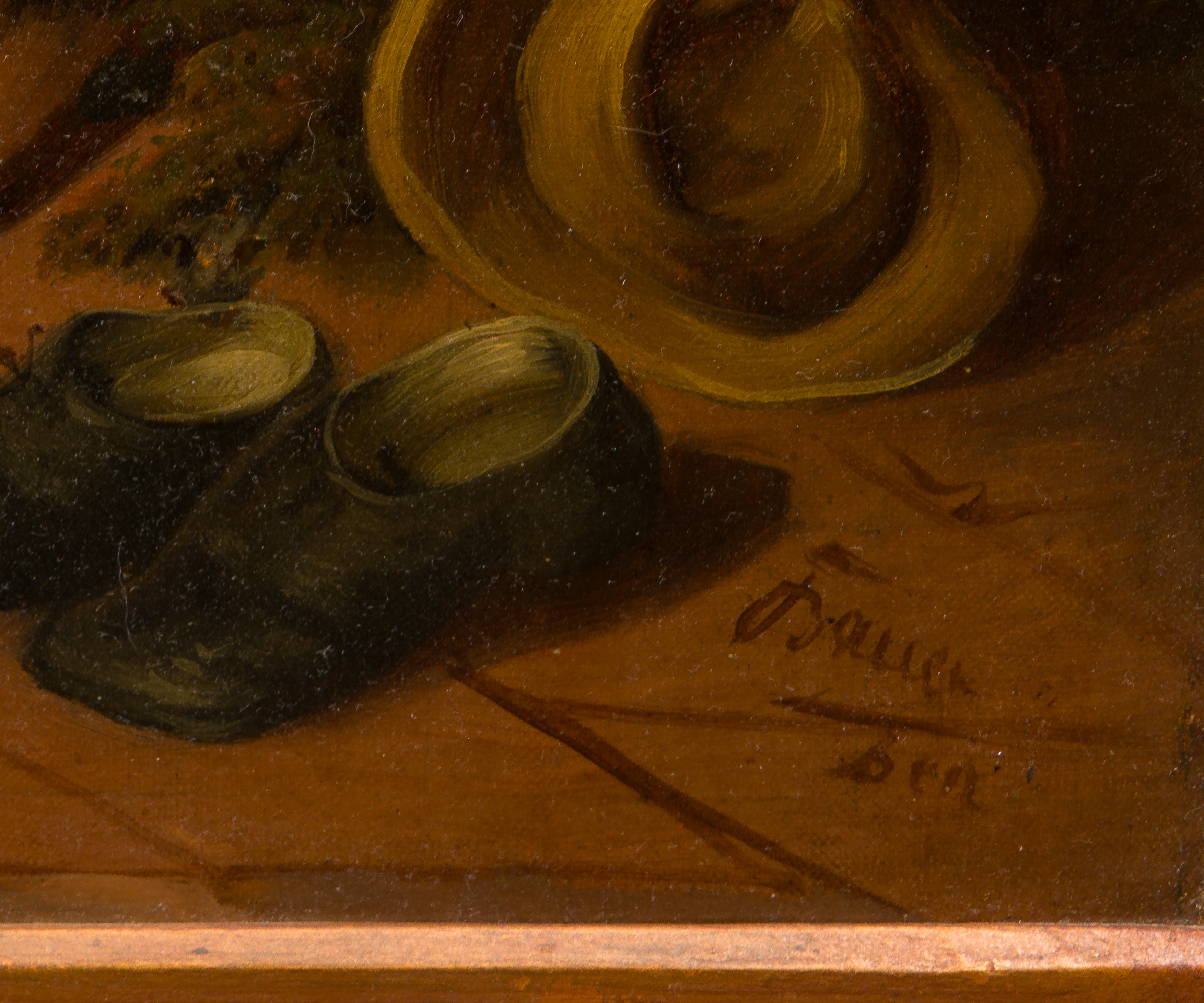 Undated, signed ‘Hauer’ lower right, title translation being ‘The Monastery Soup’, in a bronze-tone gesso on carved wood frame having a crossed-out French language label verso attributing the work to Auguste-Felix Hauer (French, b.1854) next to a label reading ‘E. Benezit’ for Emmanuel Benezit (French, 1854-1920), a Parisian gallerist and author of ‘Dictionnaire Des Peintres, Sculpteurs, Dessinateurs Et Graveurs’