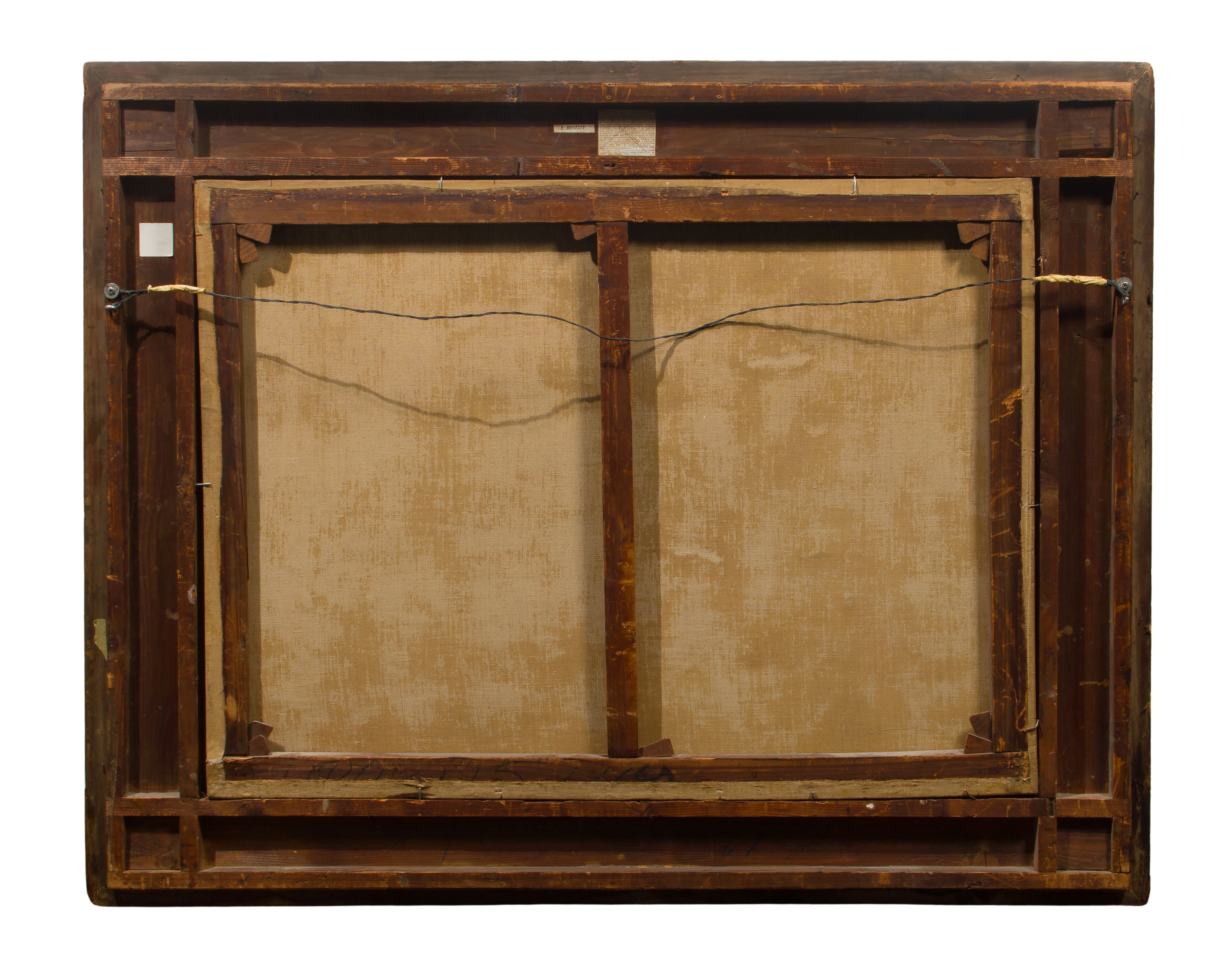 Condition: canvas relined, areas of craquelure, a possible repair lower right near rightmost figure’s blue garb, frame having moderate wear, losses and repairs to beaded edge trim and occasional flaking throughout