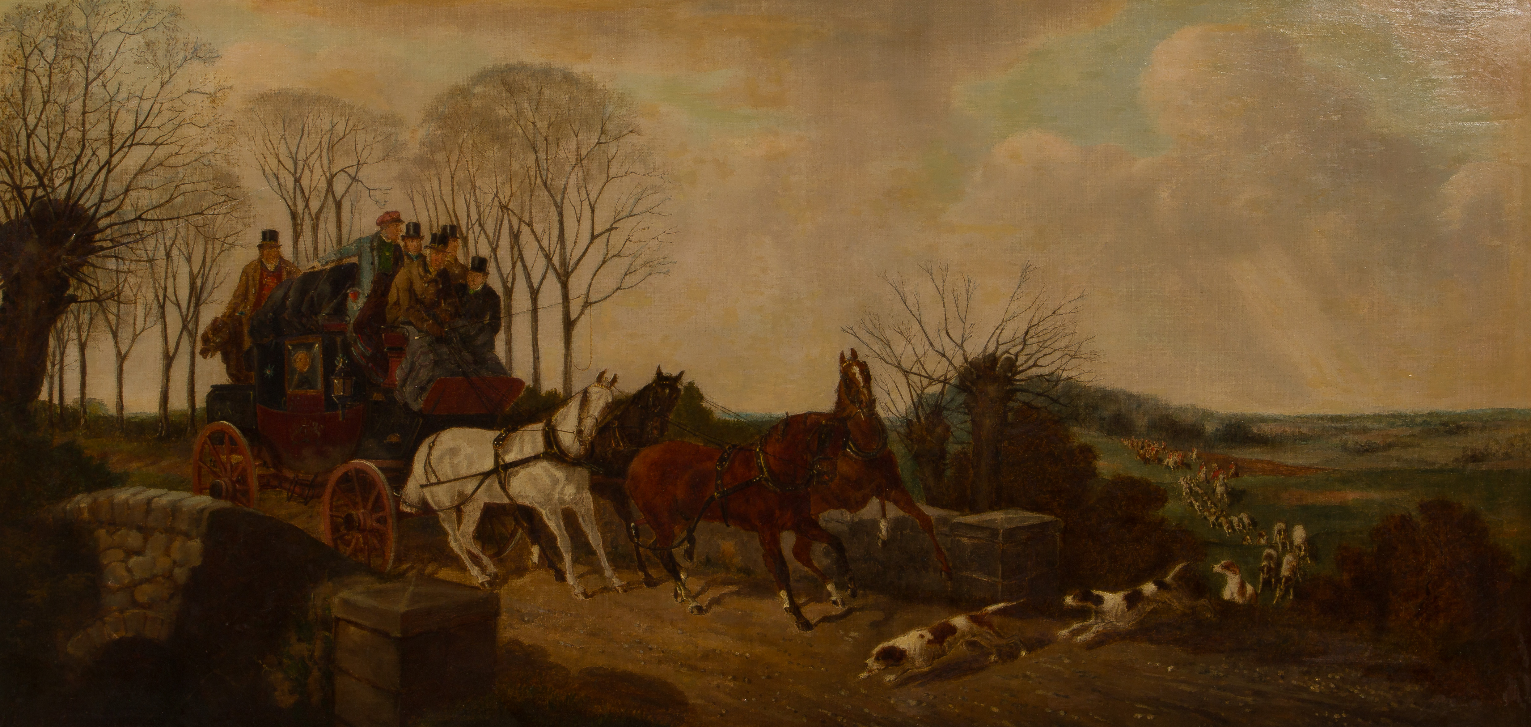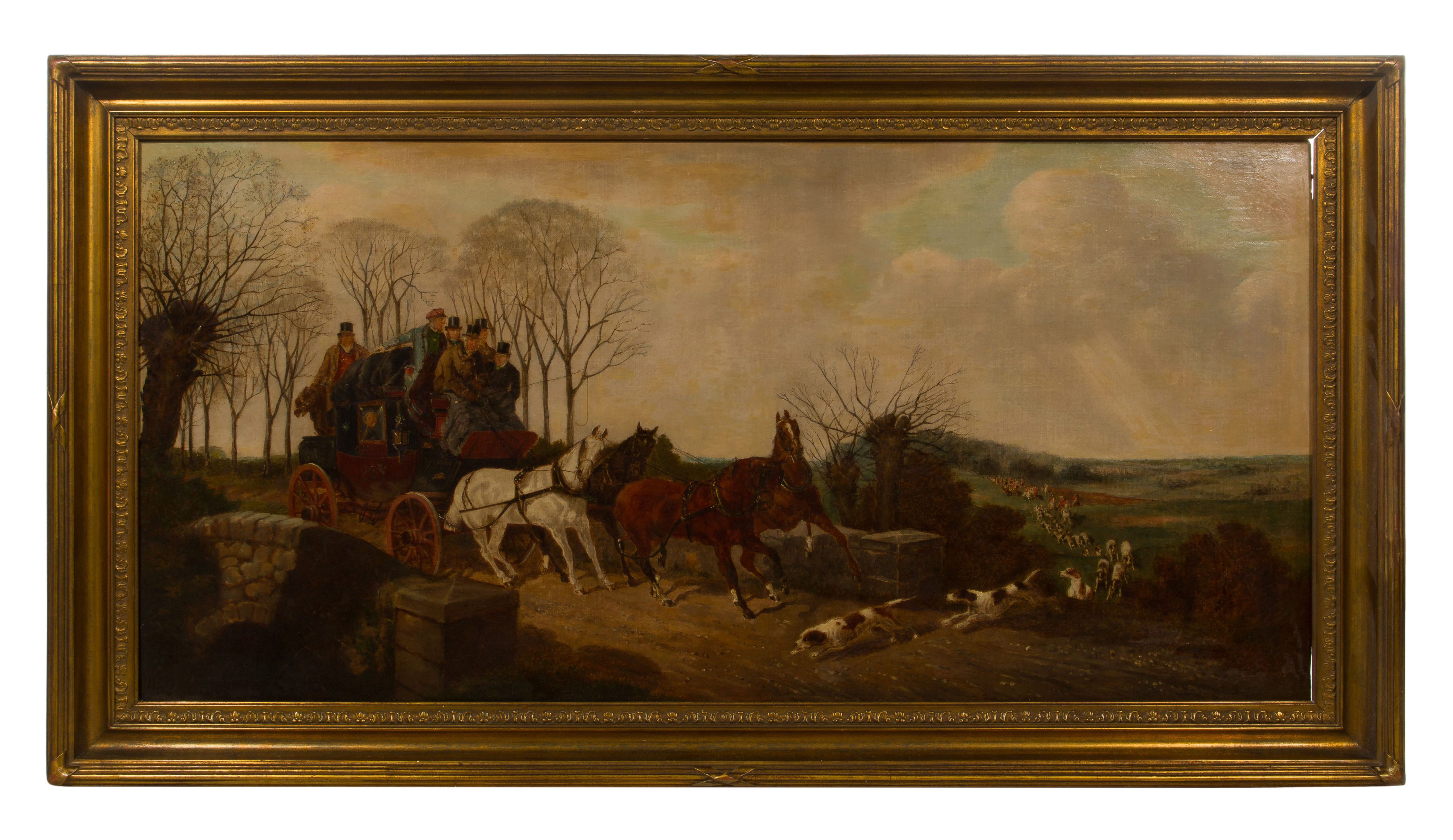 Undated and unsigned depiction of a coach full of gentlemen being delayed by the crossing of hounds at the lead of a hunting party, in a gold-tone carved wood frame retaining a Charles Daggett Gallery, London, label verso
