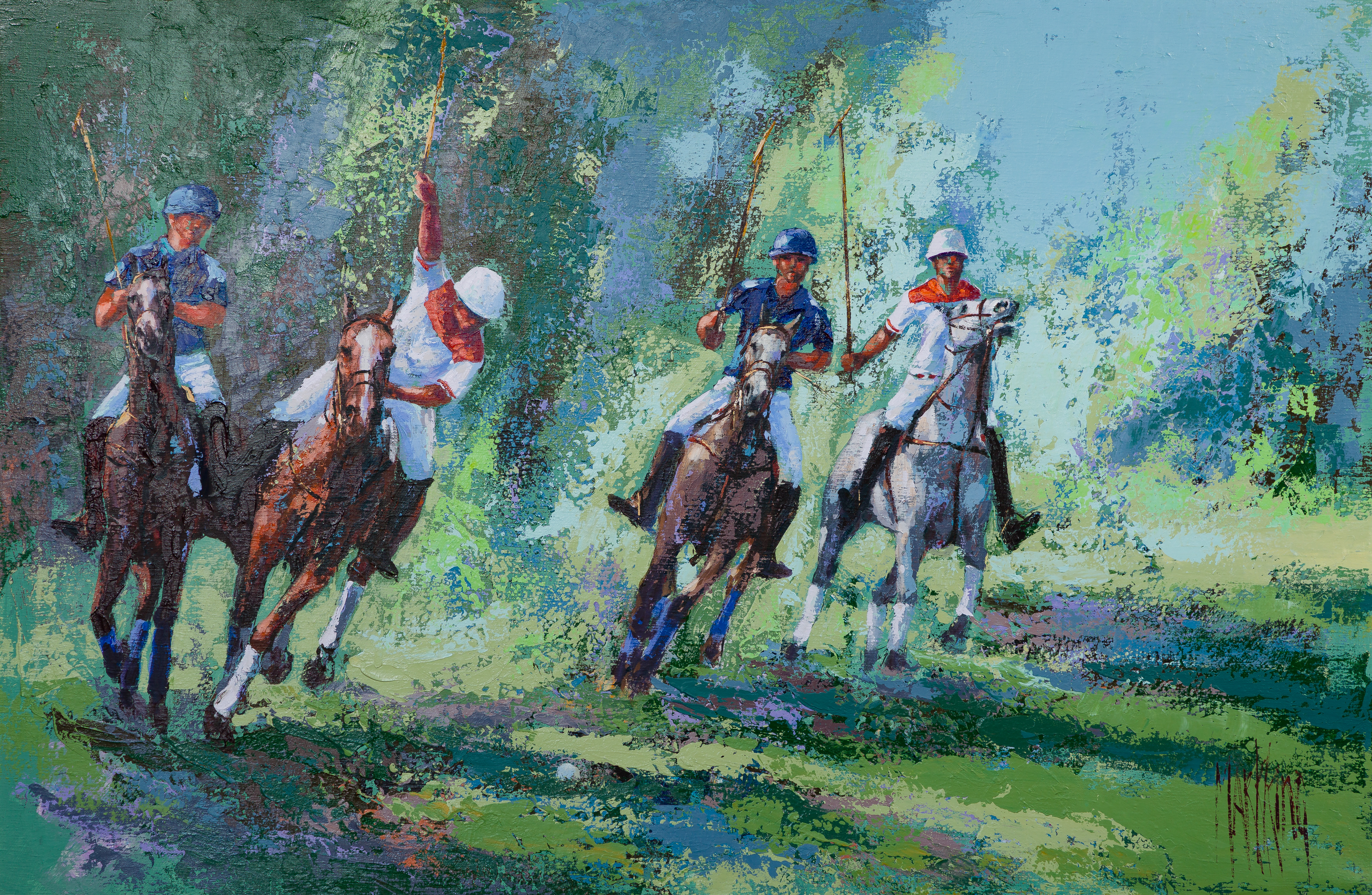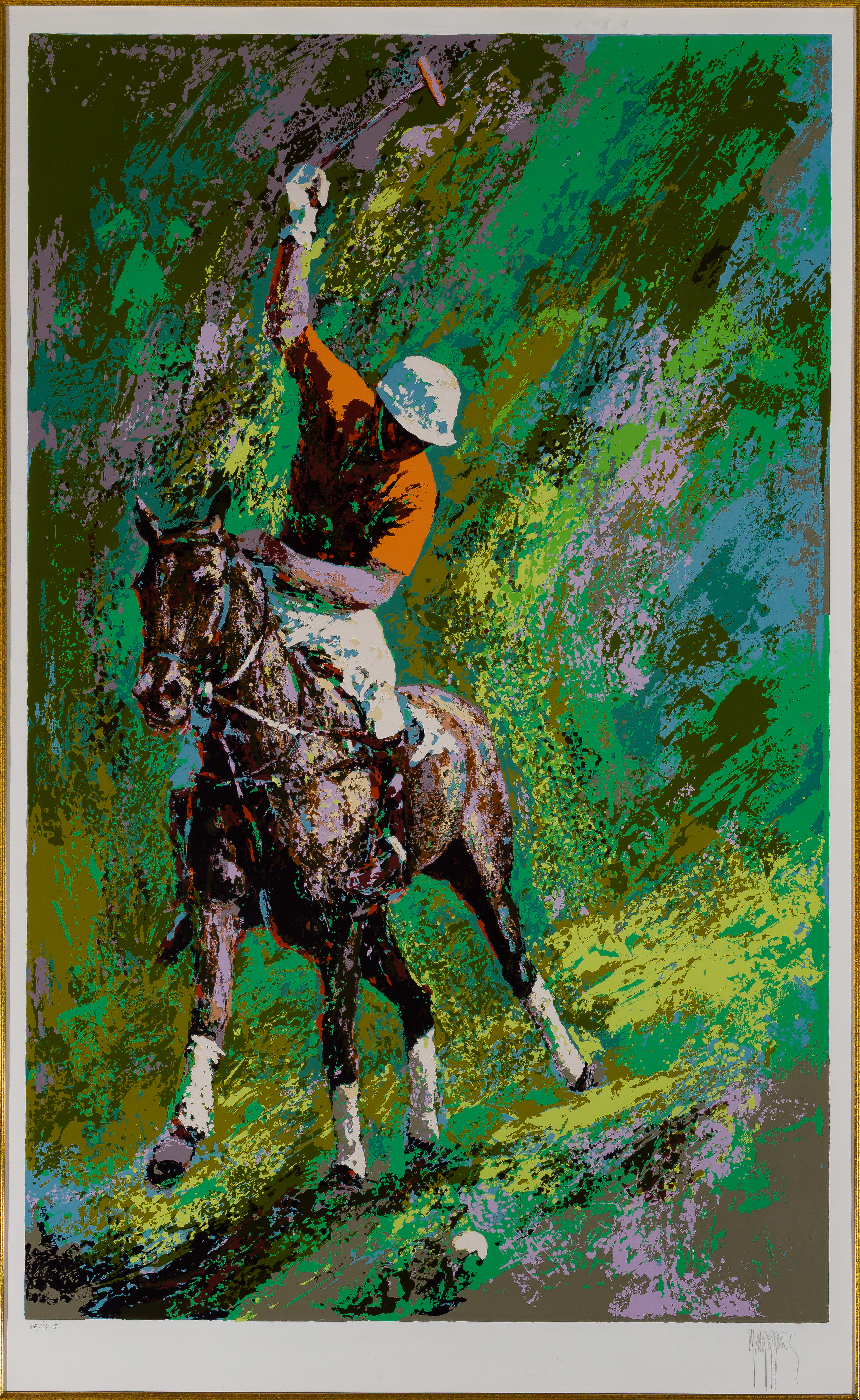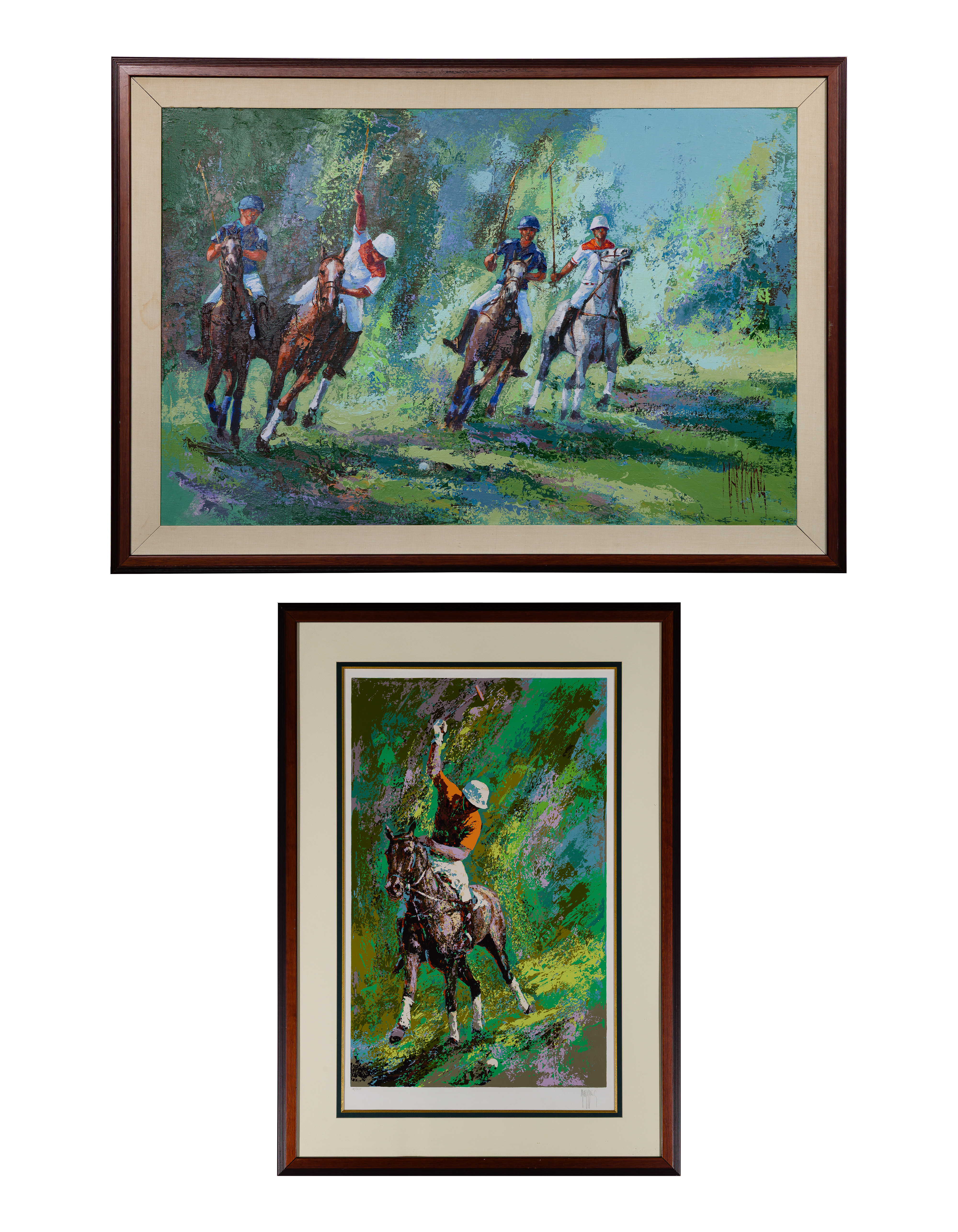 (2) undated items including a signed oil on canvas depicting a polo match, in a linen lined wood frame as well as ‘Polo’ serigraph, pencil signed, #64/325, depicting a polo player mid-swing, matted under glass in wood frame