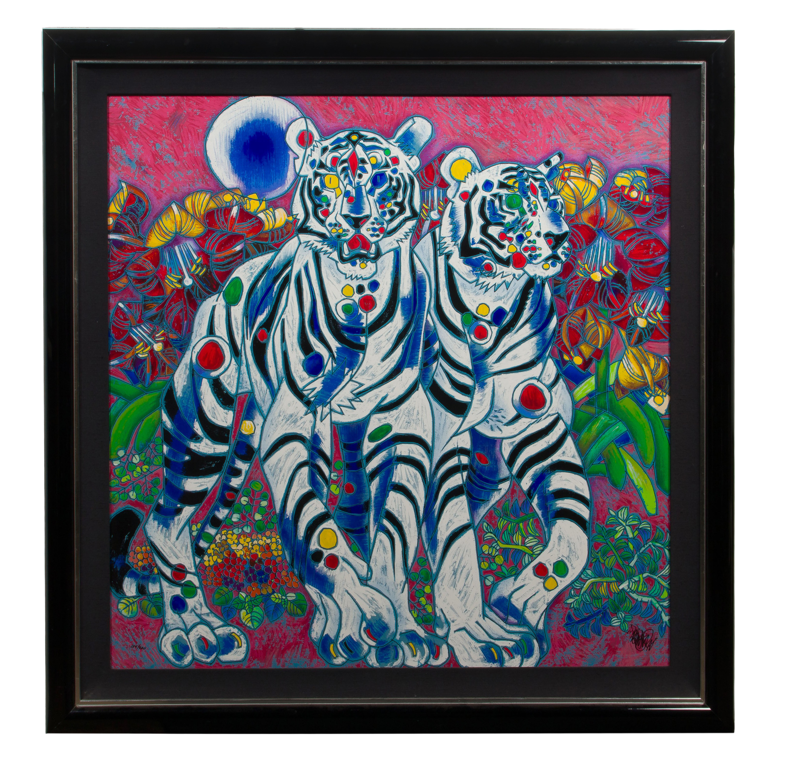 Undated, signed lower right, #134/300 lower left, depicting two white tigers, in a linen lined glossy black wood frame having silver-tone trim