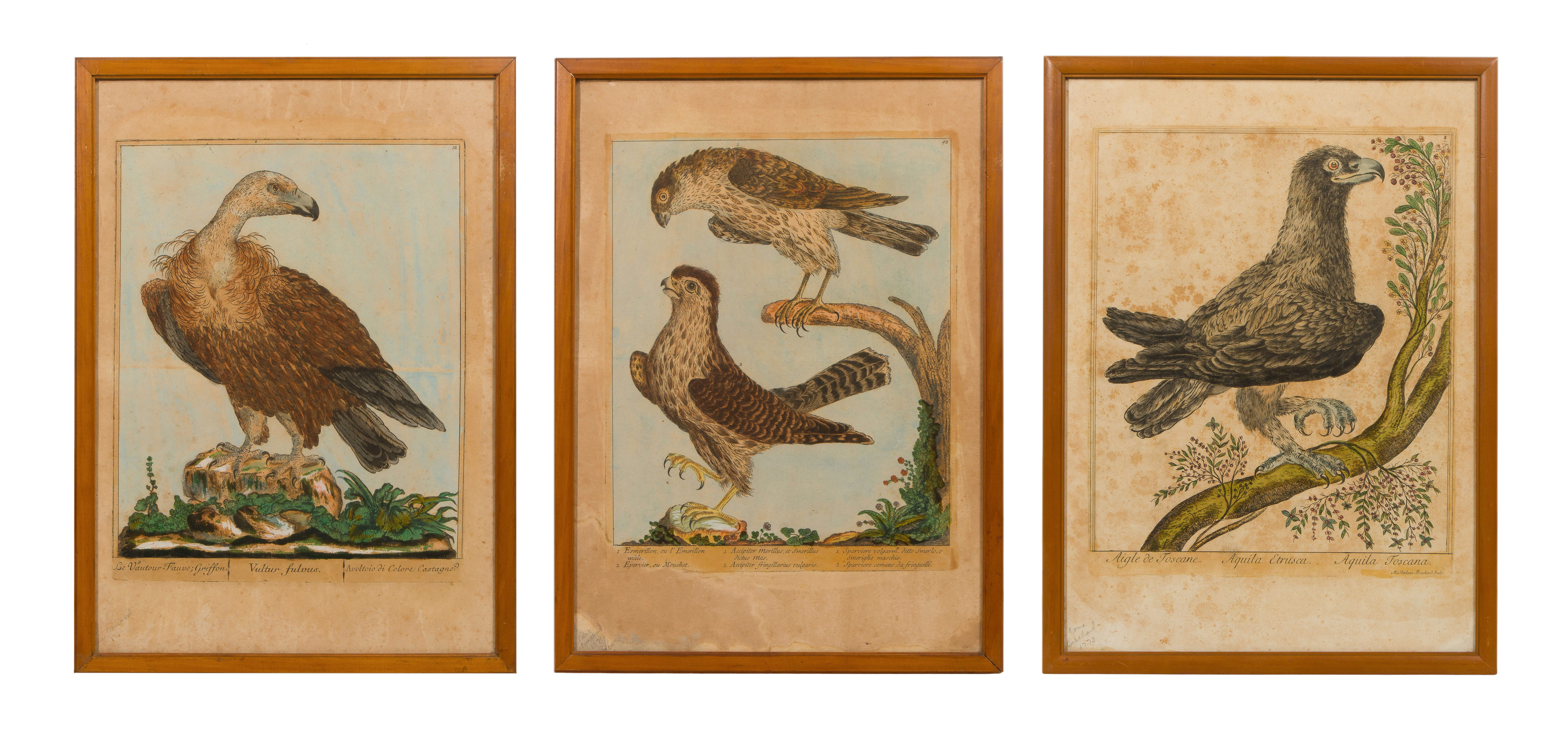 (3) items dating to 1775, pencil signed ‘Rome Bouchard’ in left corners, ornithological hand-colored plates, showcasing various bird species with titles in French, Latin and Italian, floated mounted under glass in wood frames