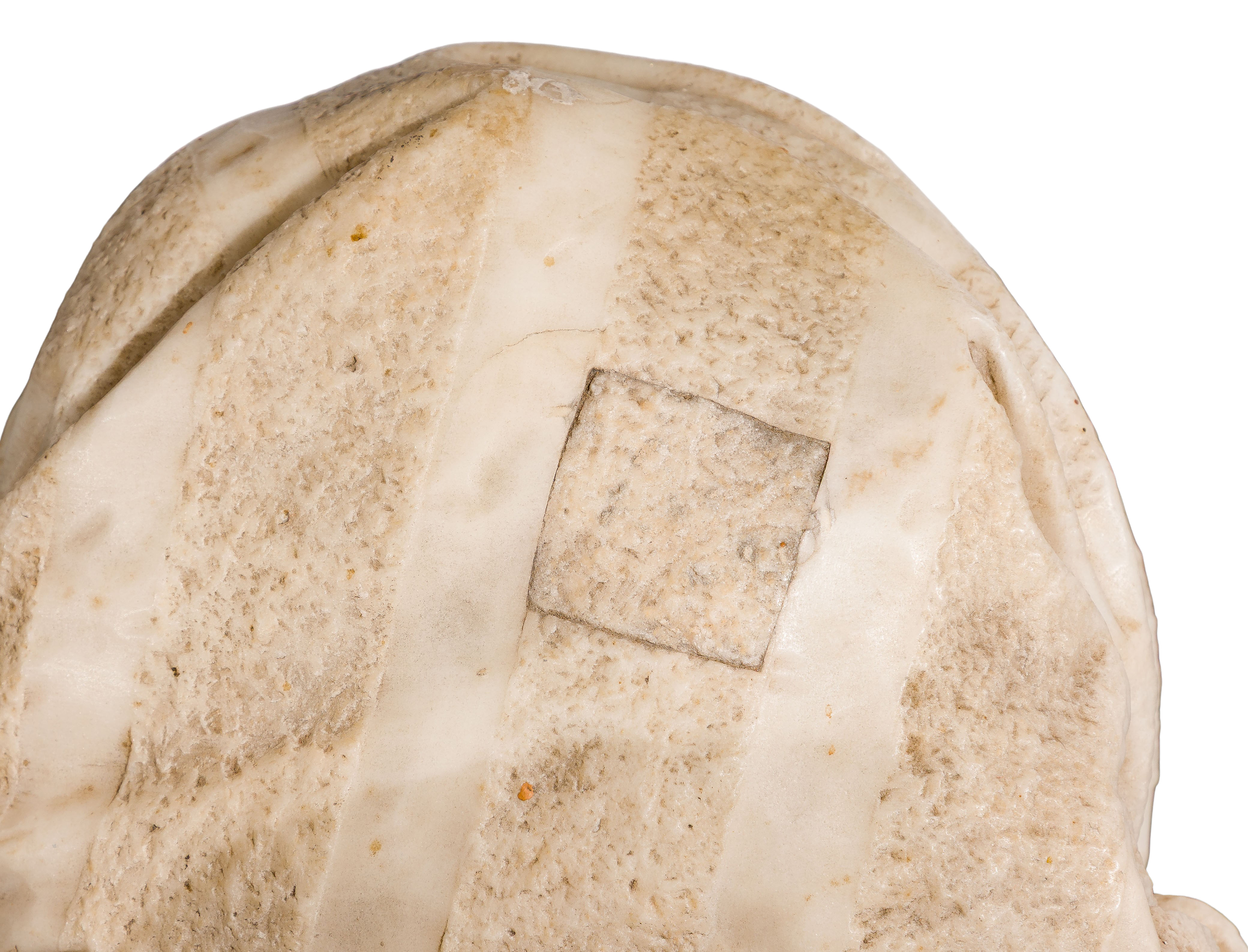 light wear, marble assembled from fitted pieces, a gap developing at joint, a square patch at back of head covering attachment bolt for bronze face as part of process