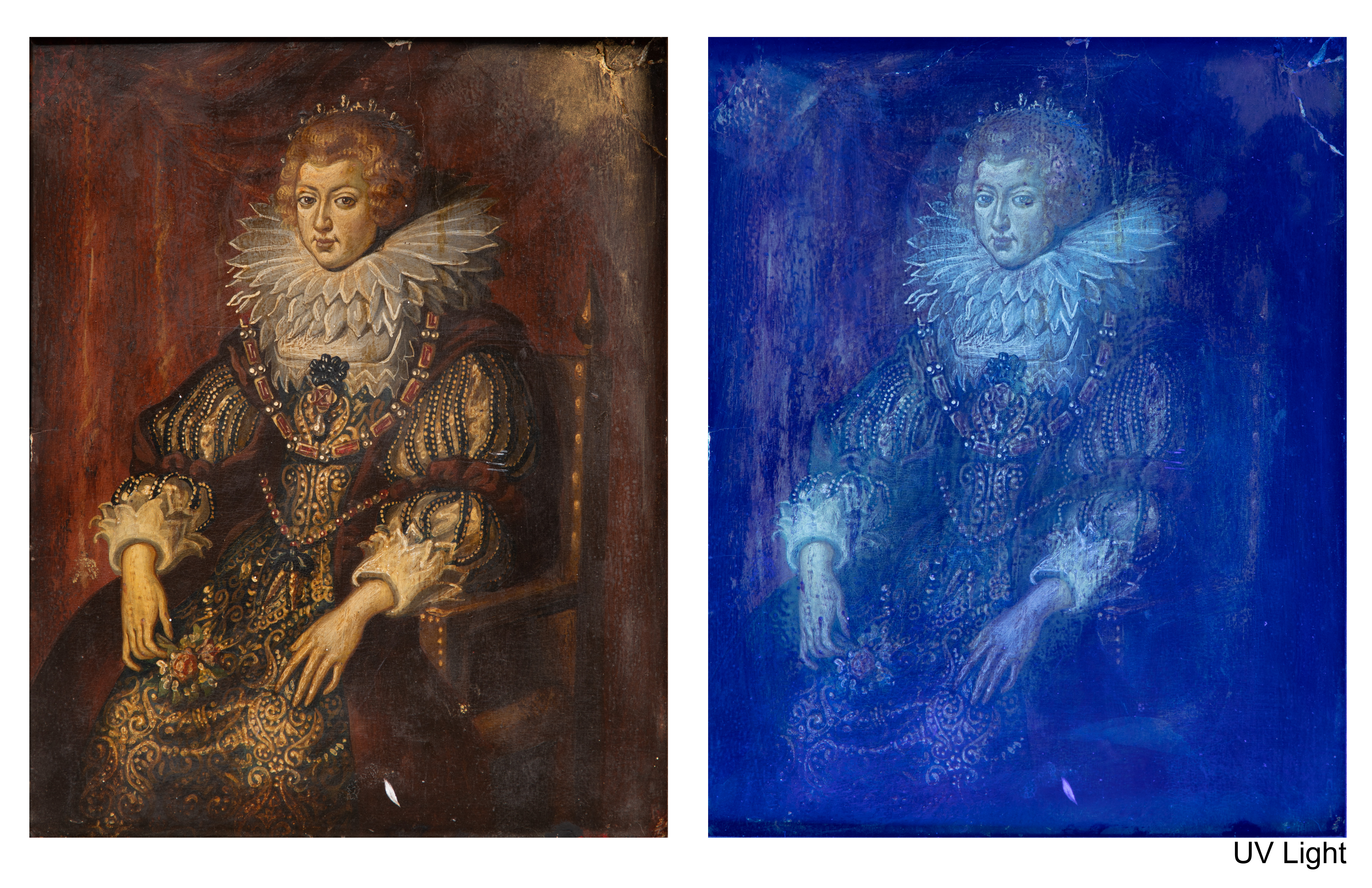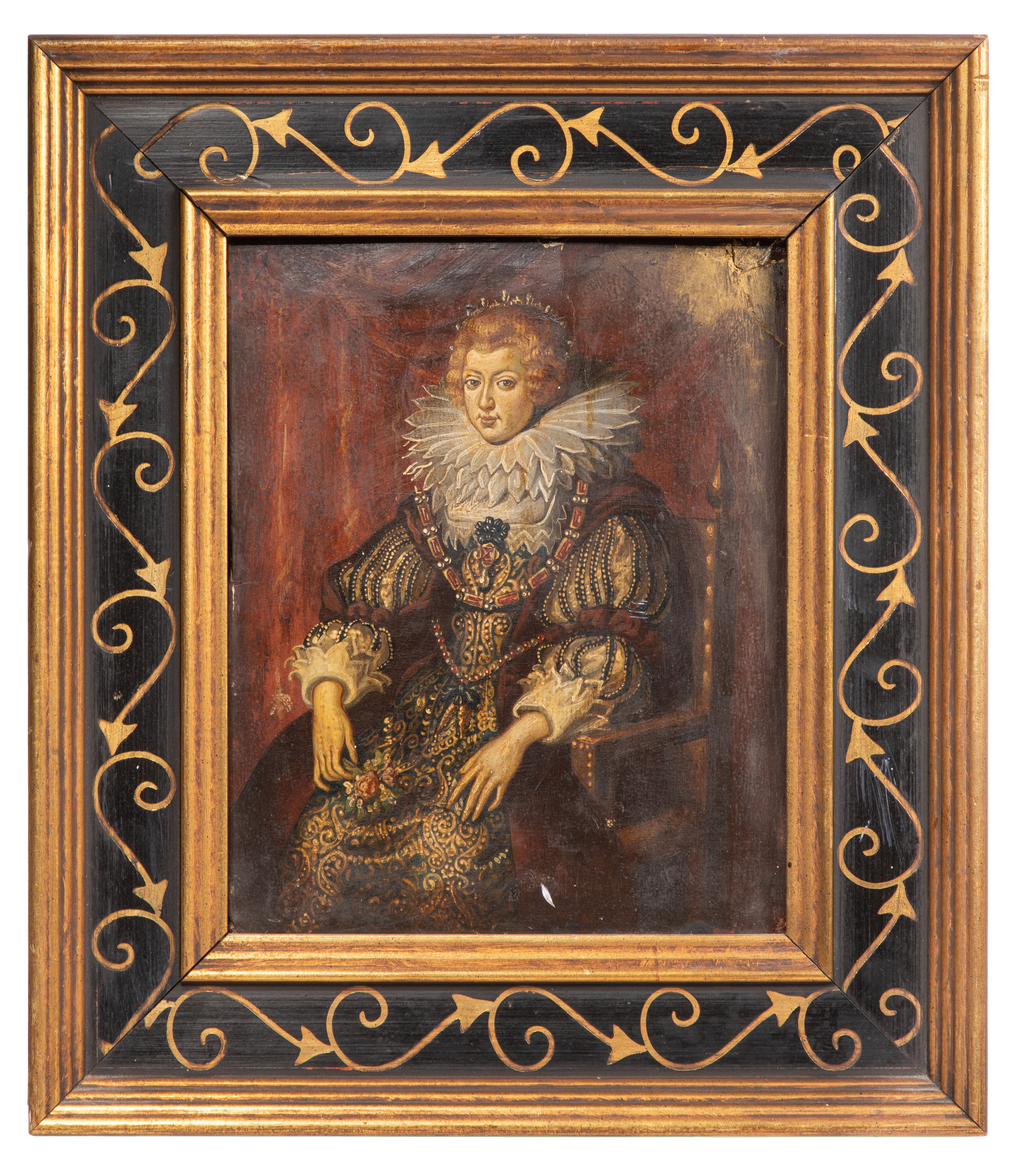Undated, unsigned, portrait showing Queen Anne wearing a Medici collar, jeweled crown and a dress embroidered with fleur-de-lis, in a painted gold-tone and black frame