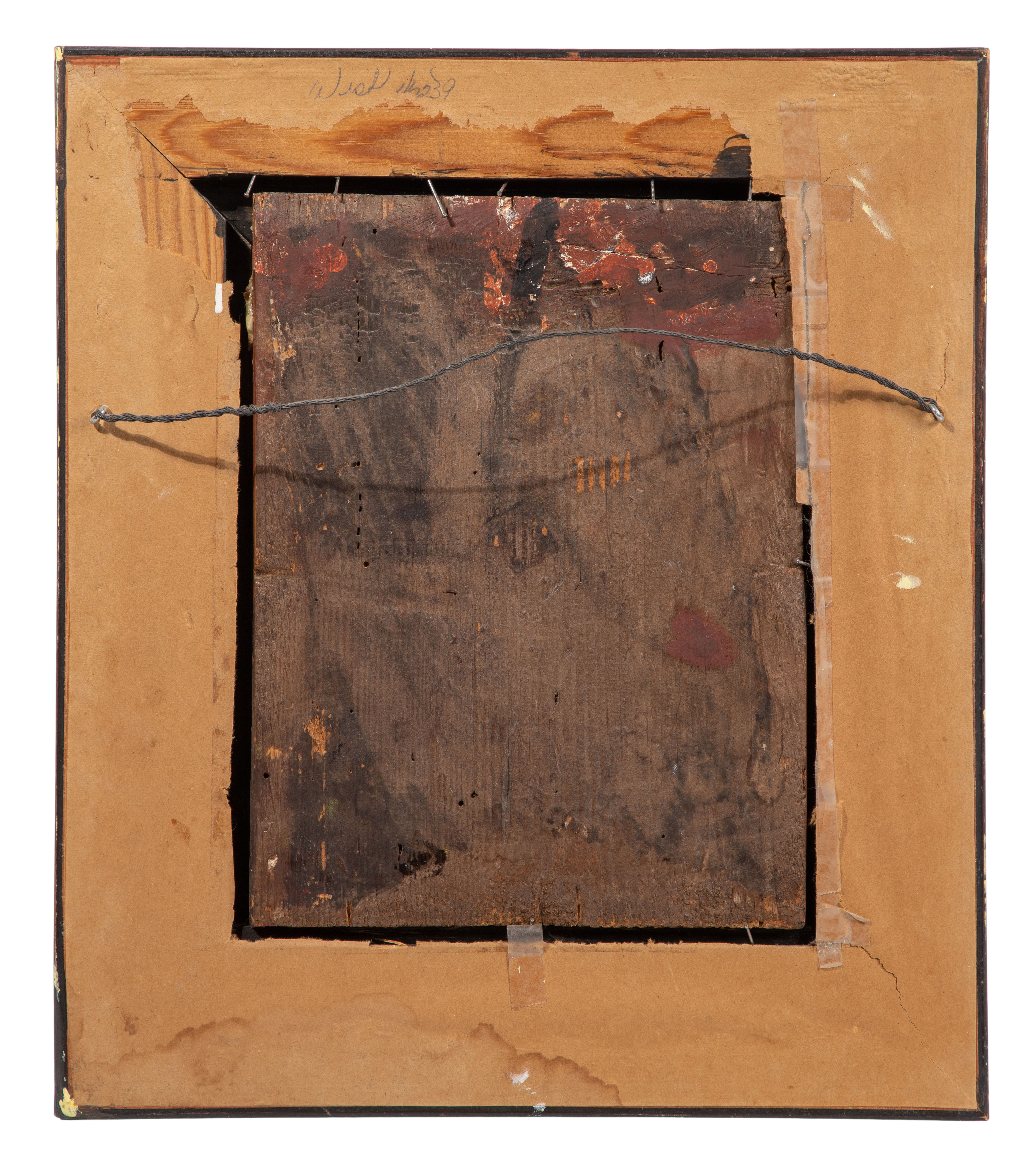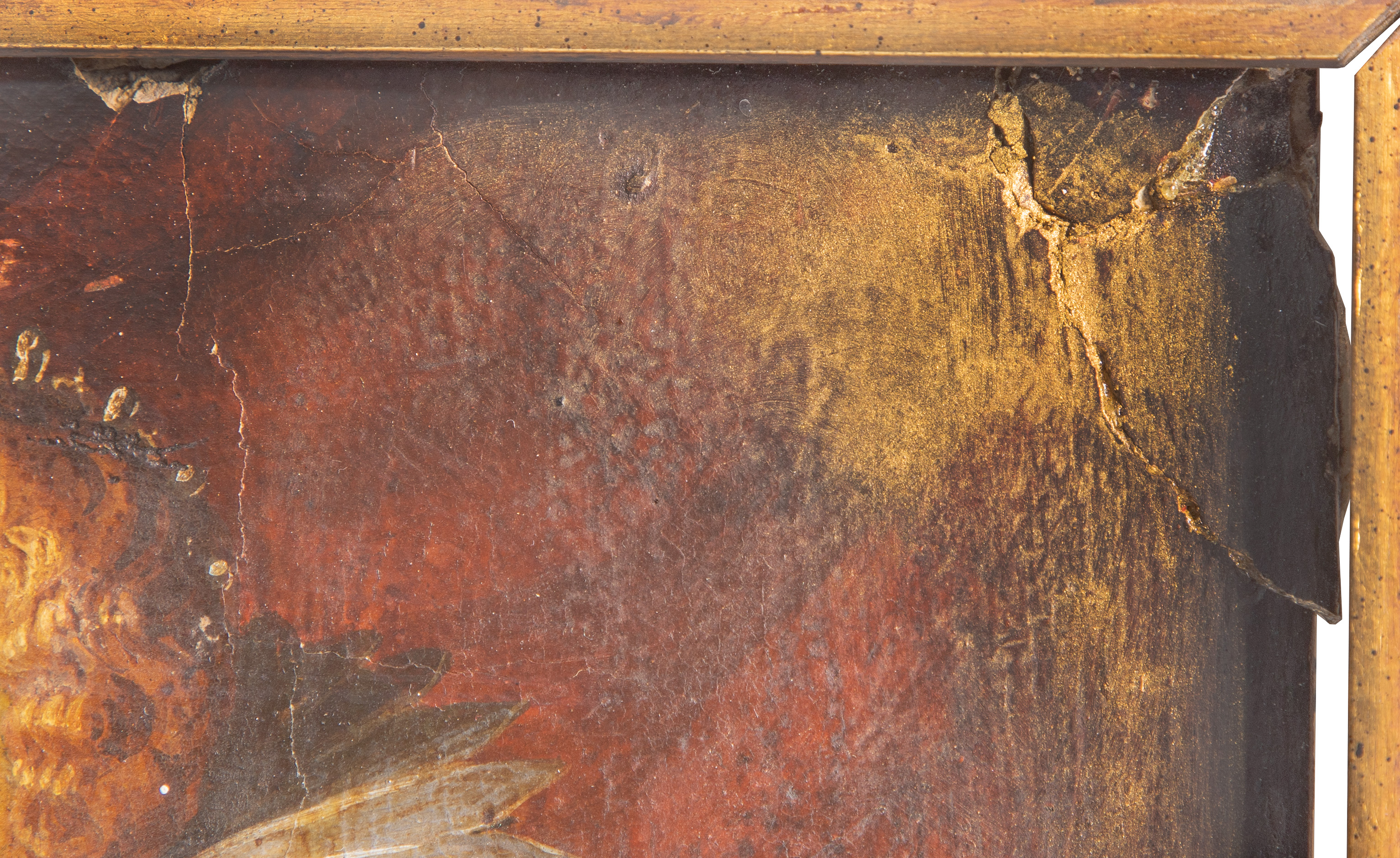 Condition: upper right corner having damage including cracks, missing wood and paint, an area of cracks on center top edge, a dent lower center, inpainting, lower right corner damaged, loose in frame, frame having wear