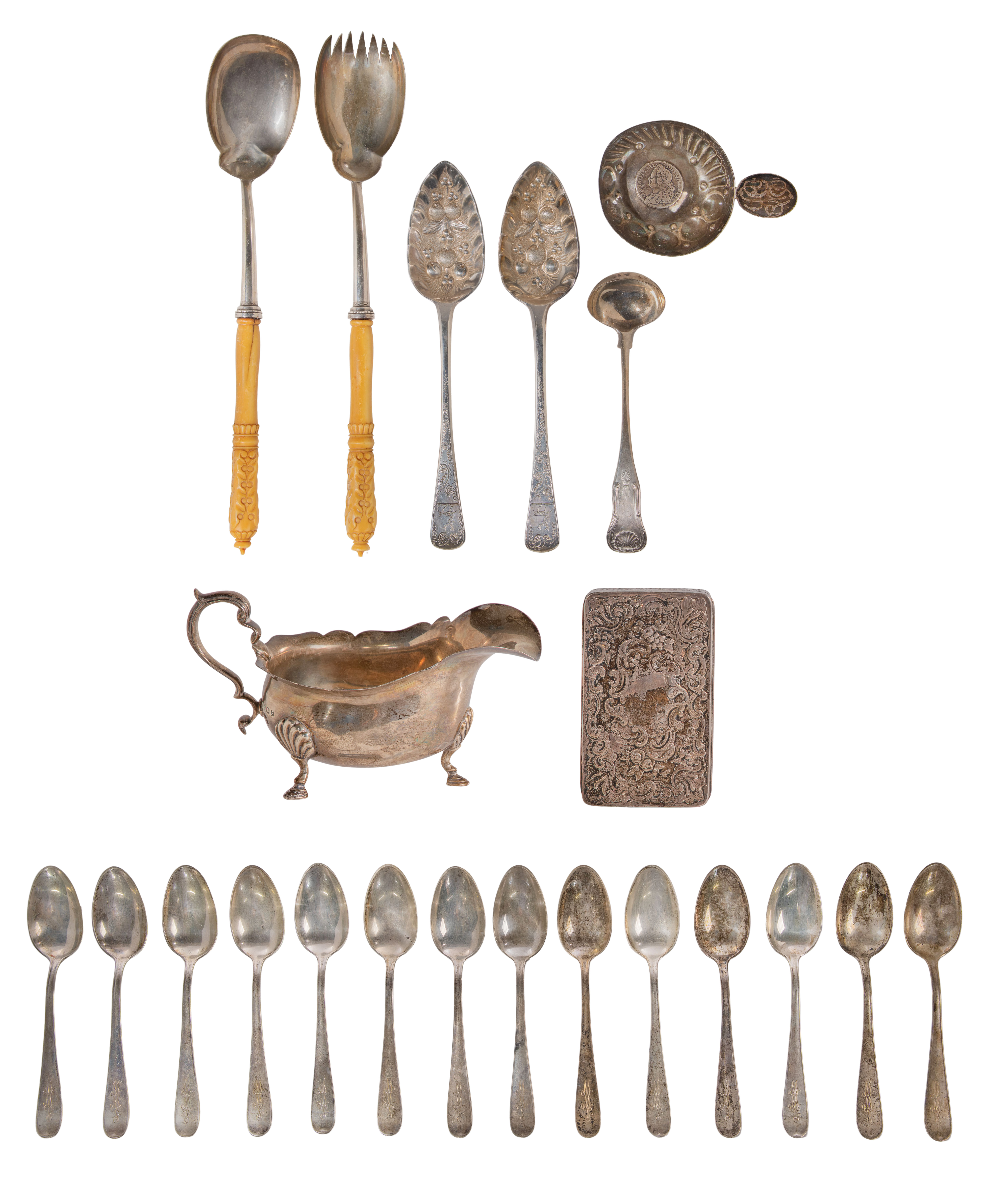 (22) total items including a gravy boat, (14) teaspoons, a wine tasting cup, a trinket box, a fruit motif spoon set, a small ladle and a carved resin handle salad set (most having lion passant mark)