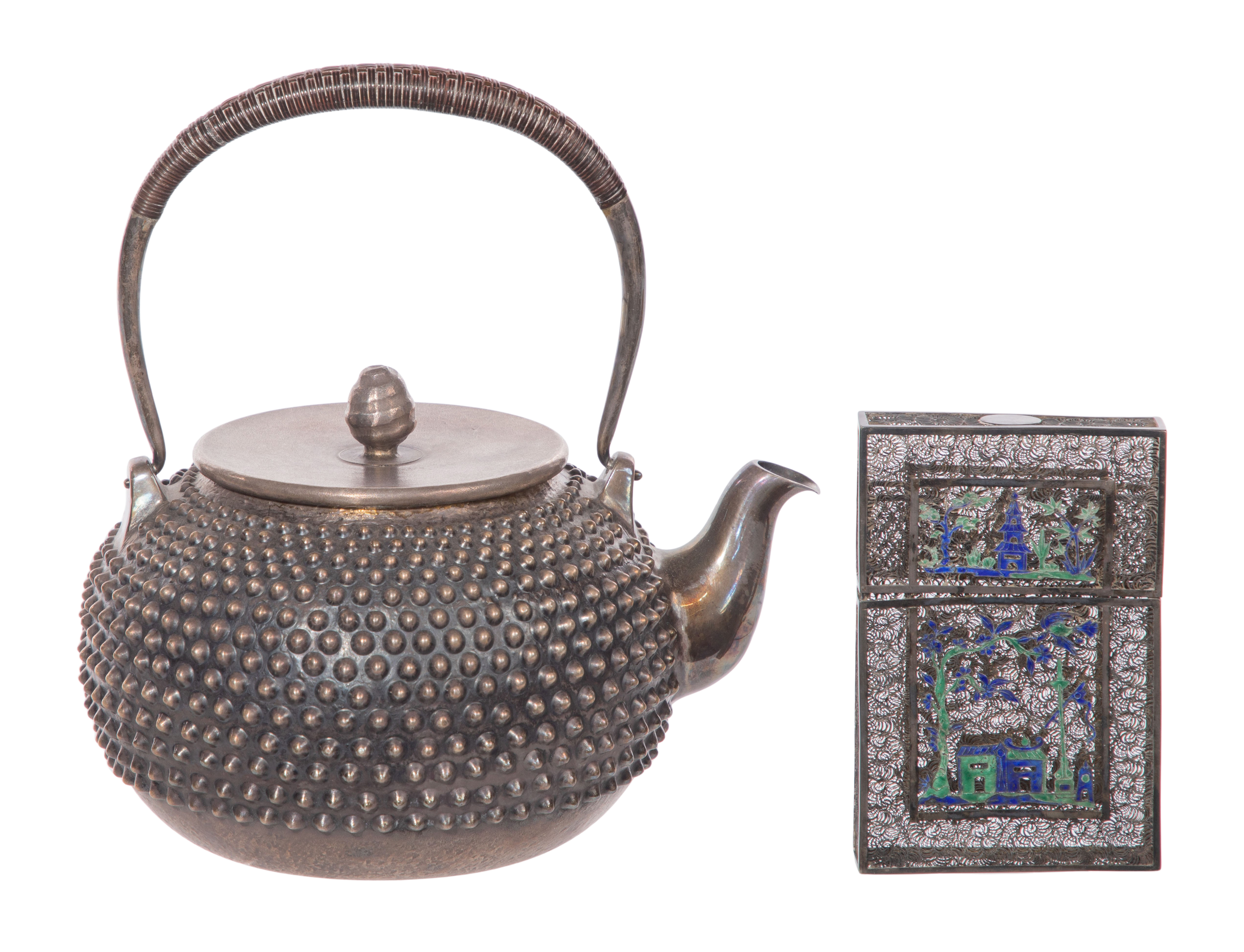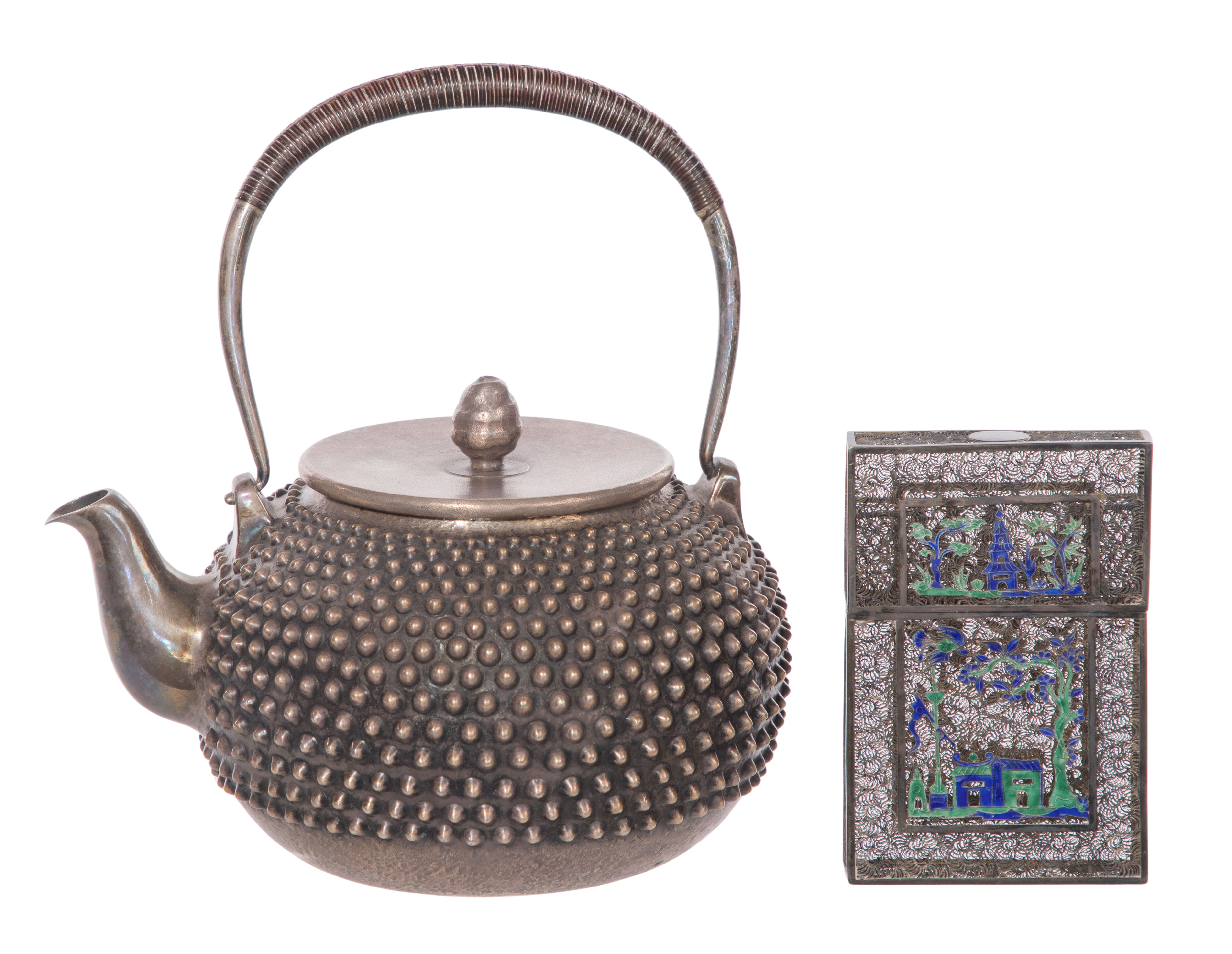 (2) total items including a hobnail pattern Tetsubin teapot (marked having a fine silver Japanese hallmark); together with a silver and enamel filigree card case (unmarked silver)