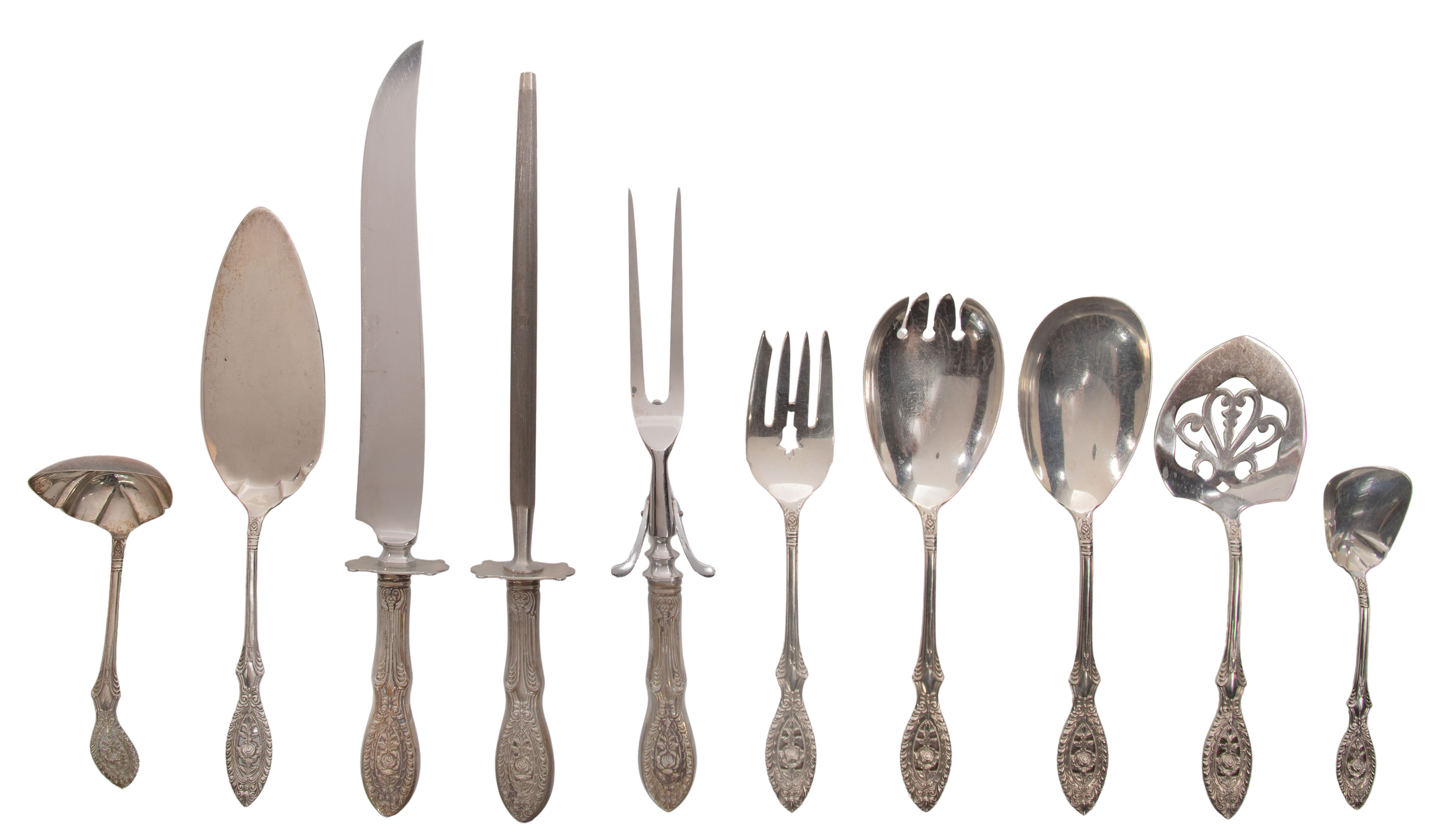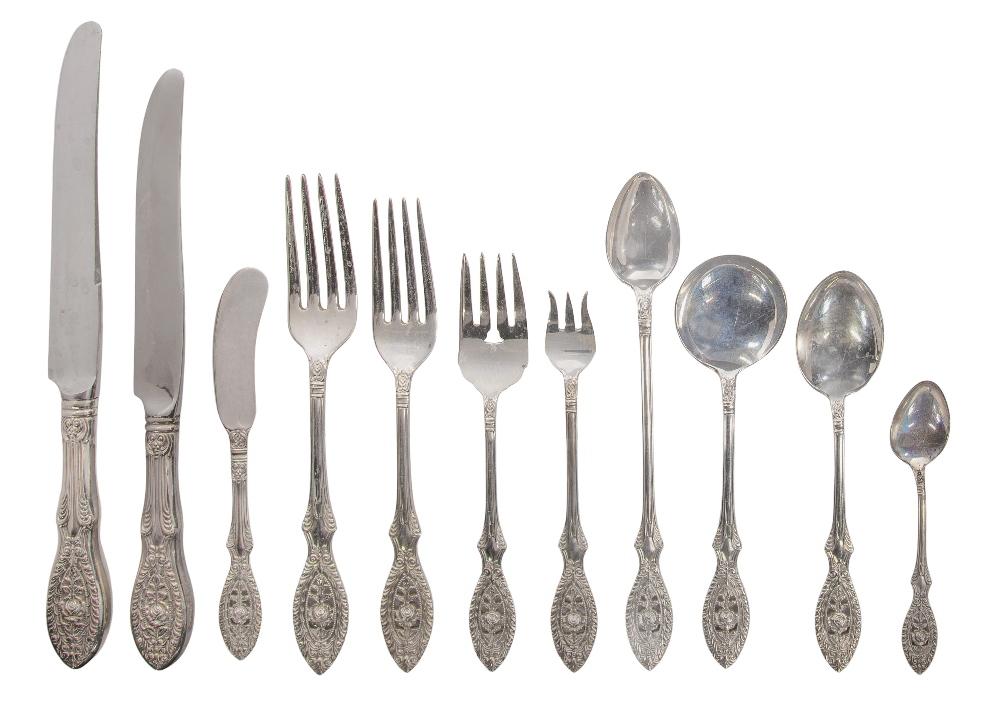 (165) items including (12) 9 3/8-inch dinner knives, (12) 8 3/4-inch luncheon knives, (12) 5 3/4-inch solid butter knives, (12) 7 3/8-inch dinner forks, (11) 6 1/4-inch luncheon forks, (12) 7-inch pastry / dessert forks, (12) 5 5/8-inch cocktail forks, (24) 5 7/8-inch teaspoons, (24) 4 3/8-inch demitasse spoons, (12) 6 1/8-inch round soup spoons, (12) 7 3/8-inch iced tea spoons and (10) serving utensils (marked ‘sterling’ and cross with crown)
