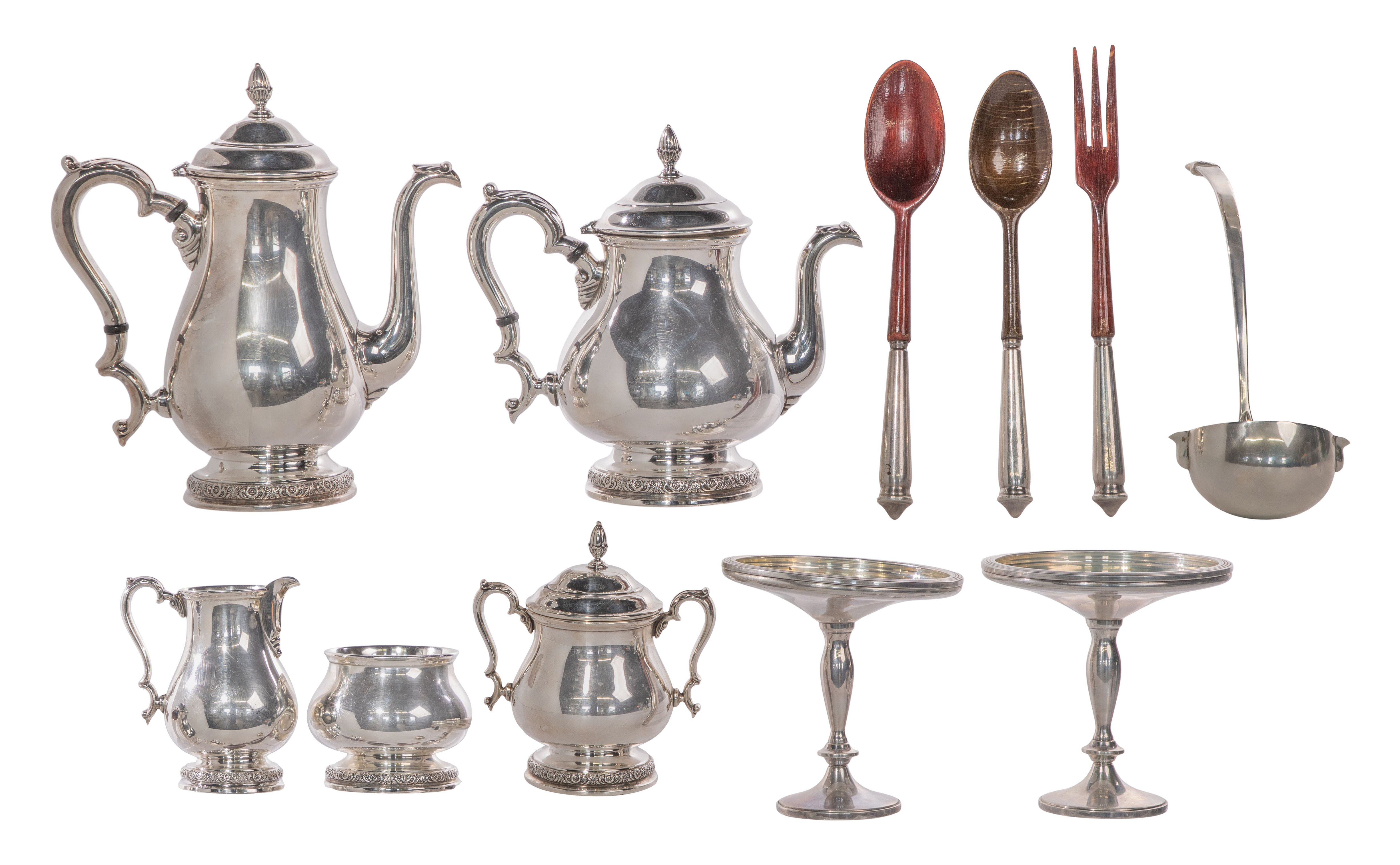 (11) pieces including a (5)-piece tea service having a teapot, coffee pot, sugar, creamer and waste bowl, (2) compotes and (4) serving utensils (all marked ‘sterling’ / ‘925’)