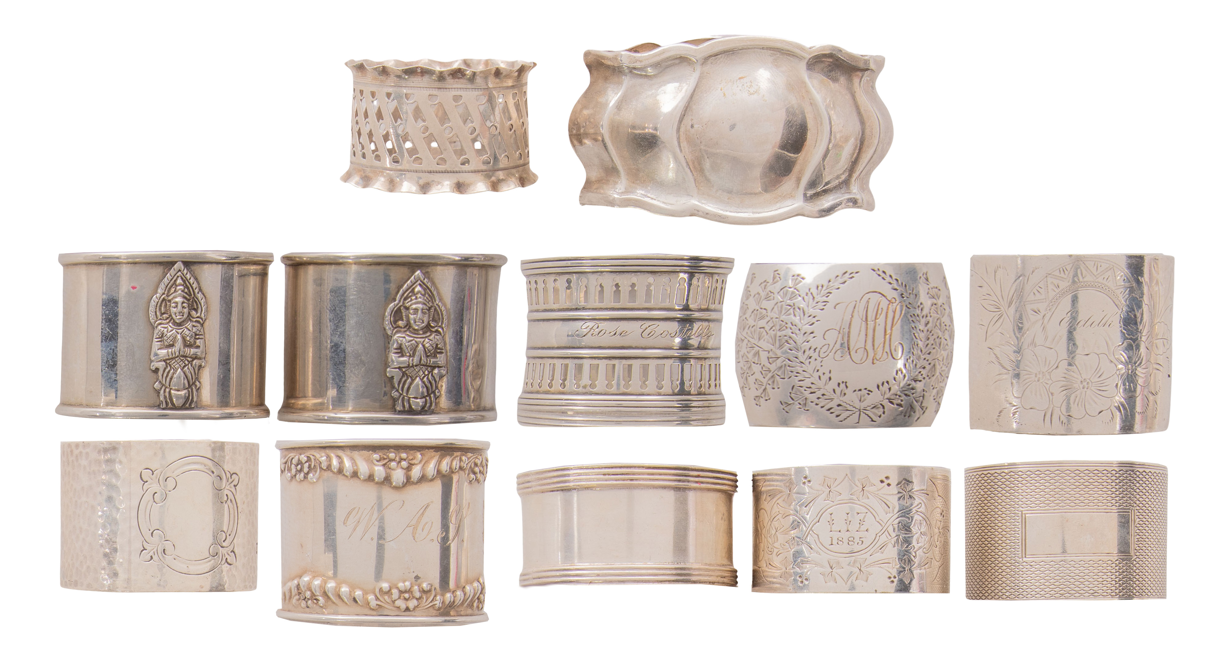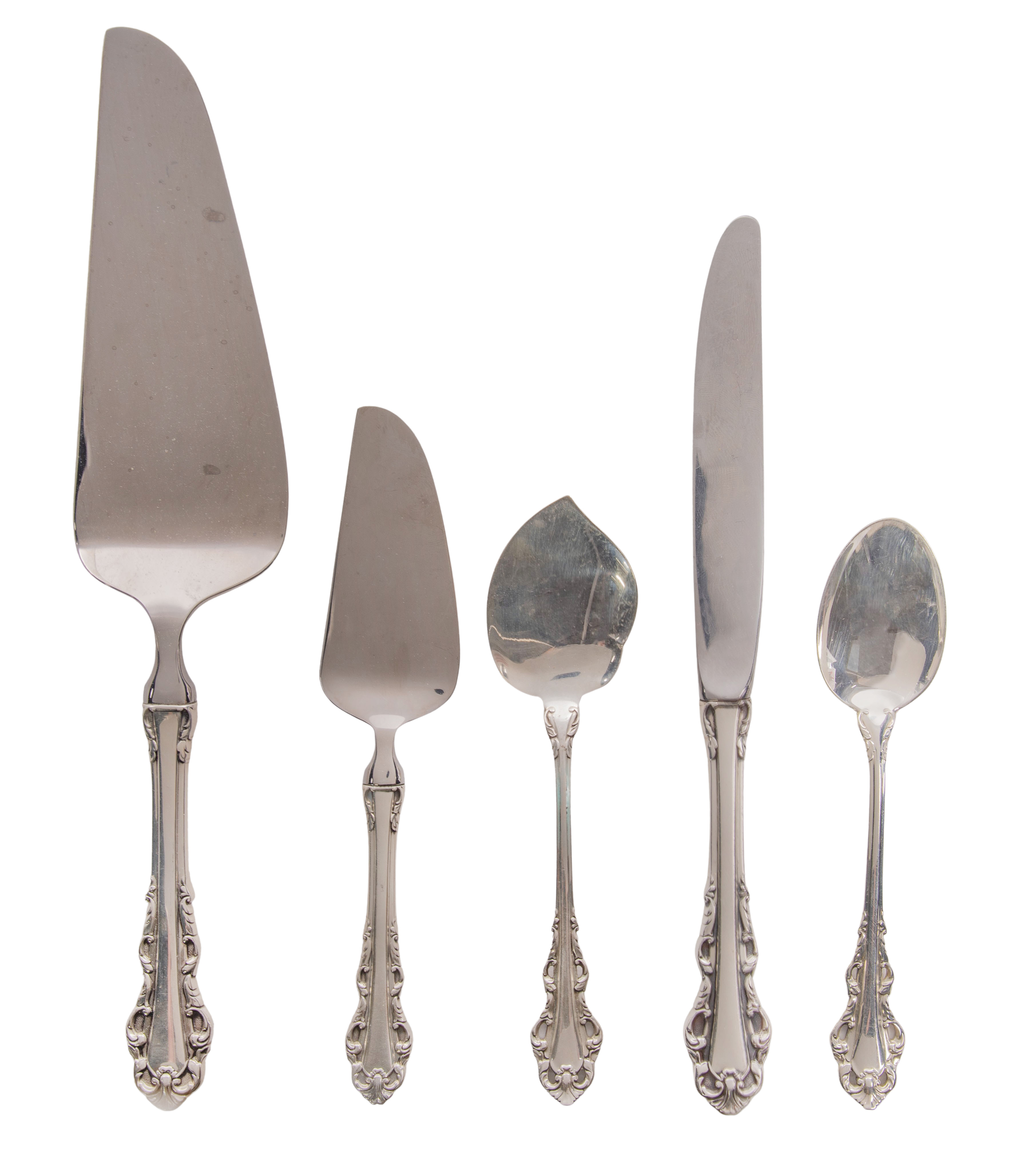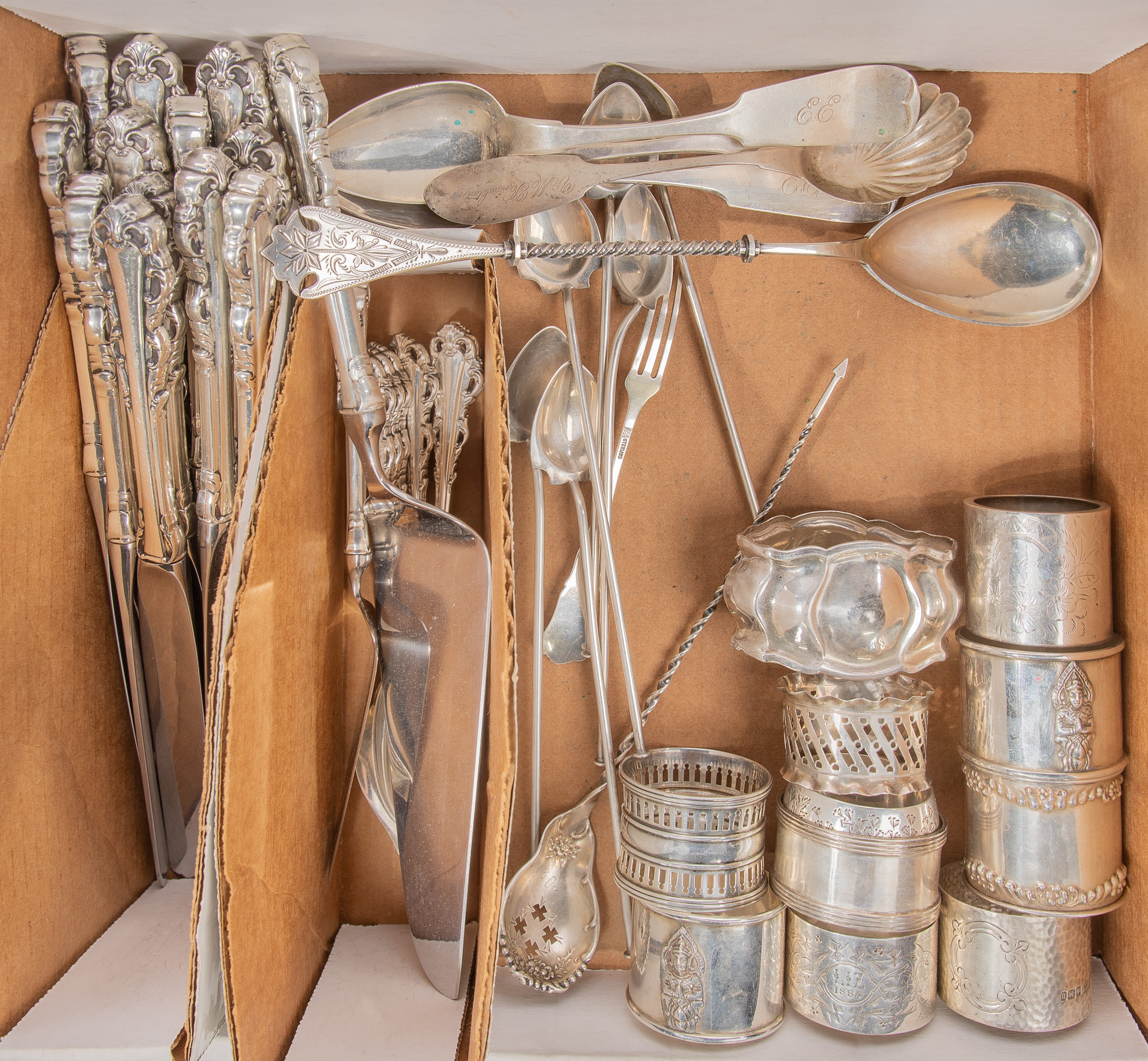 (46) items including Lunt Dresden pattern (12) 9-inch dinner knives, (6) 6-inch teaspoons, (3) serving utensils, various other pieces of table utensils as well as (12) various shape and sized napkin rings (most marked ‘sterling’)