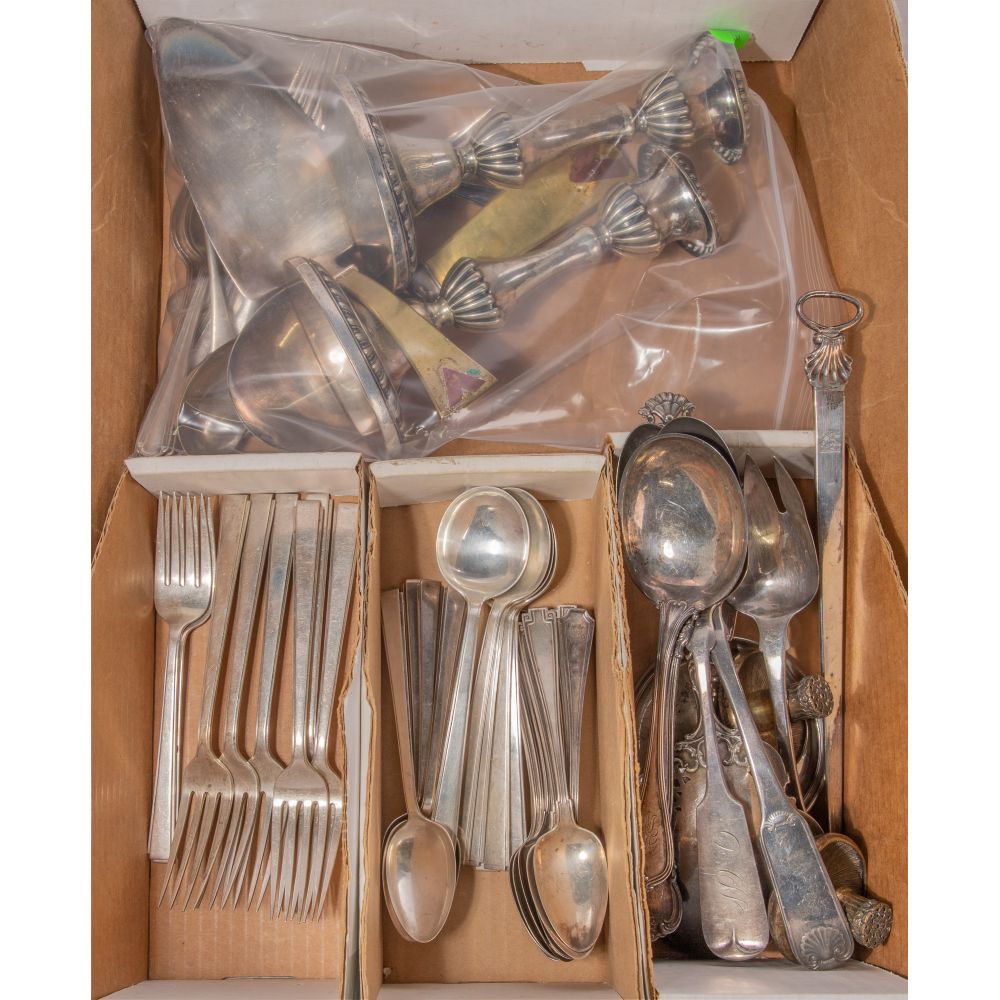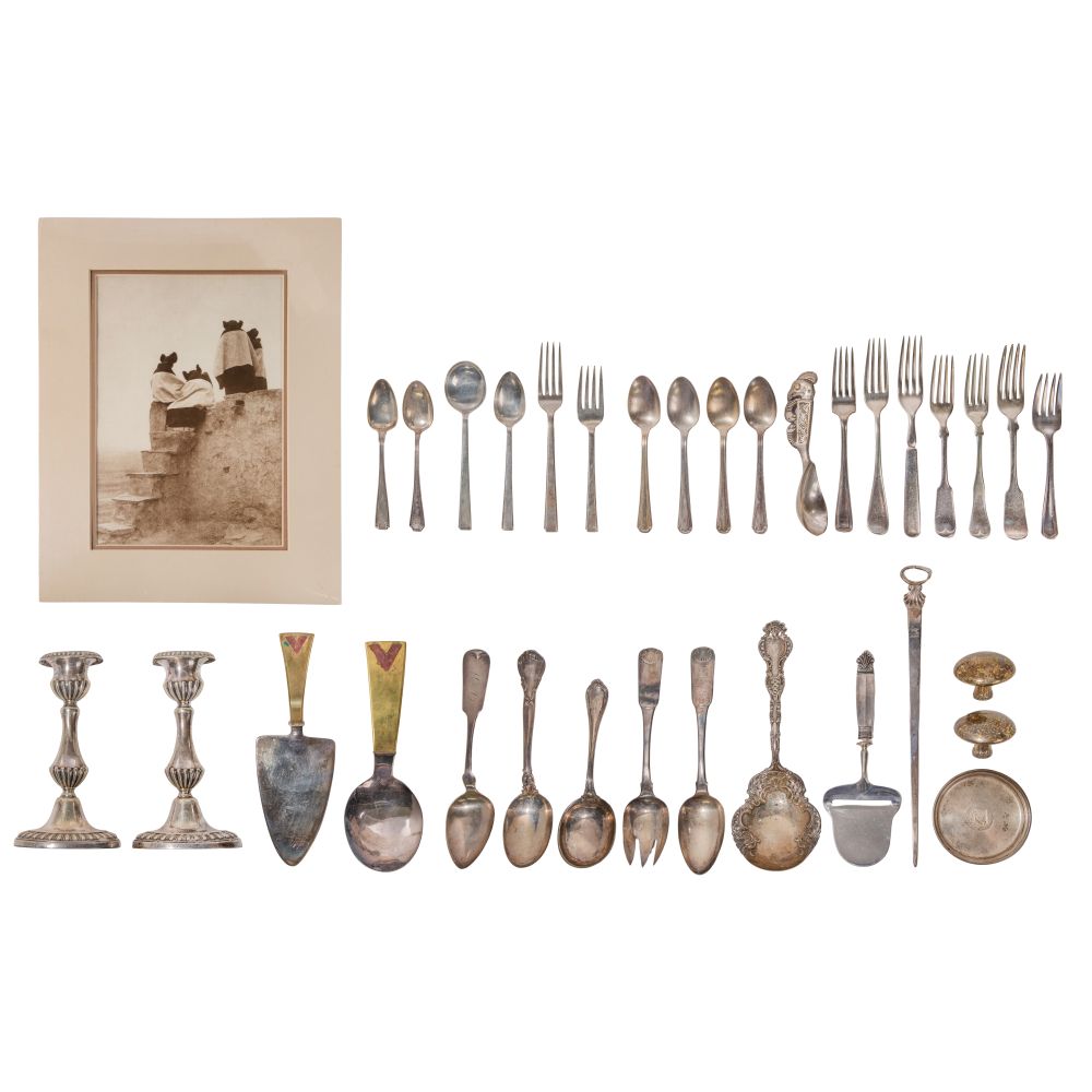 Including forks, spoons and serving pieces from Gorham, Ensko and Rogers, Lunt and Bowden (all marked ‘sterling’ or lion passant); together with a silver-plate assortment including forks, spoons, serving pieces and candlesticks as well as ‘Watching the Dancers’ matted offset lithograph