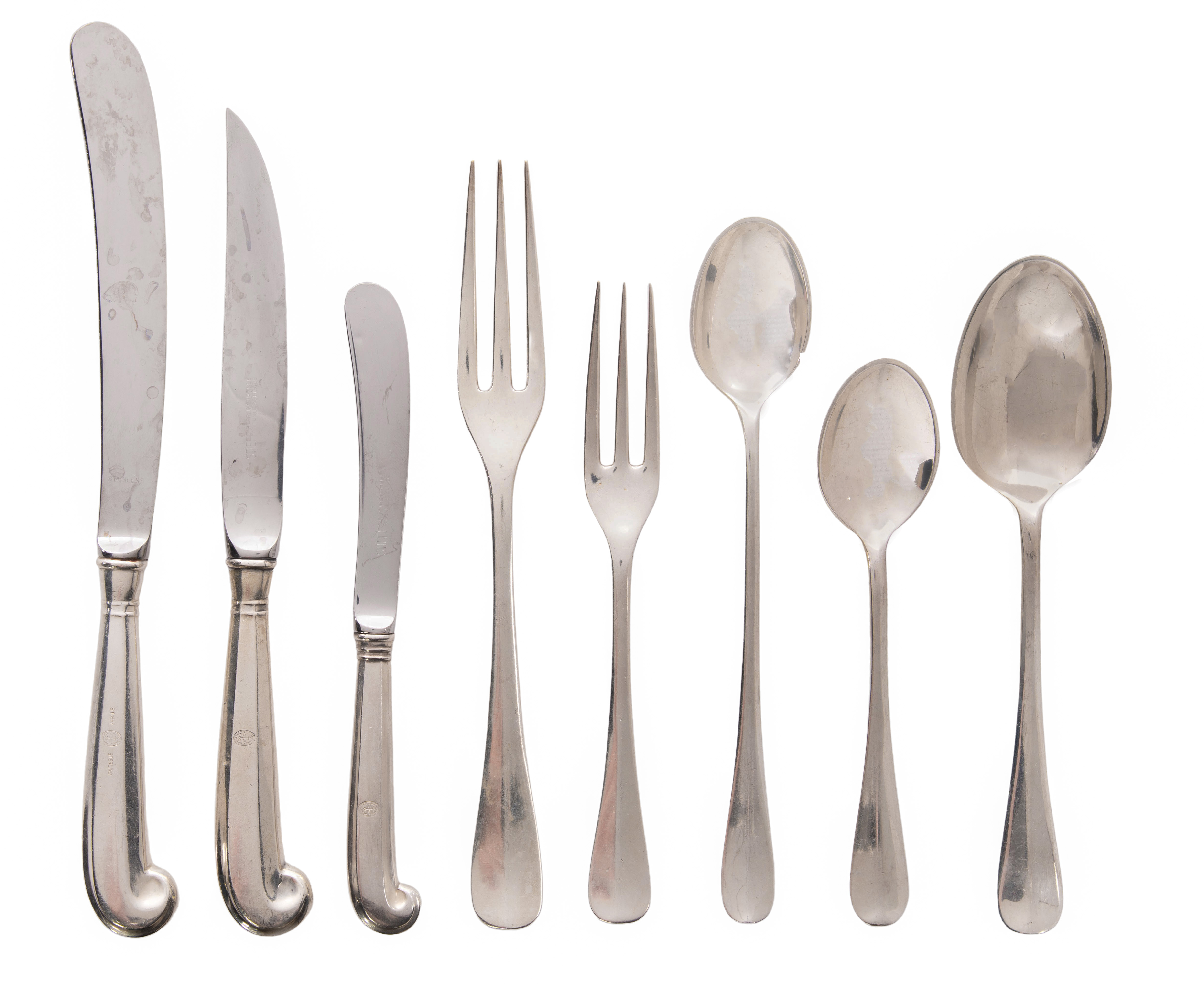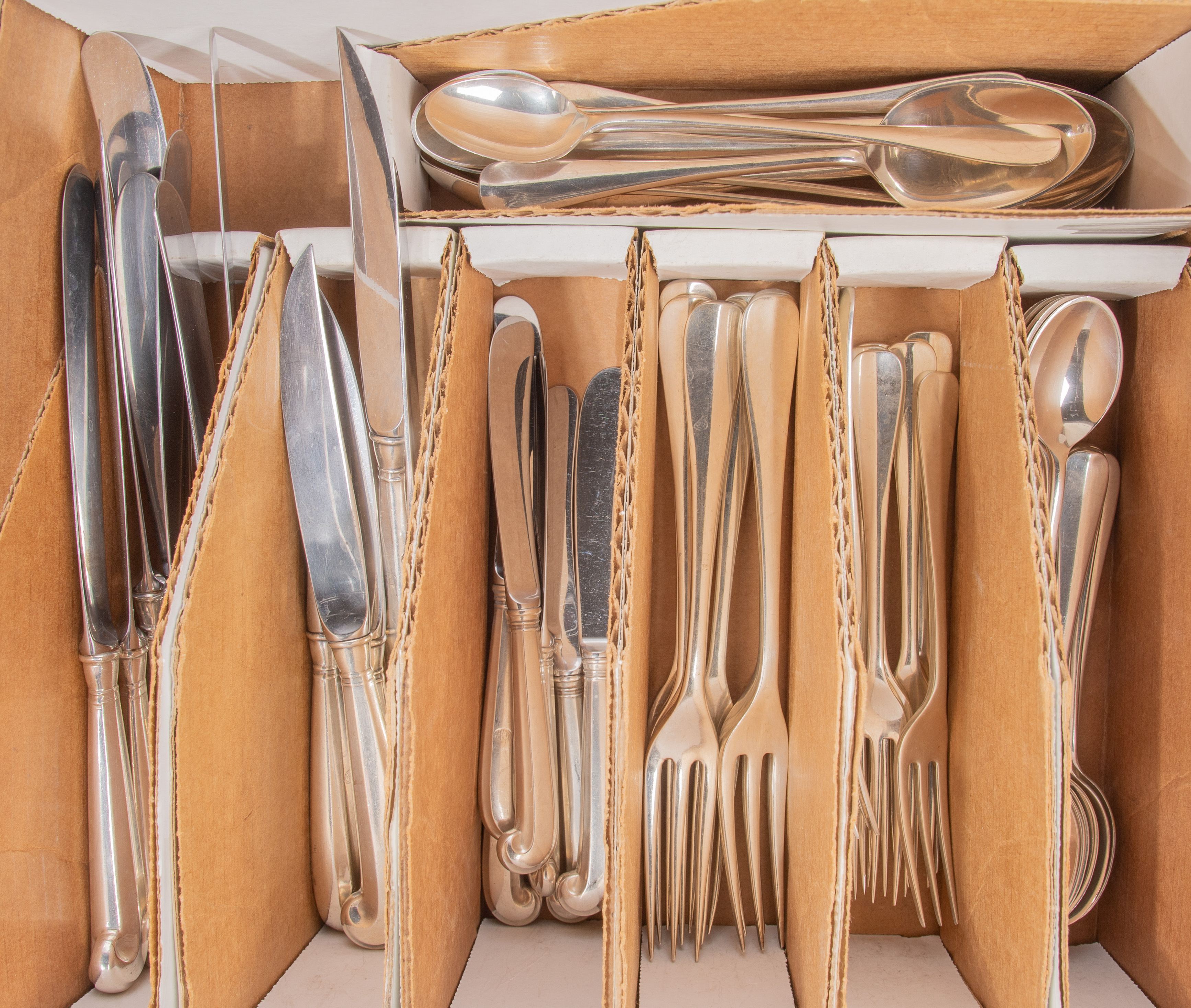 (65) items including (9) 9 1/4-inch dinner knives, (5) 8 1/4-inch modern dinner knives, (6) 6 3/4-inch weighted butter knives, (8) 7 3/4-inch dinner forks, (8) 6 1/2-inch salad forks, (16) 6-inch teaspoons, (8) 7 7/8-inch oval soup spoons, (5) 7-inch iced tea spoons (all marked ‘sterling’)