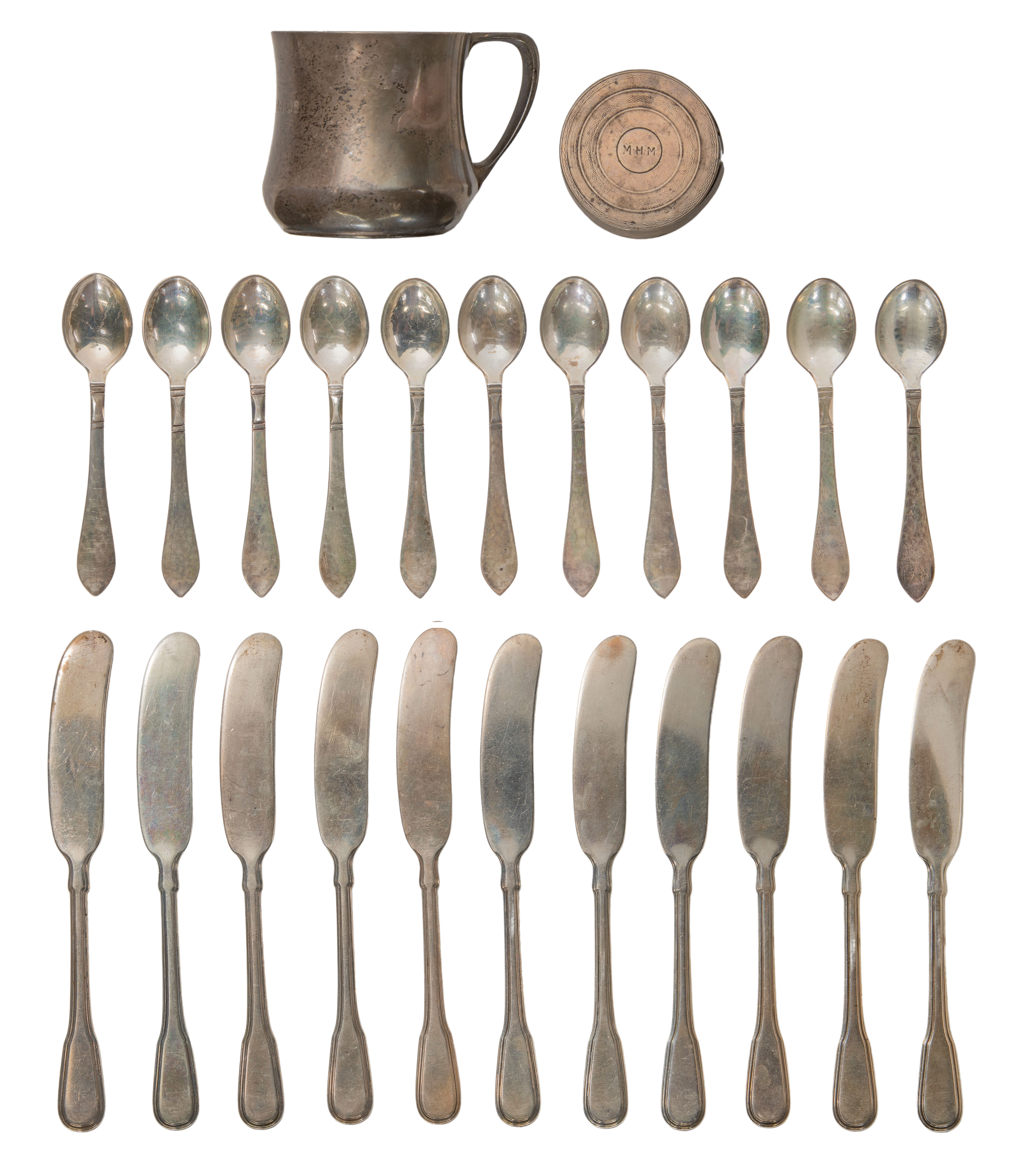 (4) items including a set of (11) Georg Jensen Continental individual butter spreaders (all marked ‘sterling’), a set of (11) demitasse Hamilton spoons, a baby mug and a lidded box (all marked ‘Tiffany and Co. 925’)