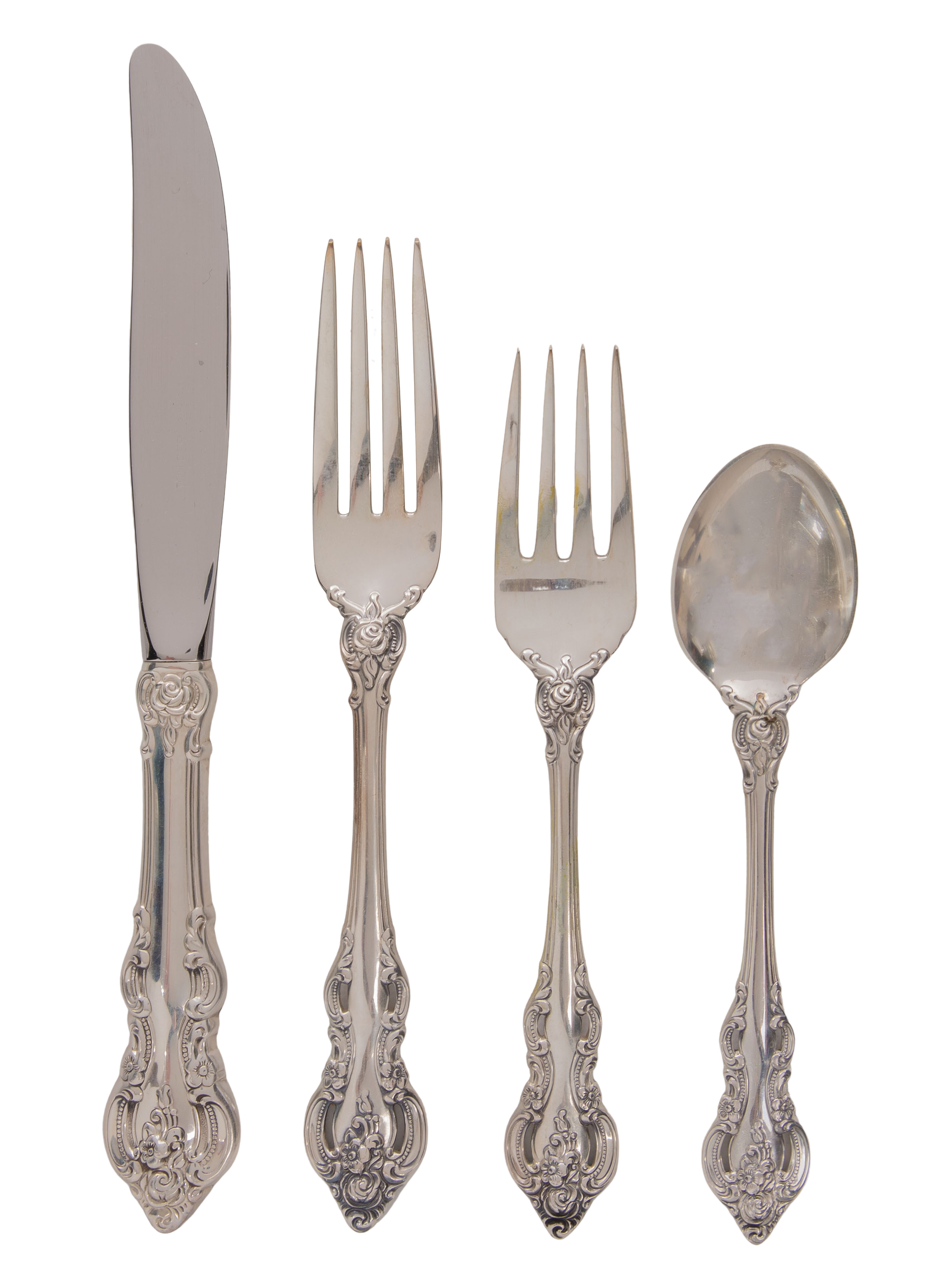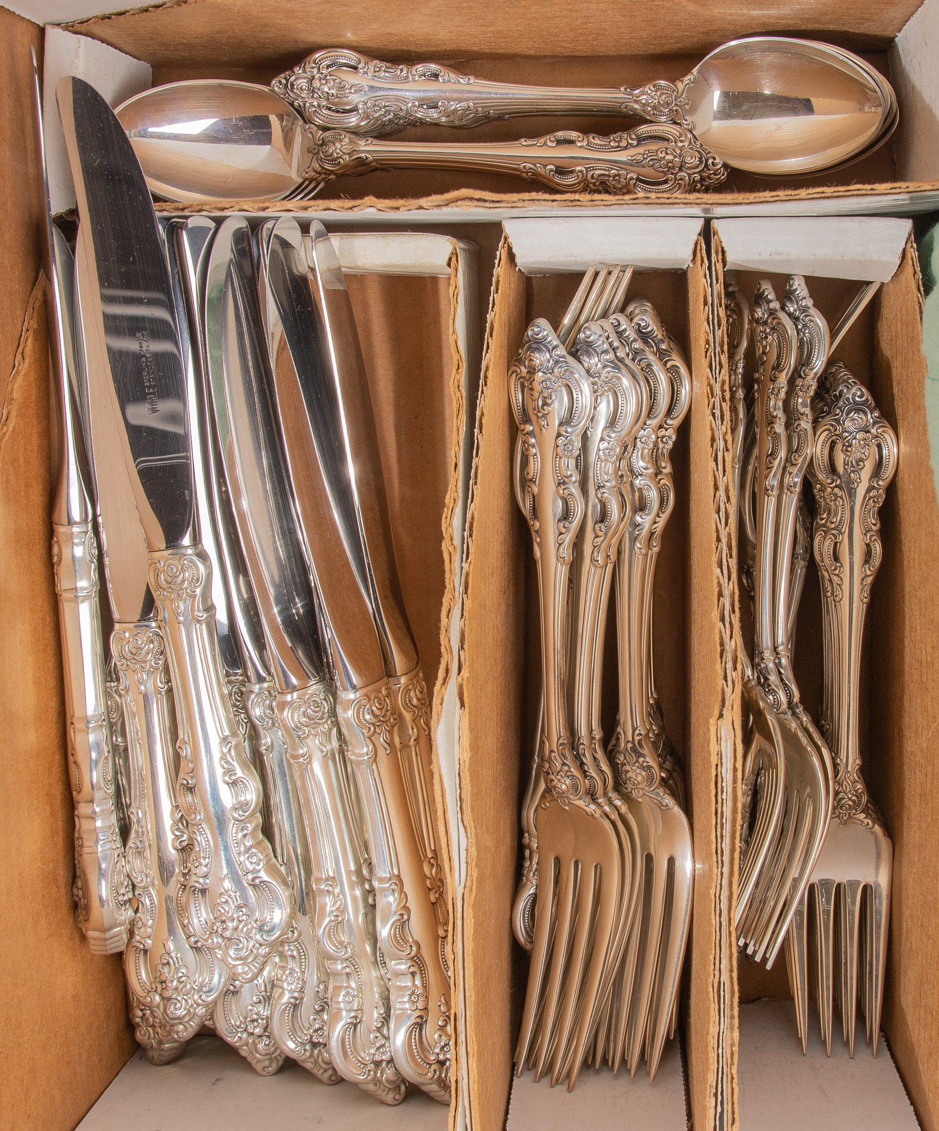 (64) items including (16) 8 7/8-inch dinner knives, (16) 7 1/2-inch dinner forks, (16) 6 3/4-inch luncheon forks, (16) 5 7/8-inch teaspoons (marked ‘sterling’)