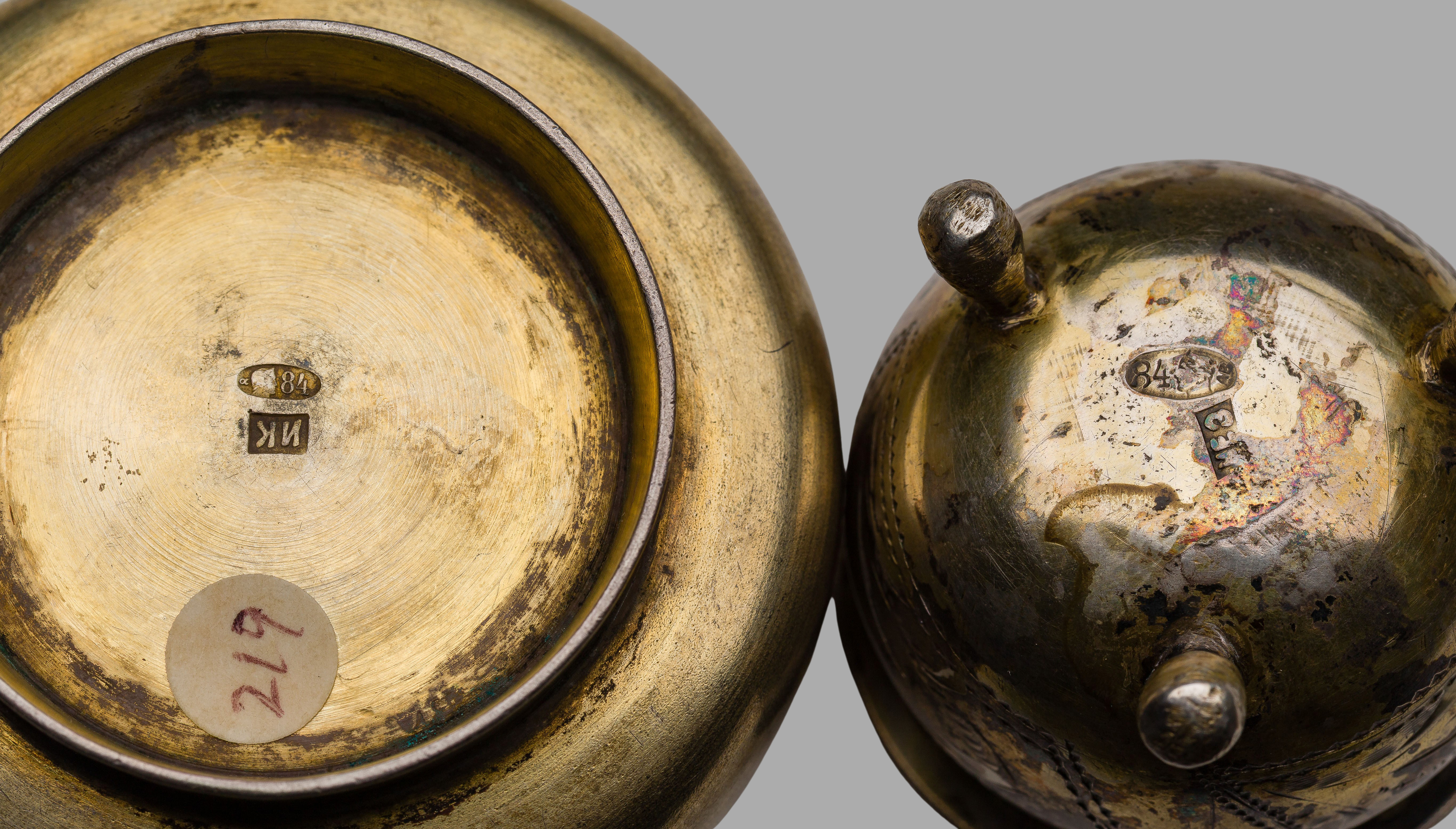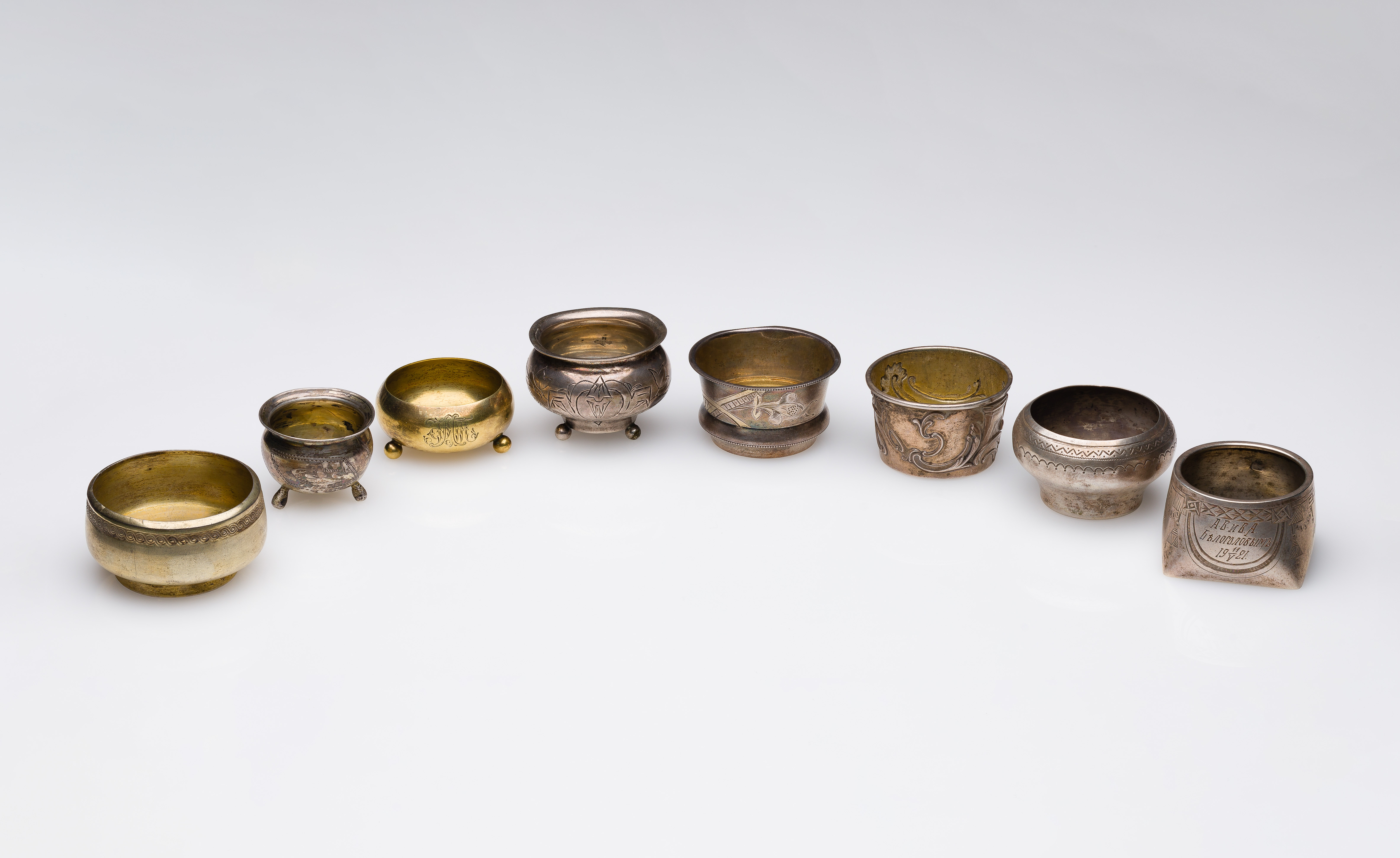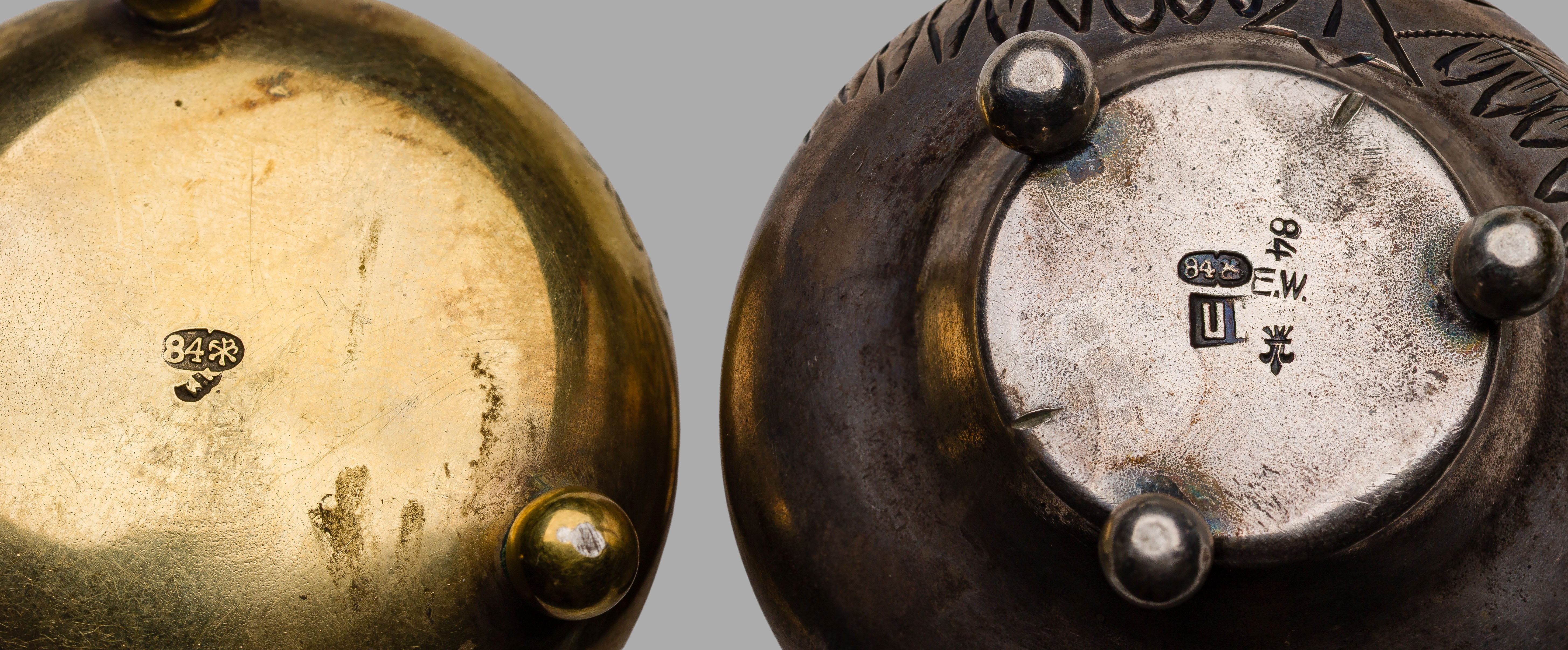 (8) items including a K. Faberge having a scroll motif (marked ‘K. Faberze’ / ’84’), a ball footed filigree having a letter W monogram (marked ‘E.W’ / ’84’), a filigree flat bottom (marked ‘H.C.C’ / ’84’), a ball foot gold-tone (marked ’84’), a flat bottom having Cyrillic writing throughout (marked ‘P.B’ / ’84’), a squat pot shape (marked ’84’), a gold-tone chain pattern rim (marked ‘I.K’ / ’84’) and a gold-tone footed (marked ’84’)