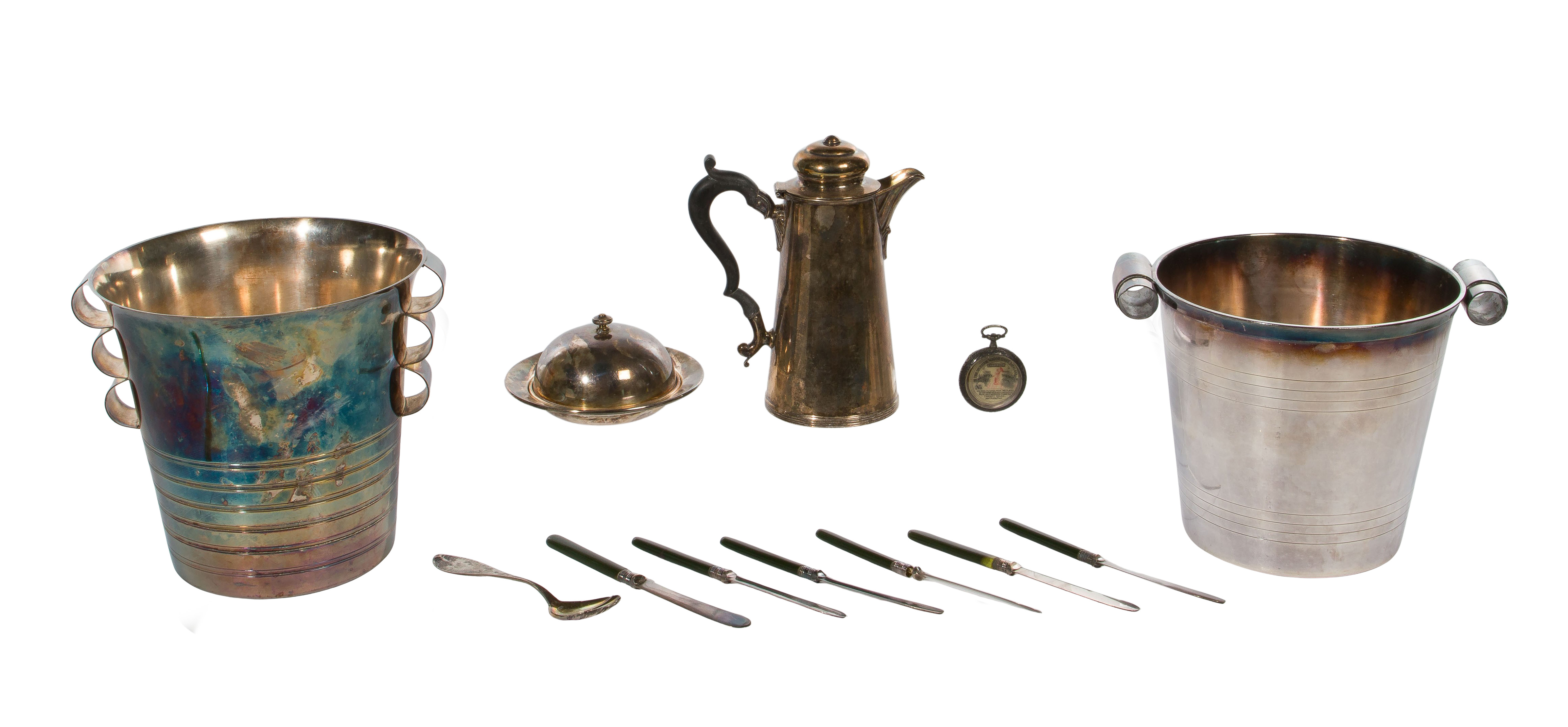 (7) items including an Art Deco Saint Medard champagne bucket having stamped mark underside, another Art Deco champagne bucket having an unidentified mark underside, a coffee or hot chocolate pot marked ‘Asprey / London’ underside, a covered butter dish marked ‘Orfevrerie de France’, an unmarked 6-piece hors d’ oeuvres knife set in a cloth roll, a sugar spoon marked ‘Pure Coin’ and a pocket watch case retaining a Dueber Watch Case Manufacturing Company 2-color engraved warranty certificate fitted within