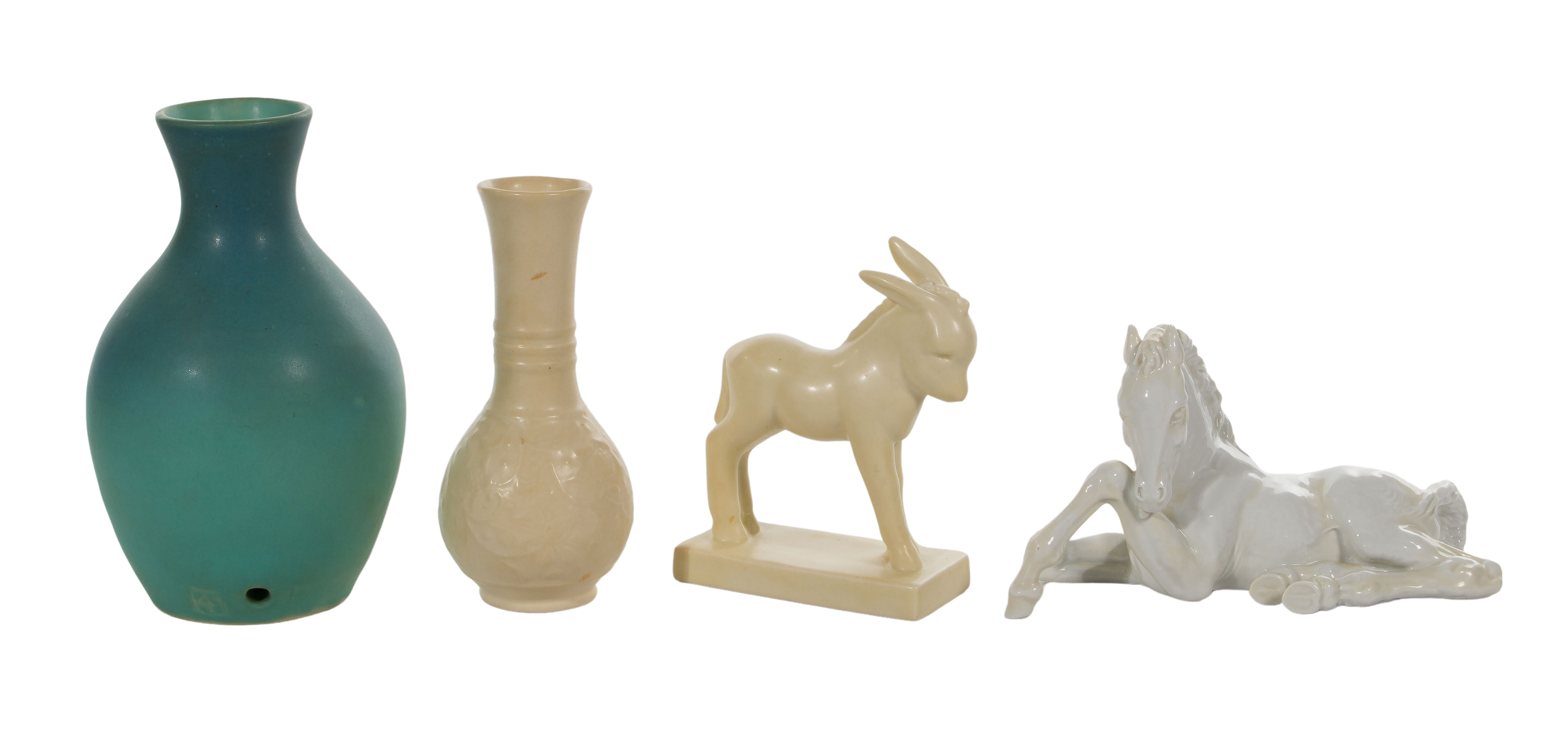 (4) items including a Rookwood #2389 vase, a Rookwood #6341 burro figurine, both having impressed marks underside, a Van Briggle lamp base / vase having a pre-form open bottom and cord hole to side next to impressed mark (hardware and cord removed but present and bagged); together with a Meissen recumbent horse figurine having a crossed swords mark underside