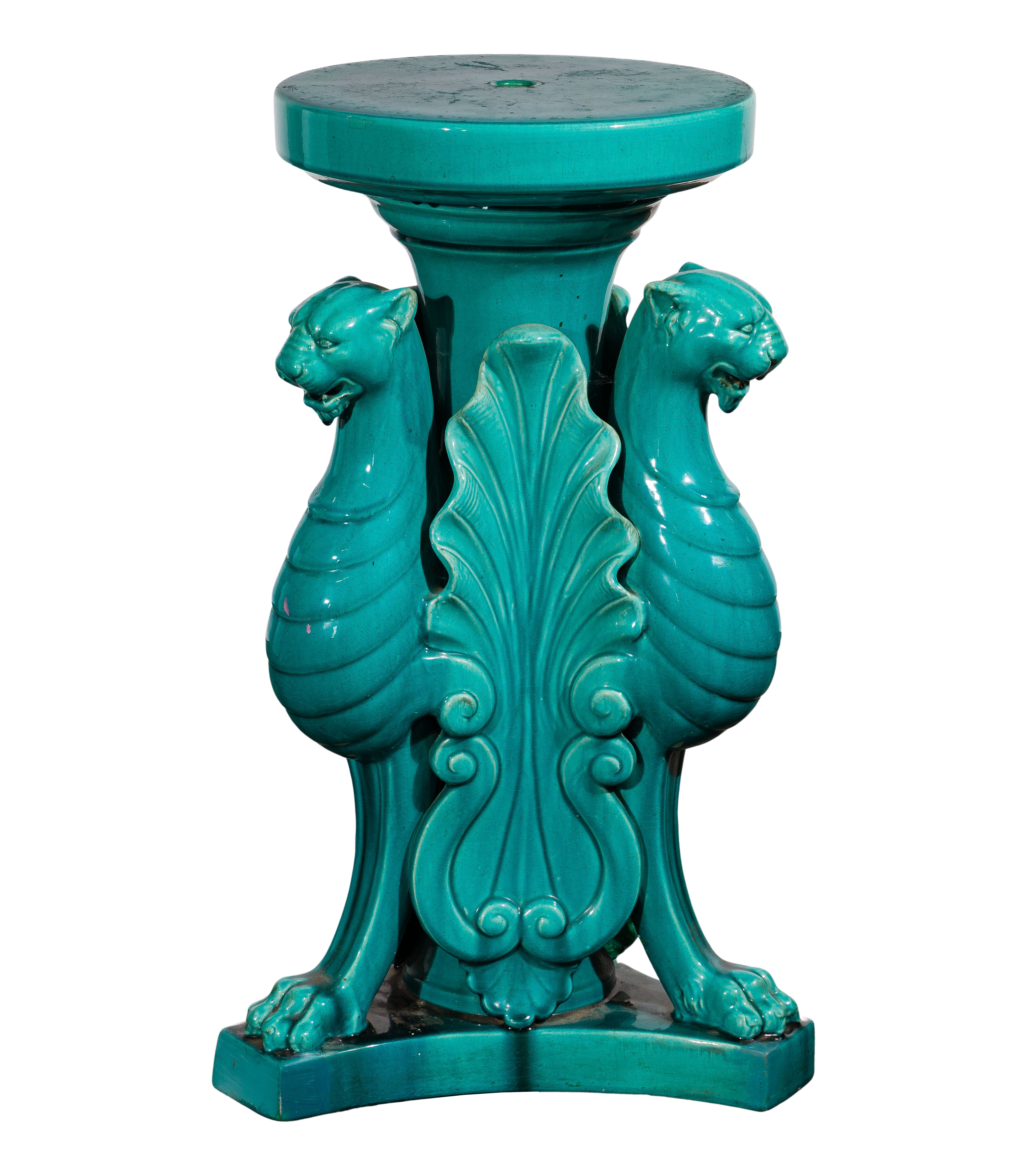 A turquoise stand having three griffins between long acanthus leaves, stamped ‘Clement Massier, Golfe Juan’