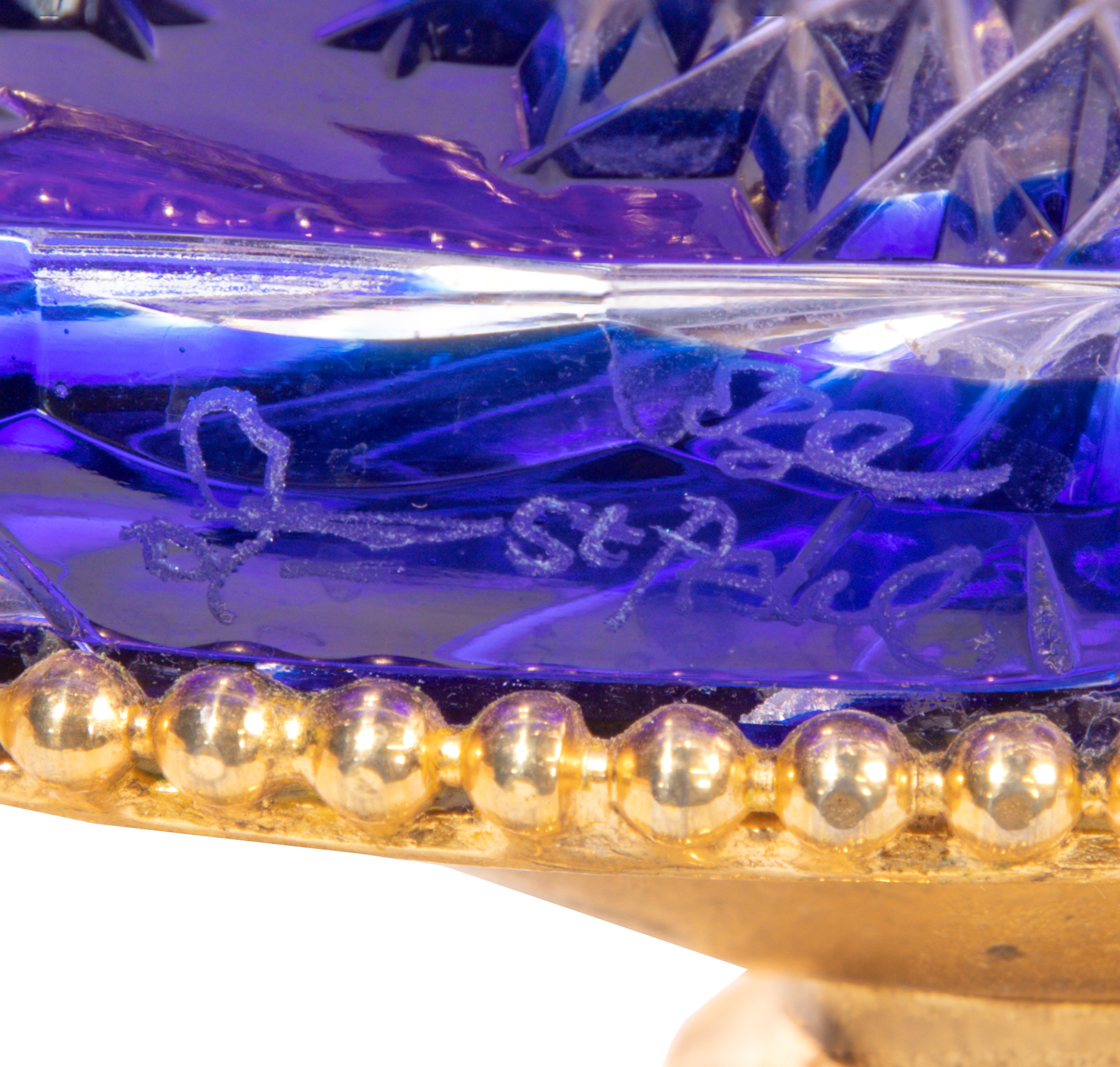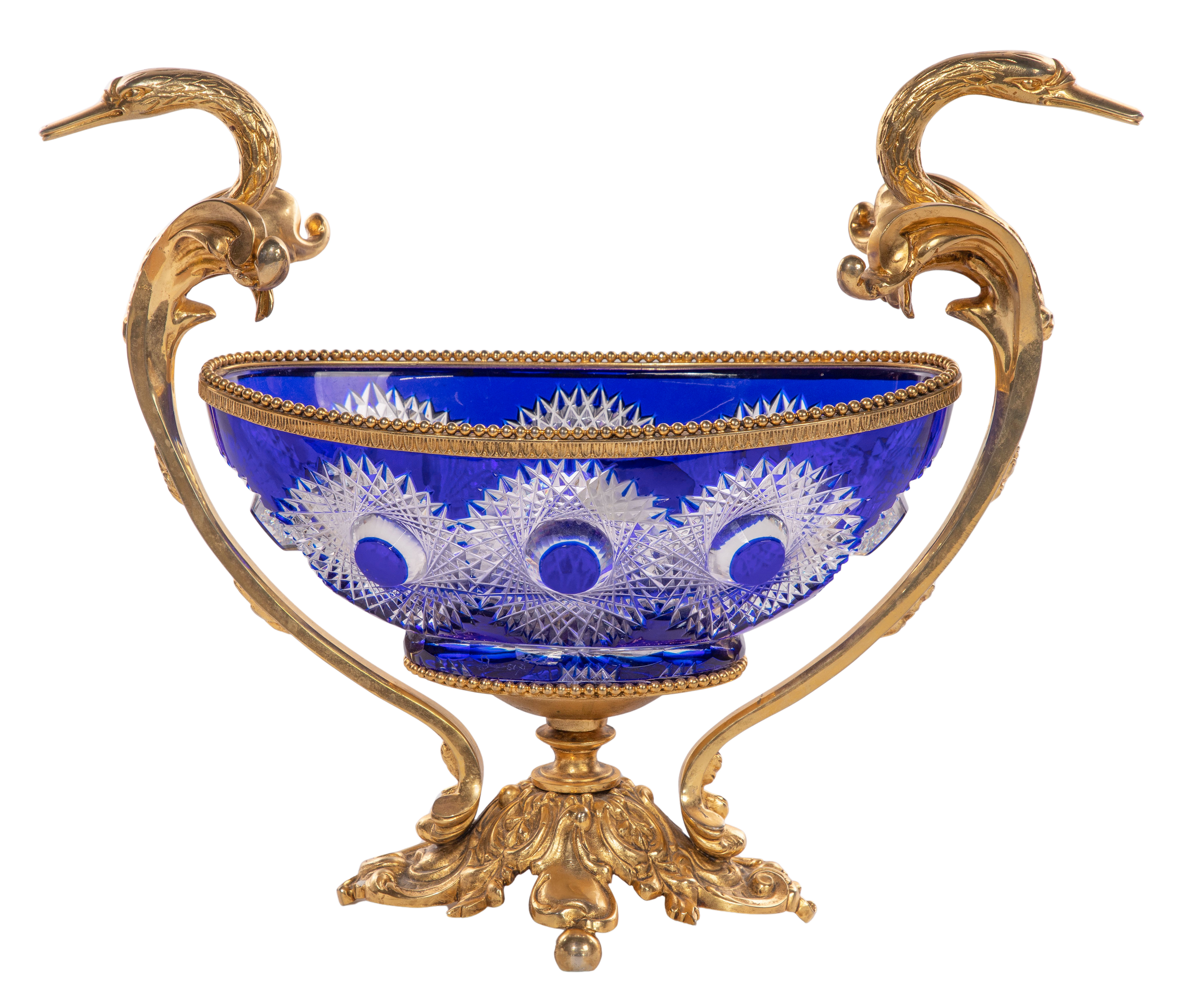An oval, hand-cut cobalt-to-clear crystal bowl having gilt bronze dore mount of swans and Baroque scrolls, signed on outside lower rim and retaining original label