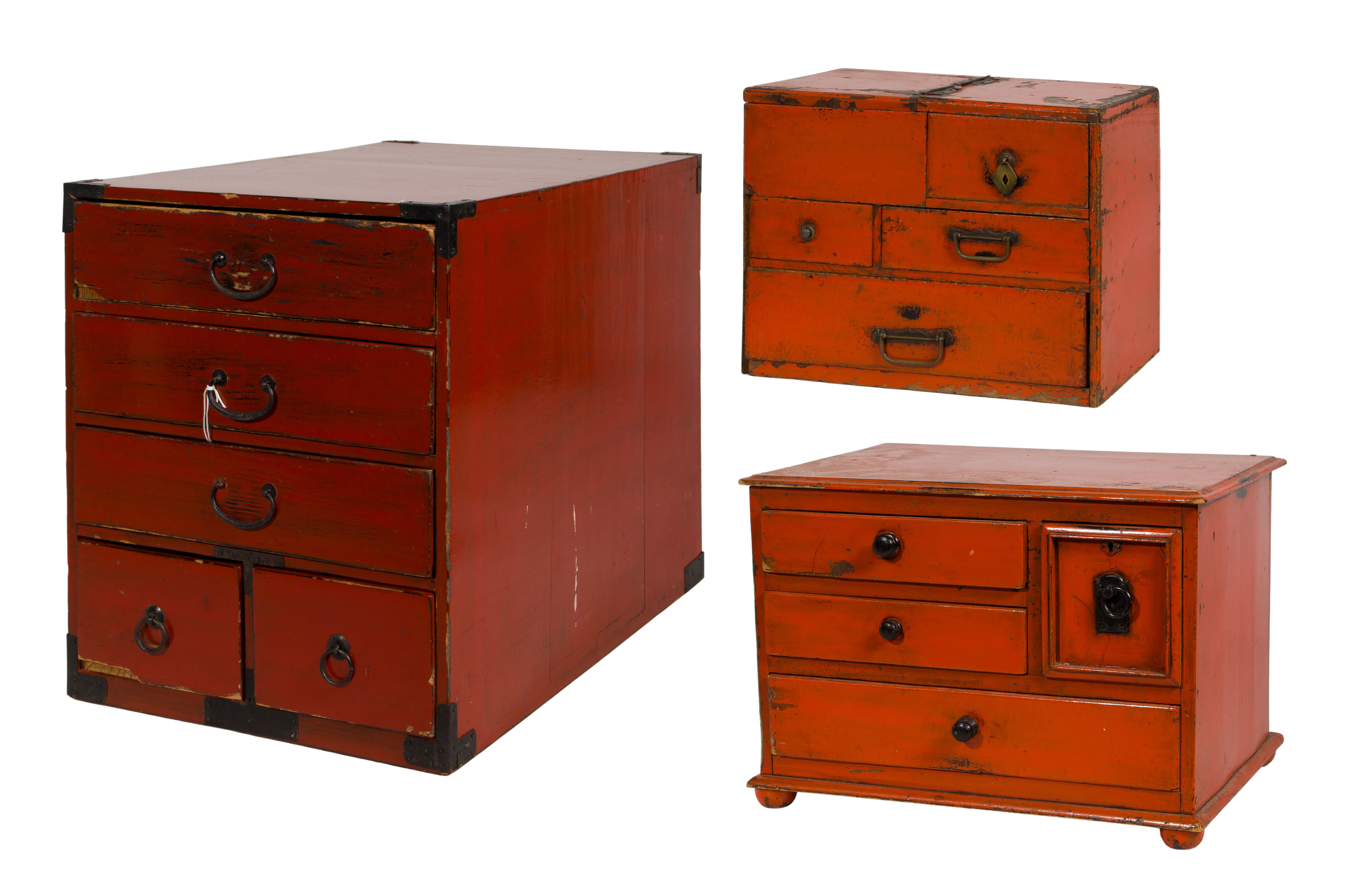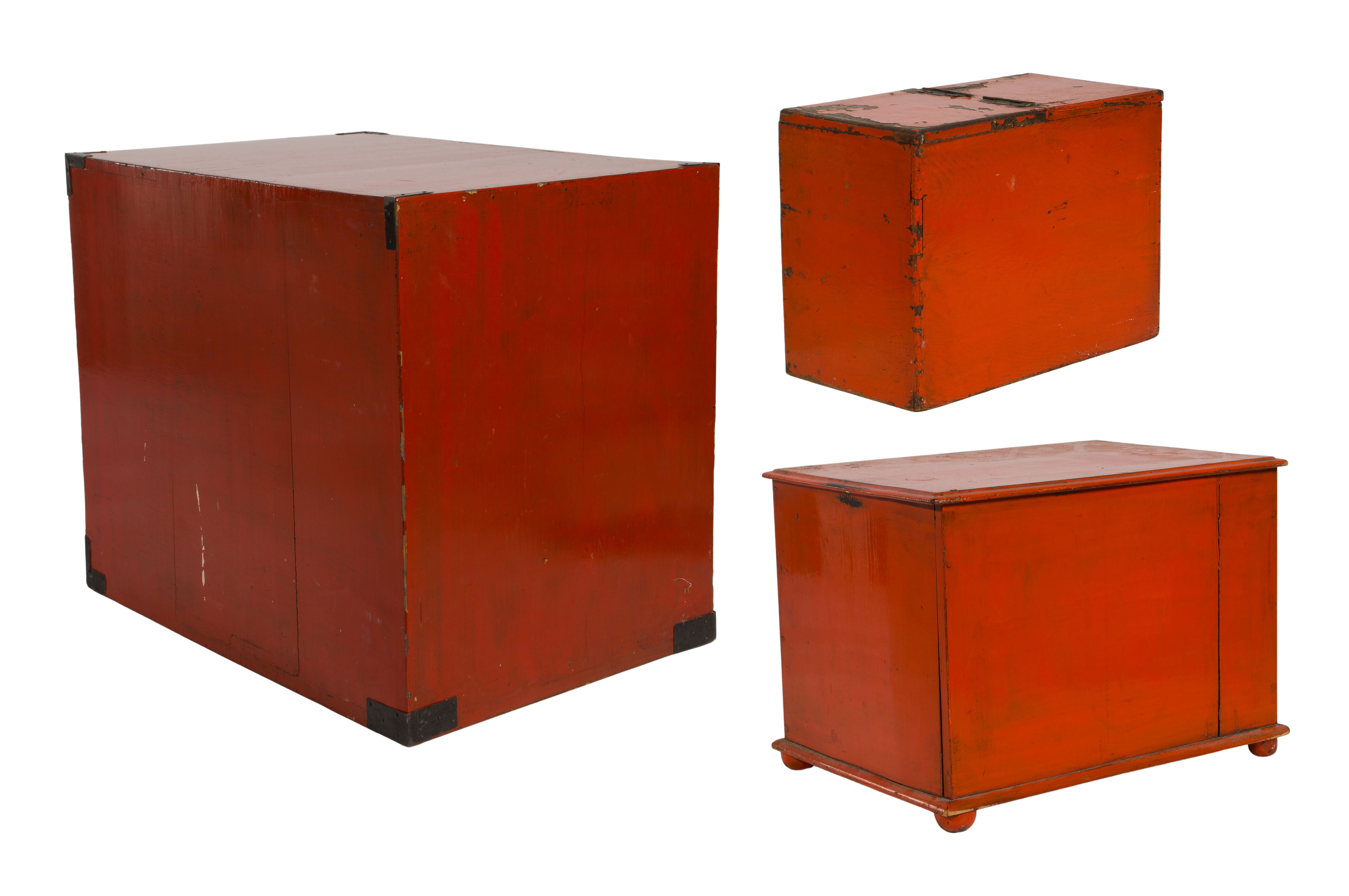 (3) items in various sizes, largest having brass corner pieces, all having brass hardware, painted orange