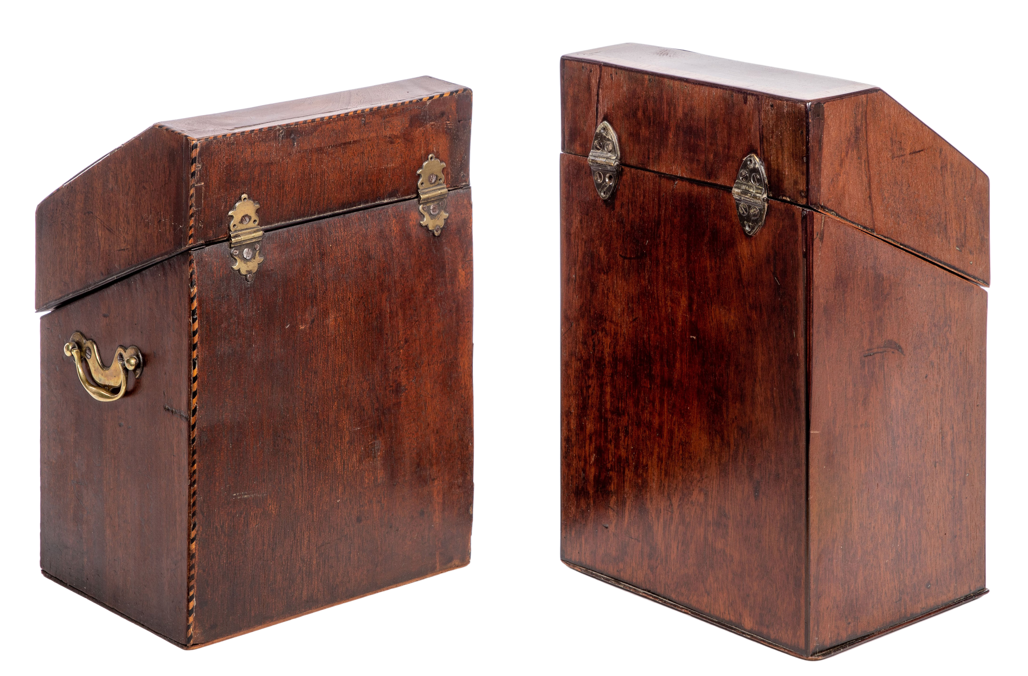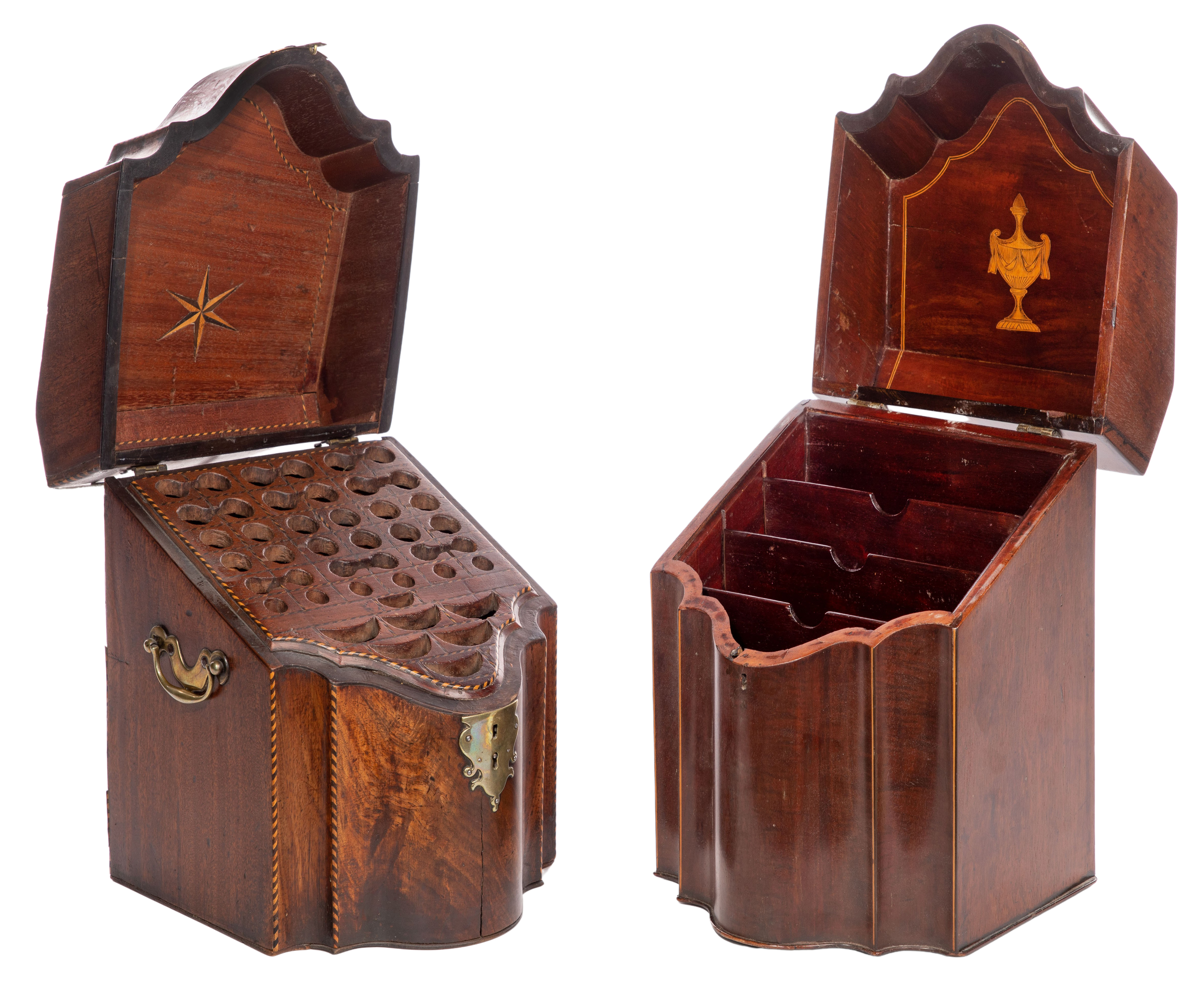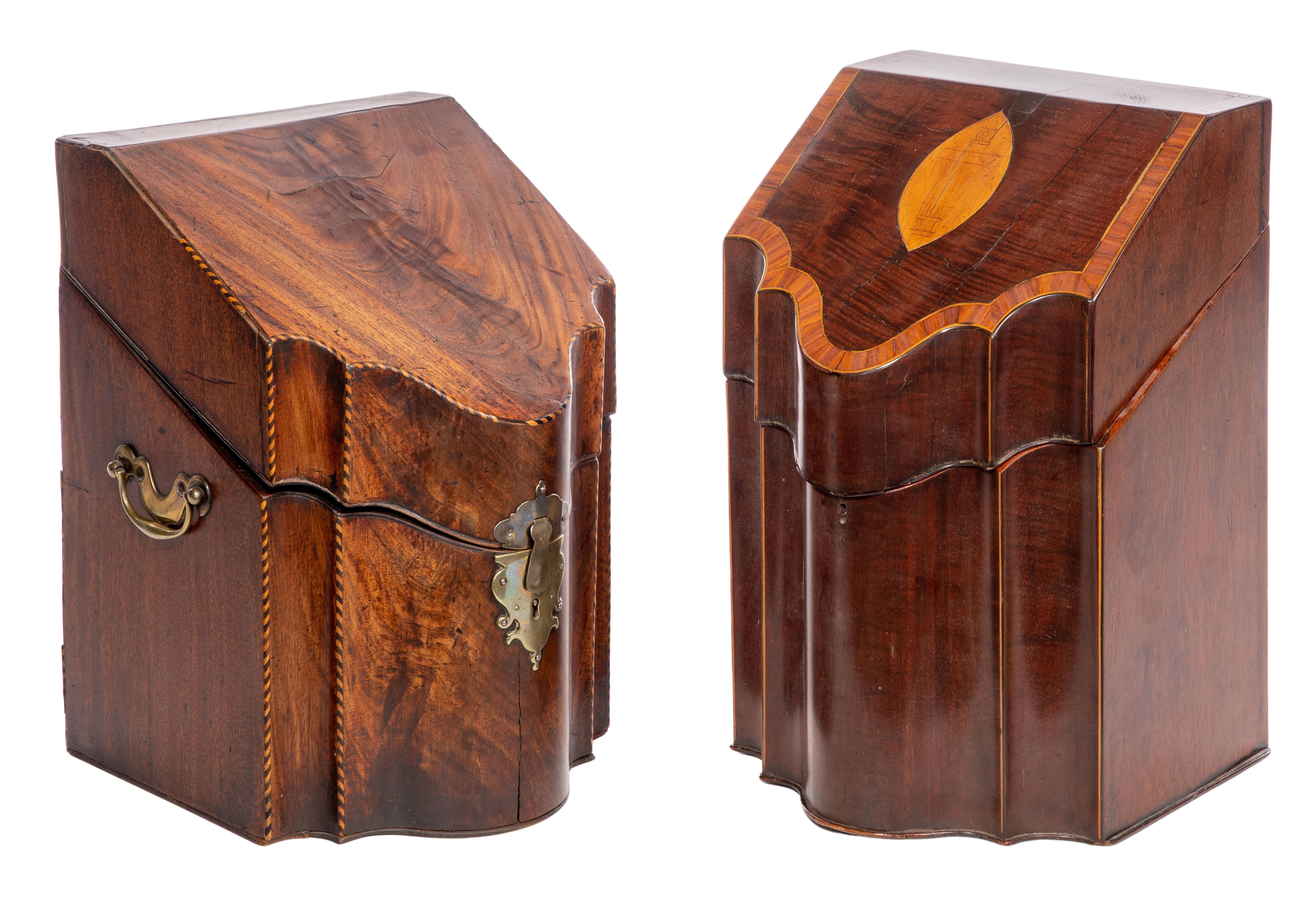 (2) items, both having slant-top hinged lids, serpentine fronts, the knife box opening on interior designed to receive cutlery, a star inlay to lid interior and having rope-twist style edge binding and inlays of alternating ebony and satinwood and having brass closure and bale handles, the post box opening on partitioned interior for filing letters and having satinwood cross banding and urn motif engraved inlay to exterior and pictorial inlay to interior of lid