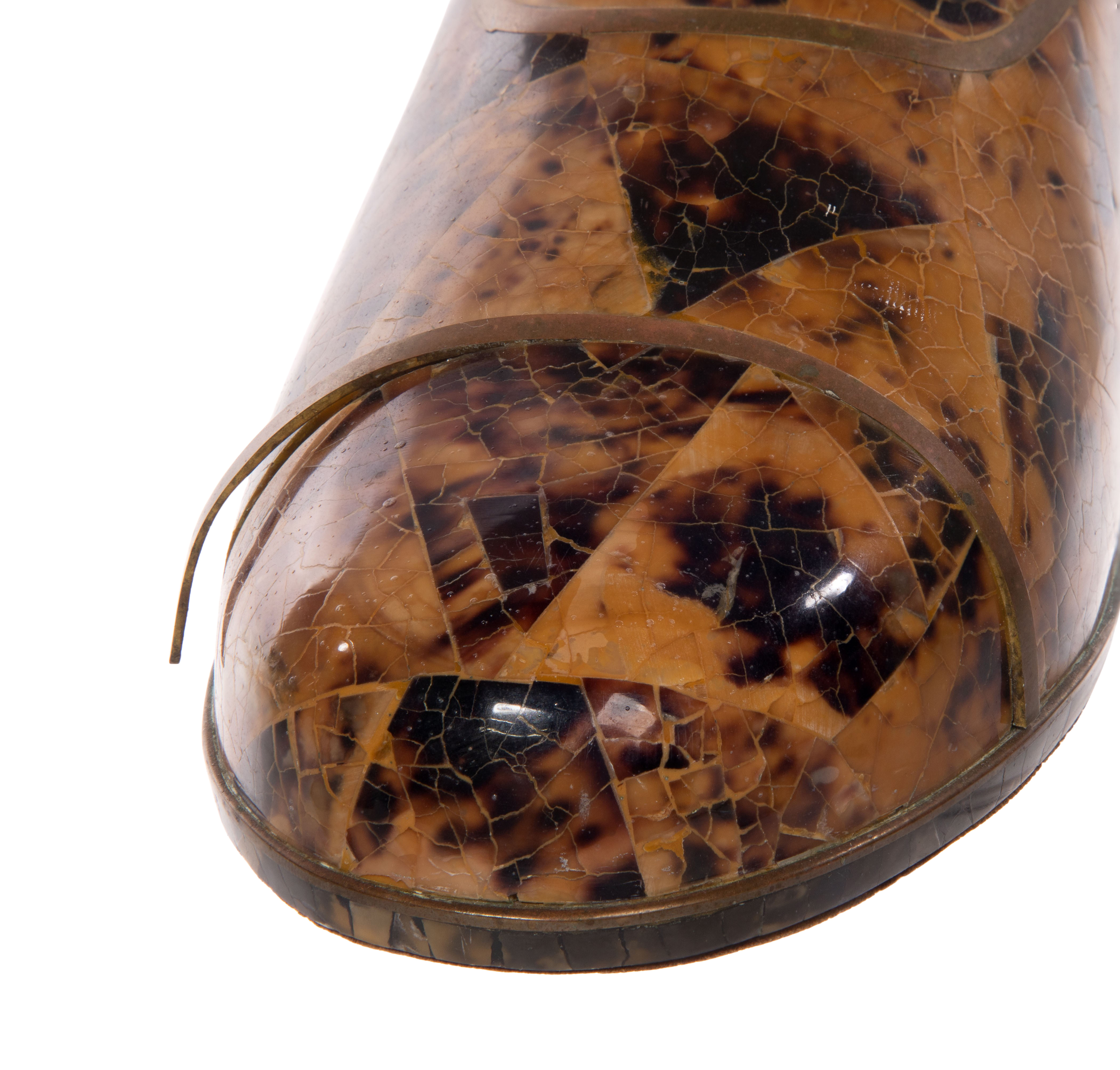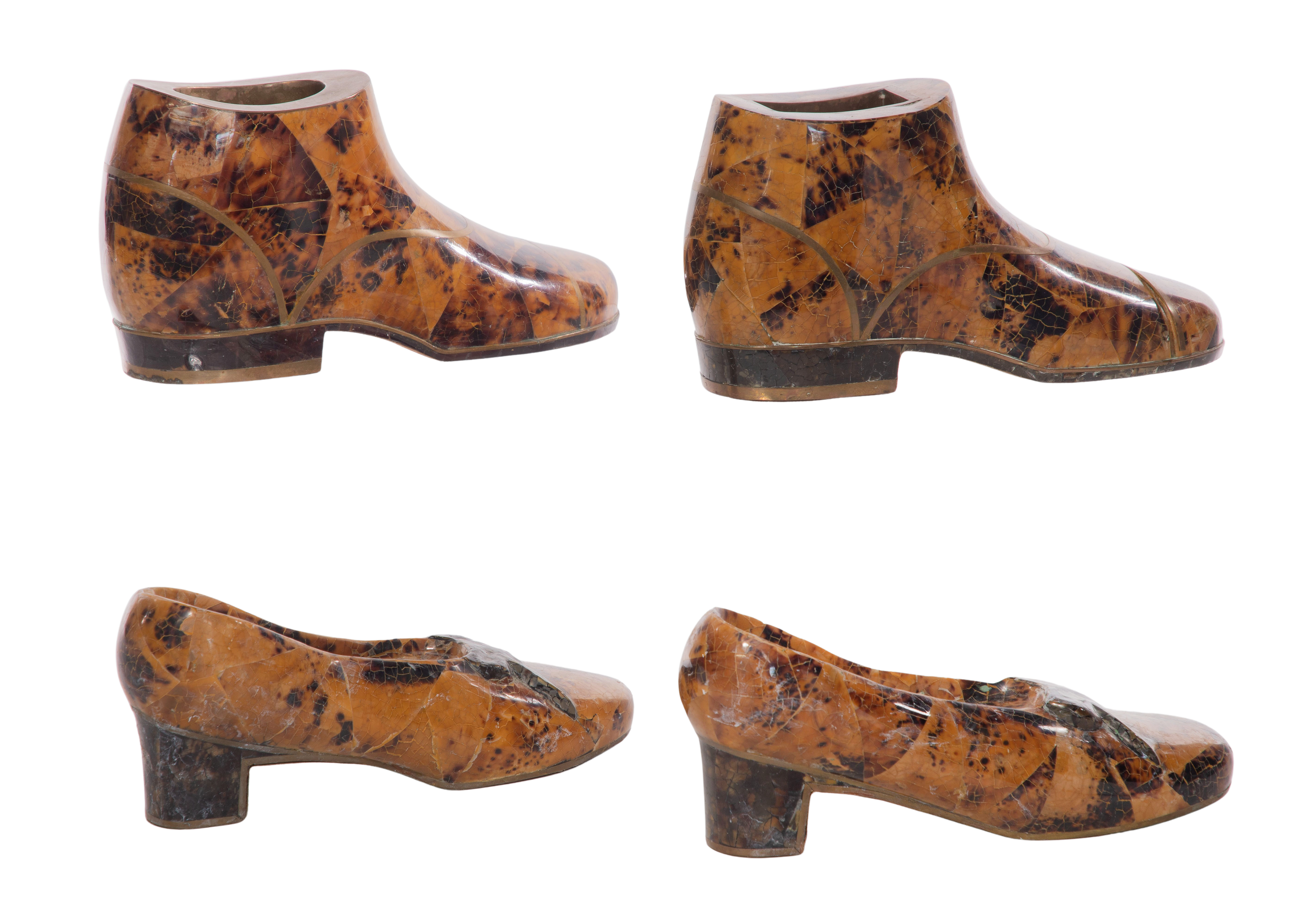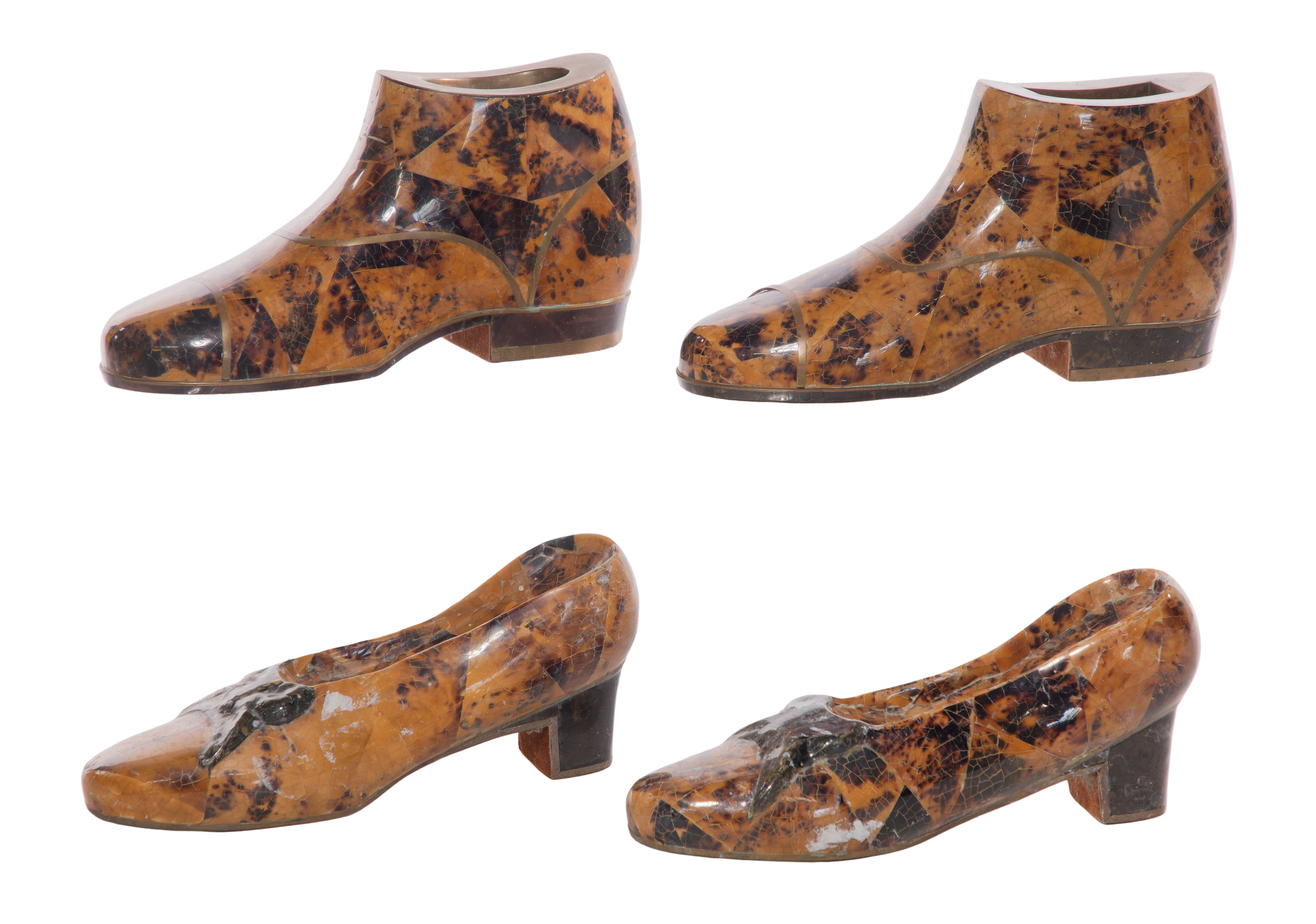 (4) items including a similar pair of boots having brass inlays and a pair of ballerina flats, both pairs in tessellated stone, Maitland-Smith label on underside