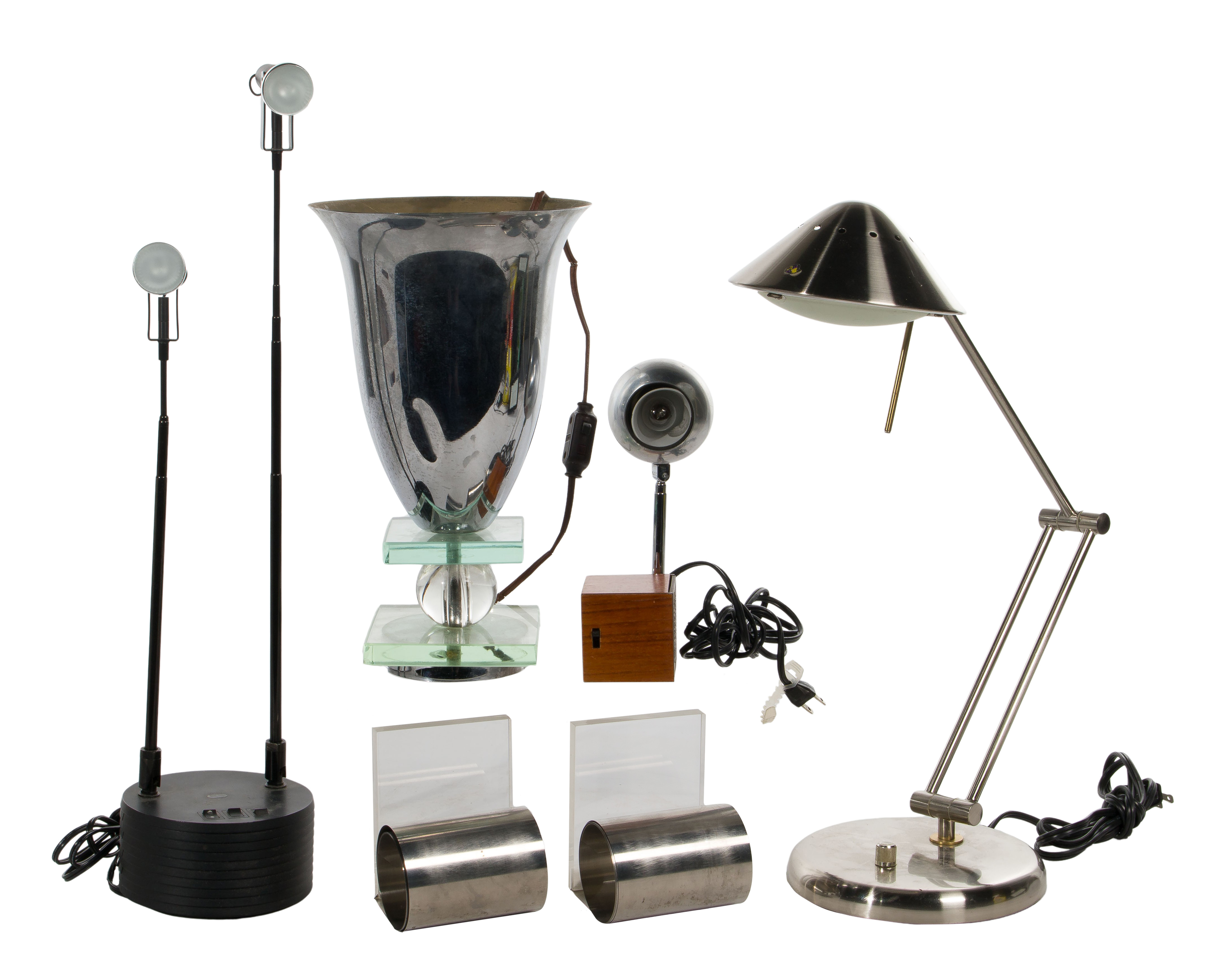 (6) total items including a Sciopticon halogen table lamp having two telescopic antenna that move in various directions, a Tensor Modern LT627 brushed nickel adjustable, a Michael Lax for Lightolier designed eyeball lamp in chrome having an extendable antenna rod and a Lucite and chrome up-light; together with Lucite and rolled aluminum bookends