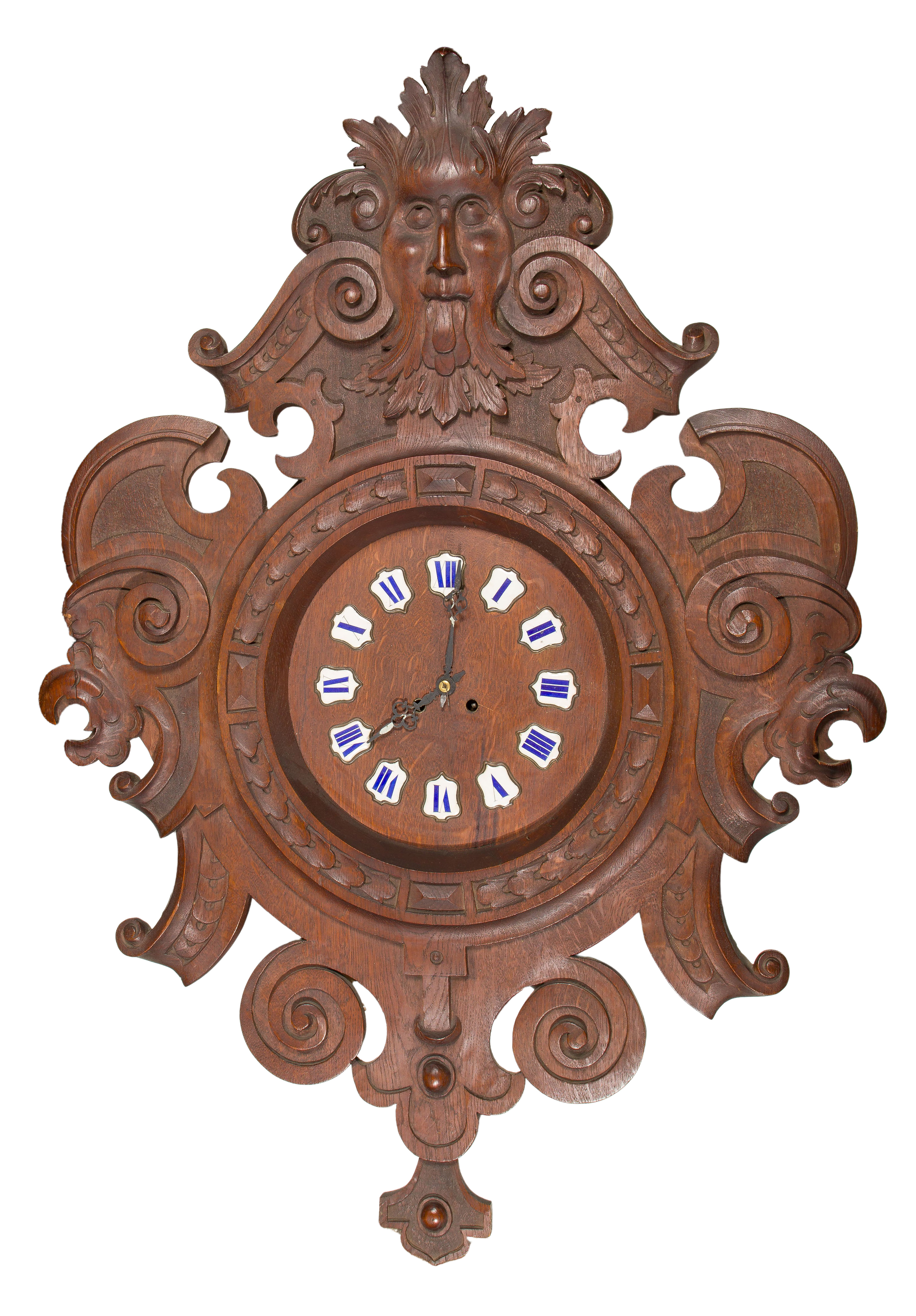 Hand carved wall / parlor clock having a satyr face motif, enamel numbers, including pendulum