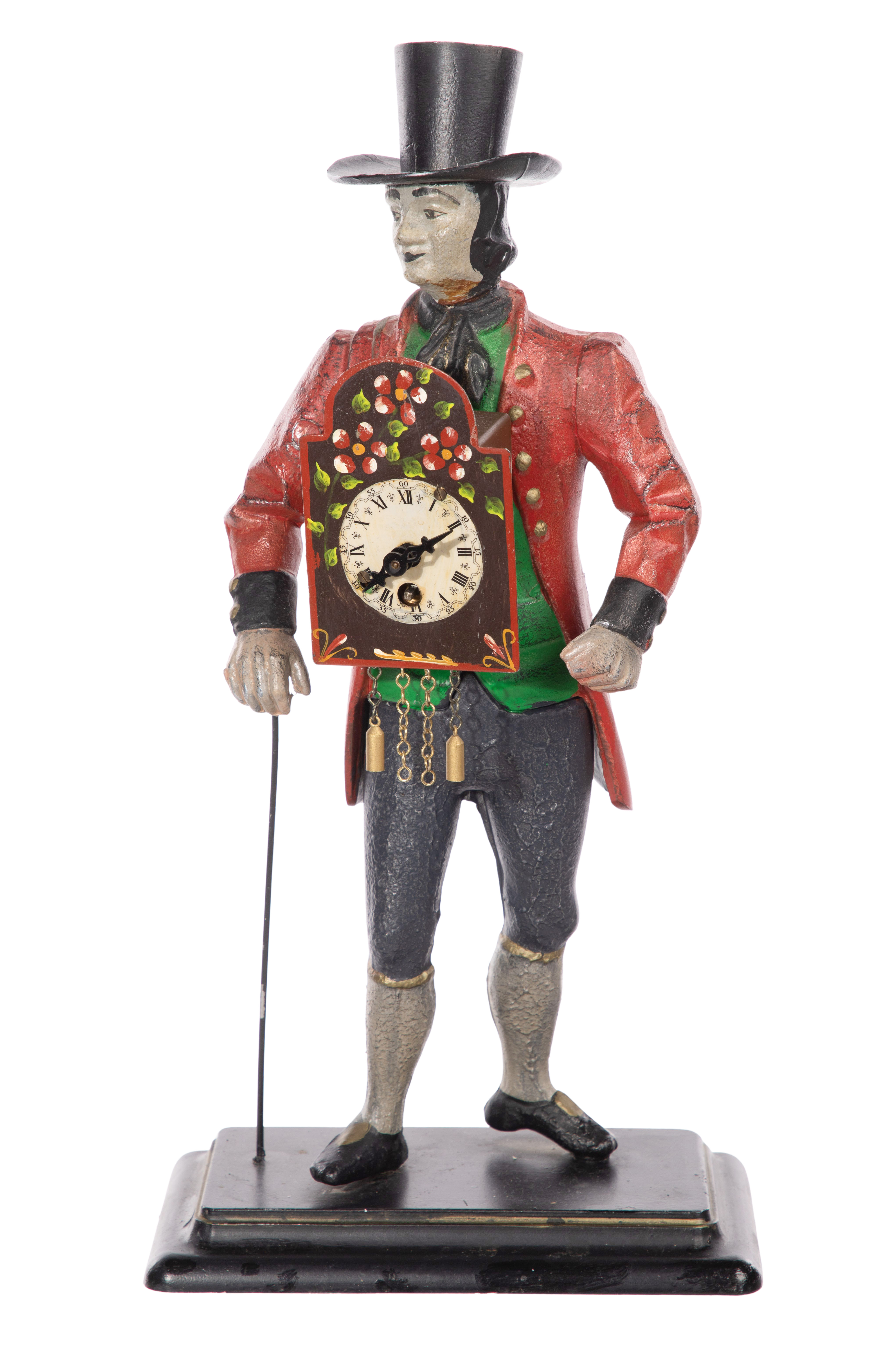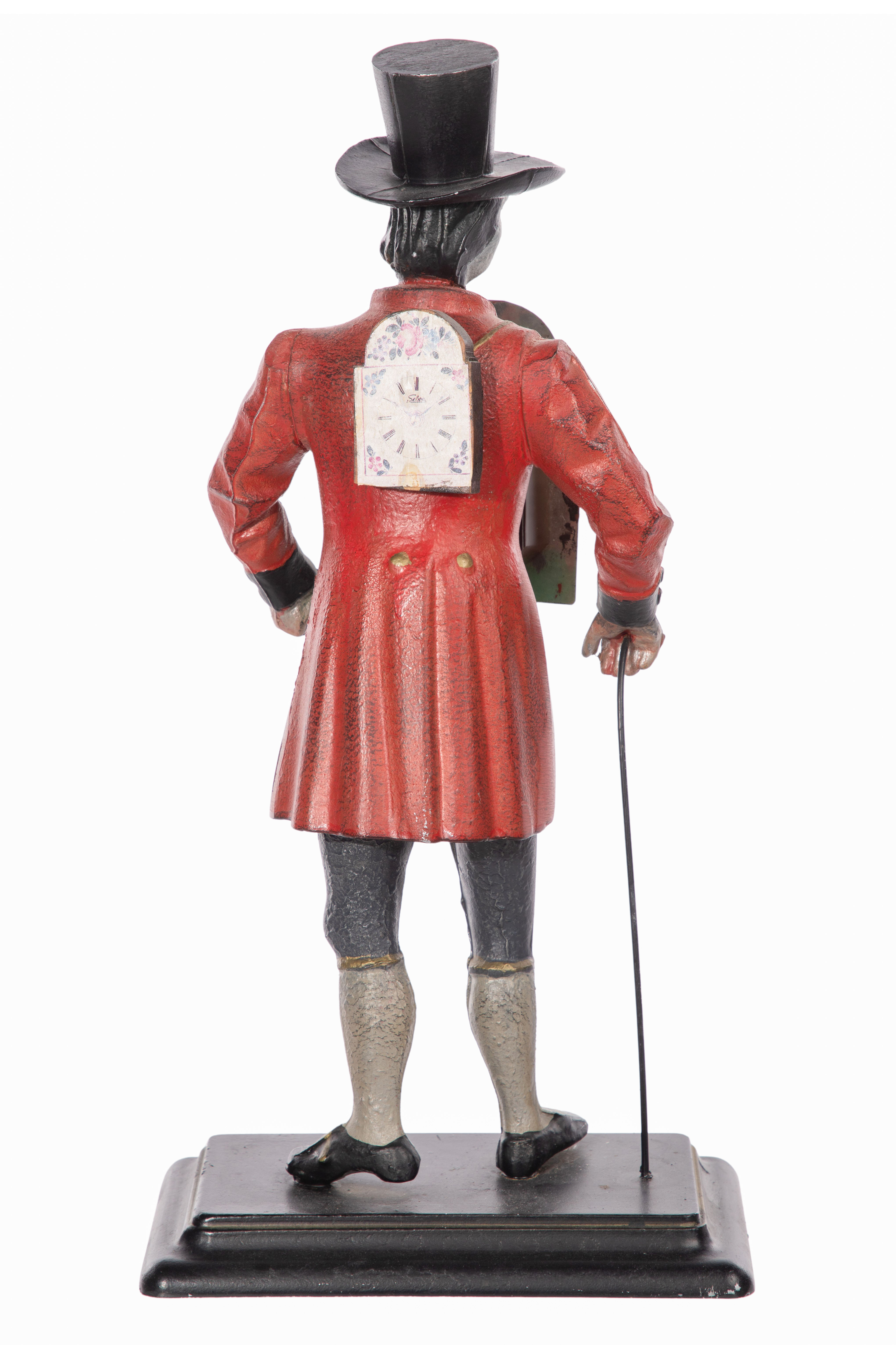 1960s painted cast iron depiction of a peddler wearing his wares, fore and aft, the front clock having a removable plastic case and applied printed dial on painted tinplate, plastic weights, single key port, brass movement, the back clock of wood having a printed paper dial marked ‘Selva’