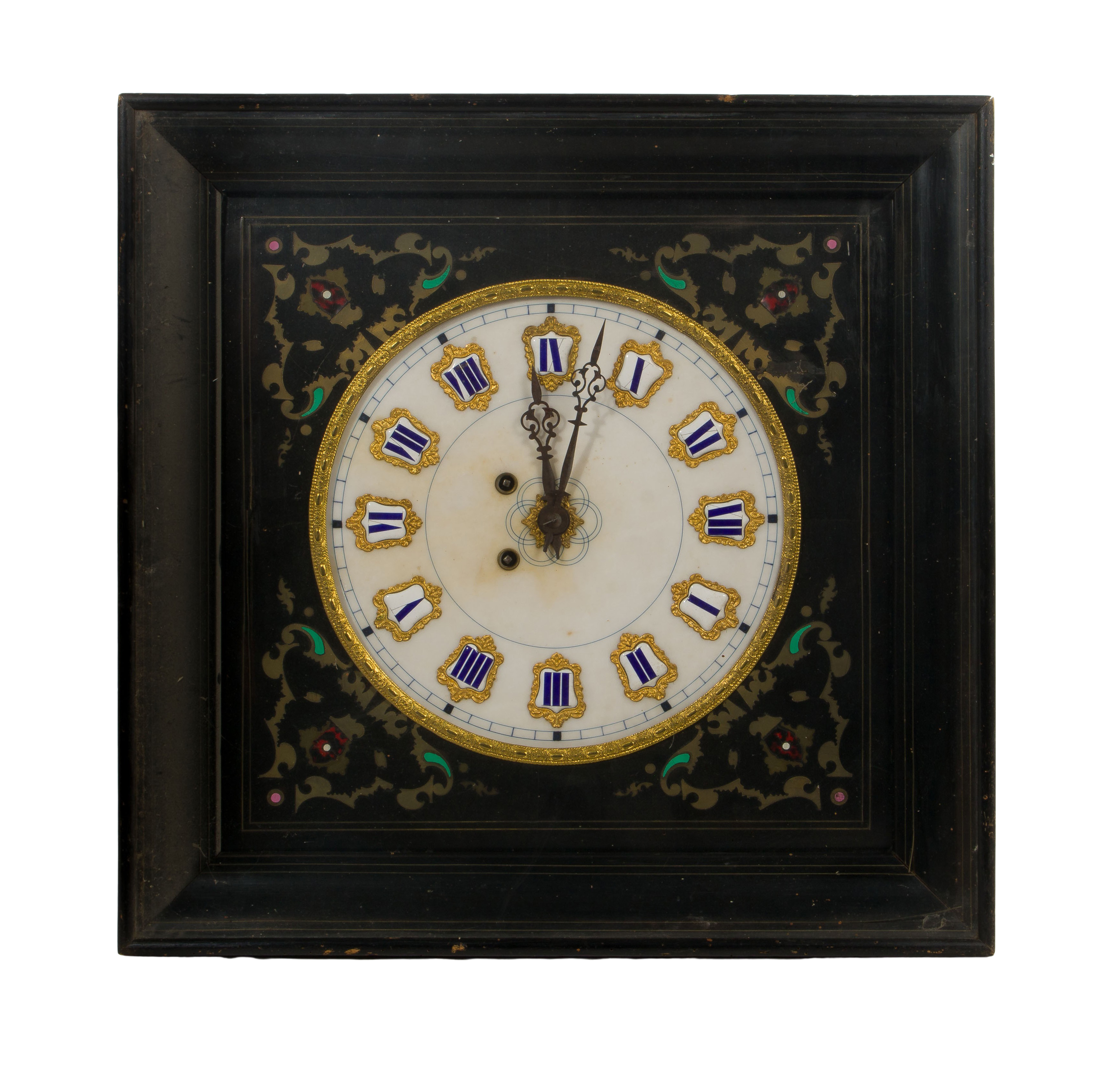 19th century, having an alabaster face, porcelain numerals, enamel accents, ebonized frame and brass inlay, key