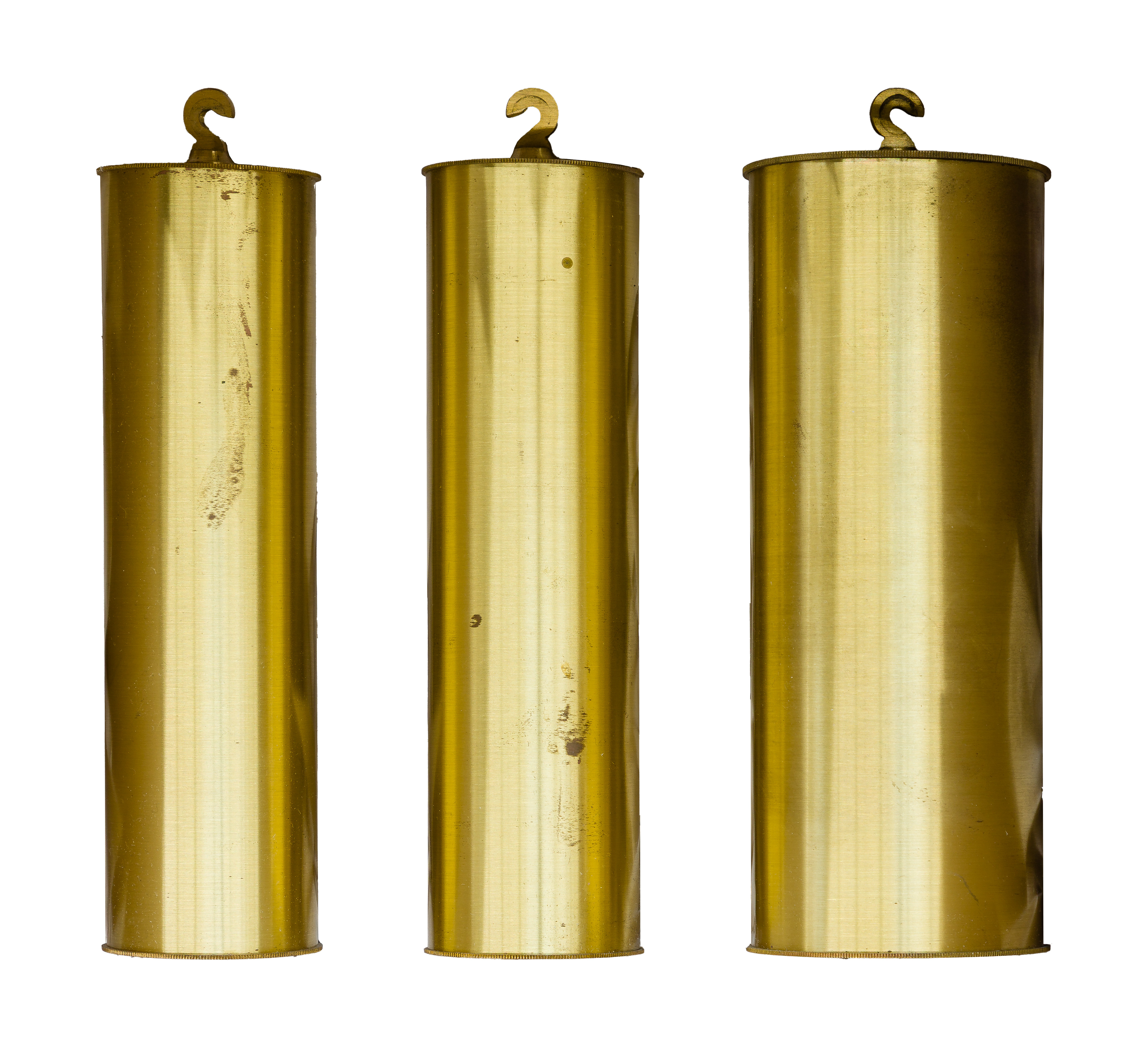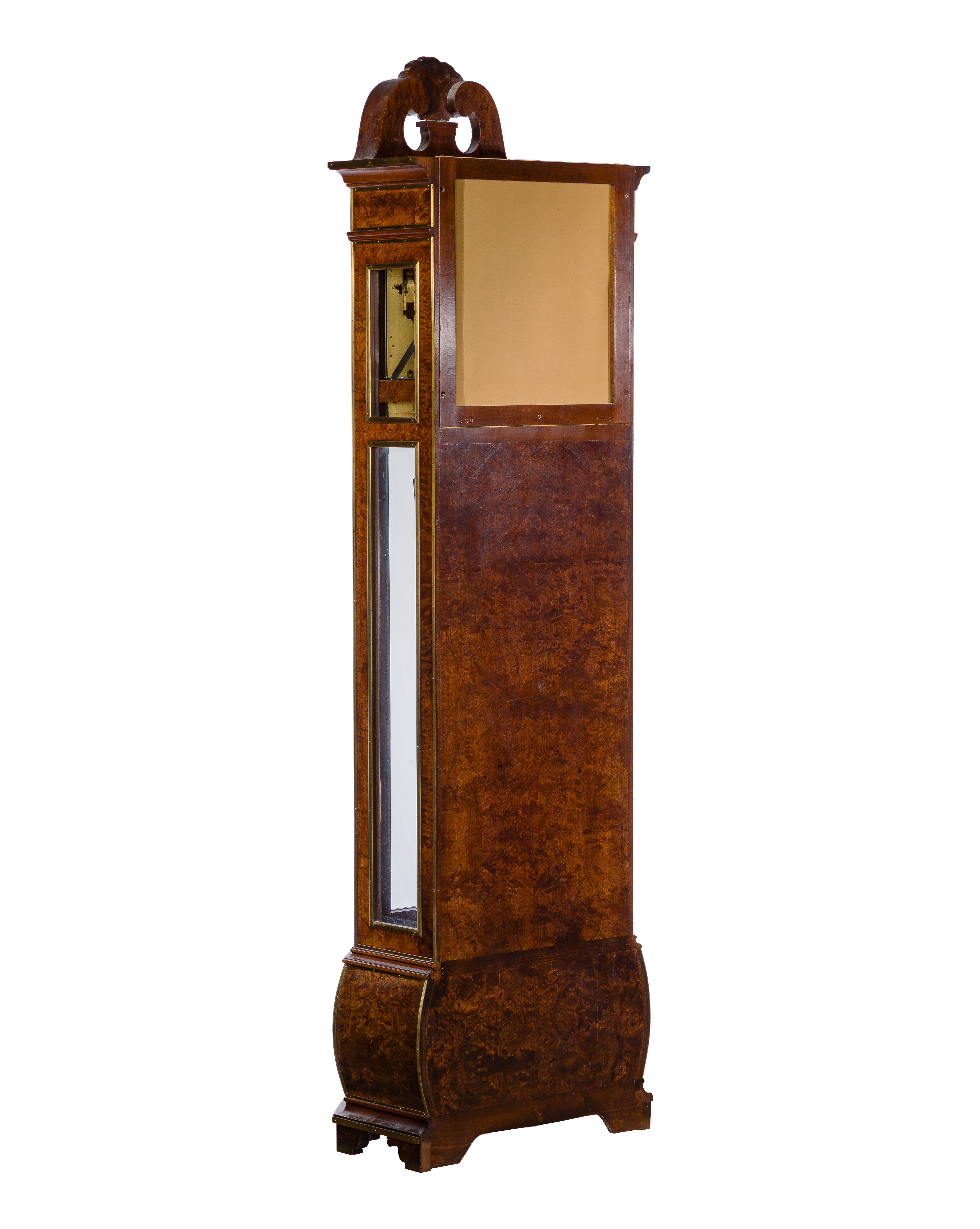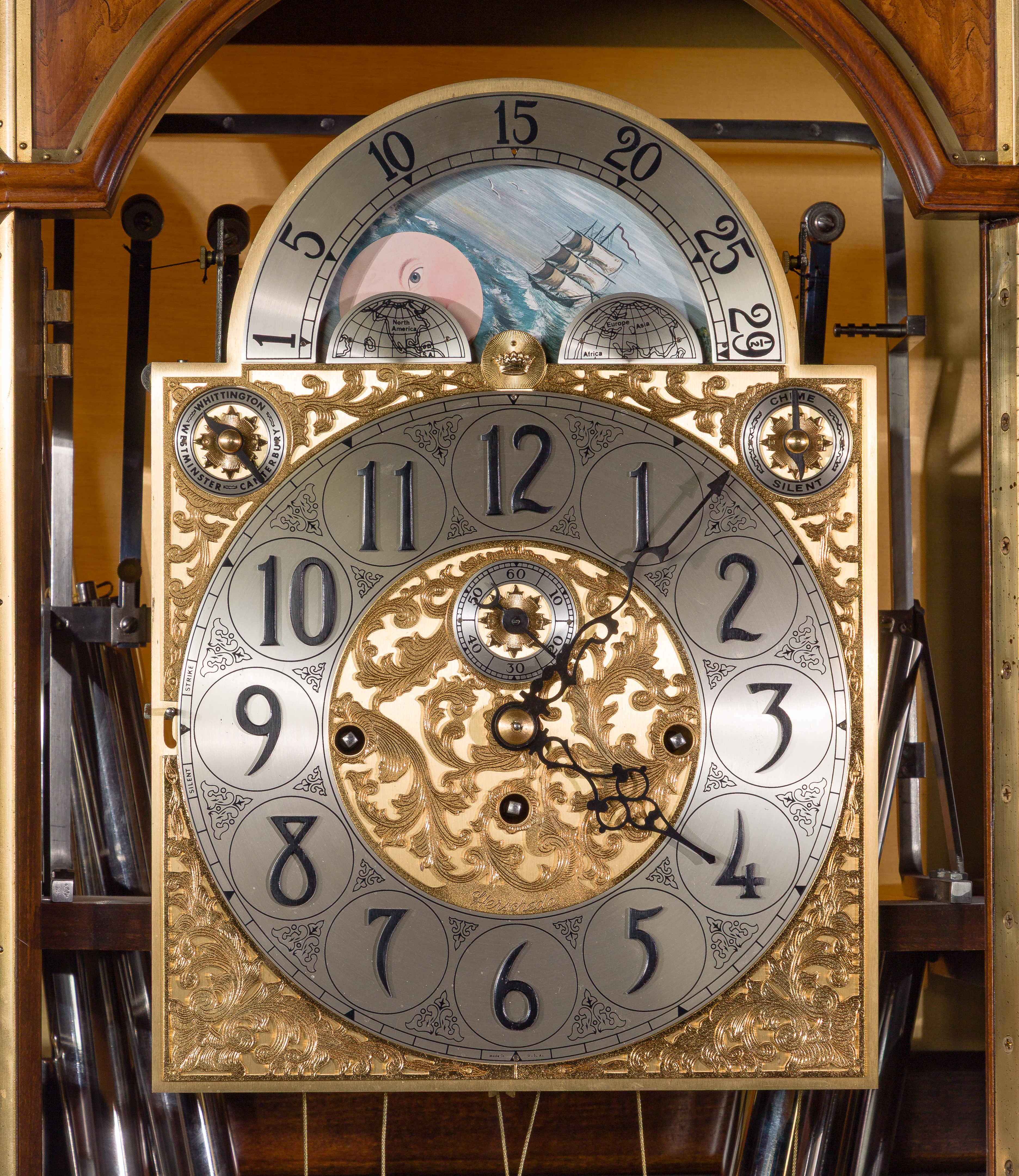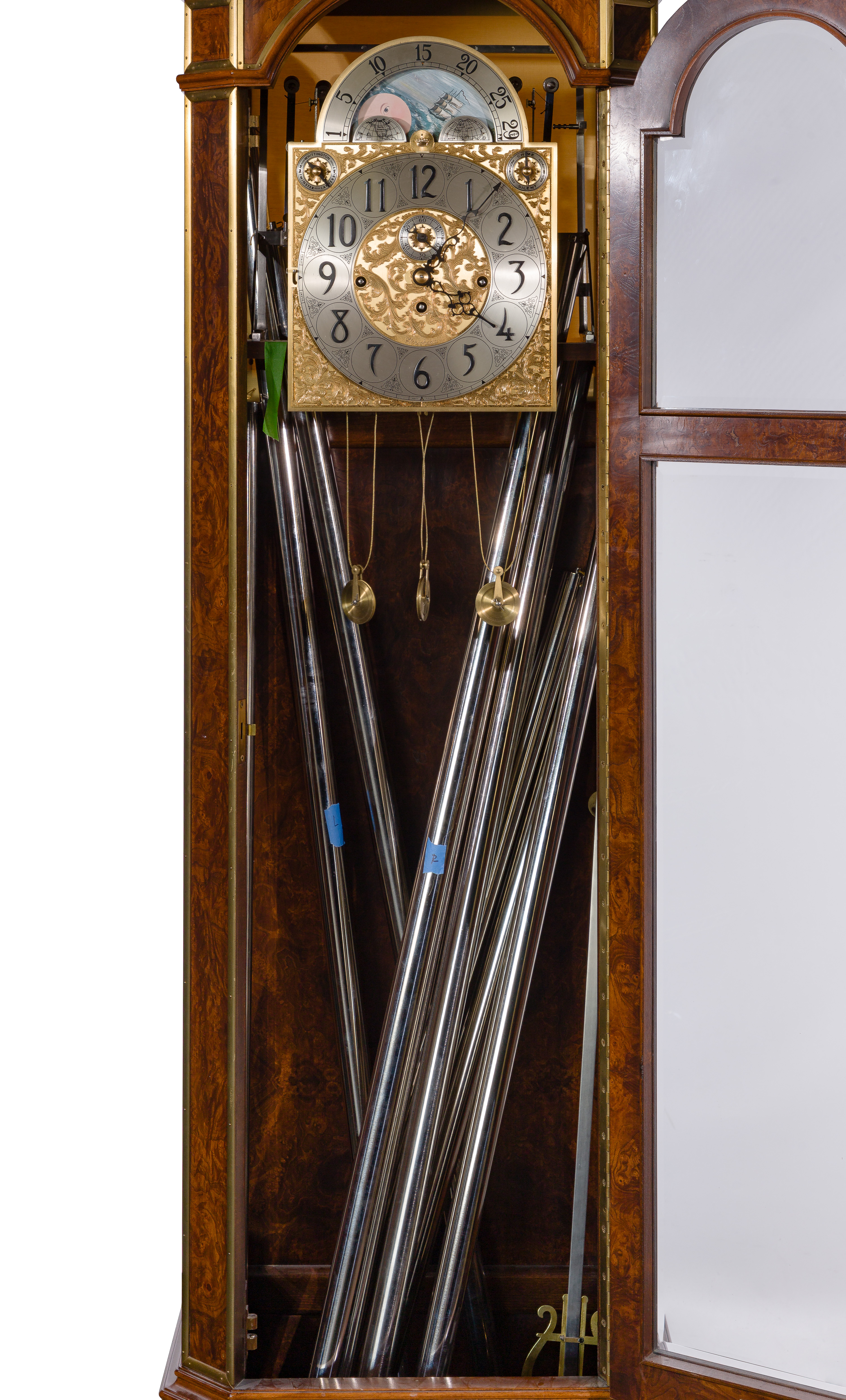 An olive ash burl veneer case serial #633077 having brass mounts, beveled glass, gold-plated hand engraved face plate, hand painted moon dial, brass movement, nine tubular bells playing Westminster, Whittington and Canterbury chimes, including tubular bells, pendulum, weights and key