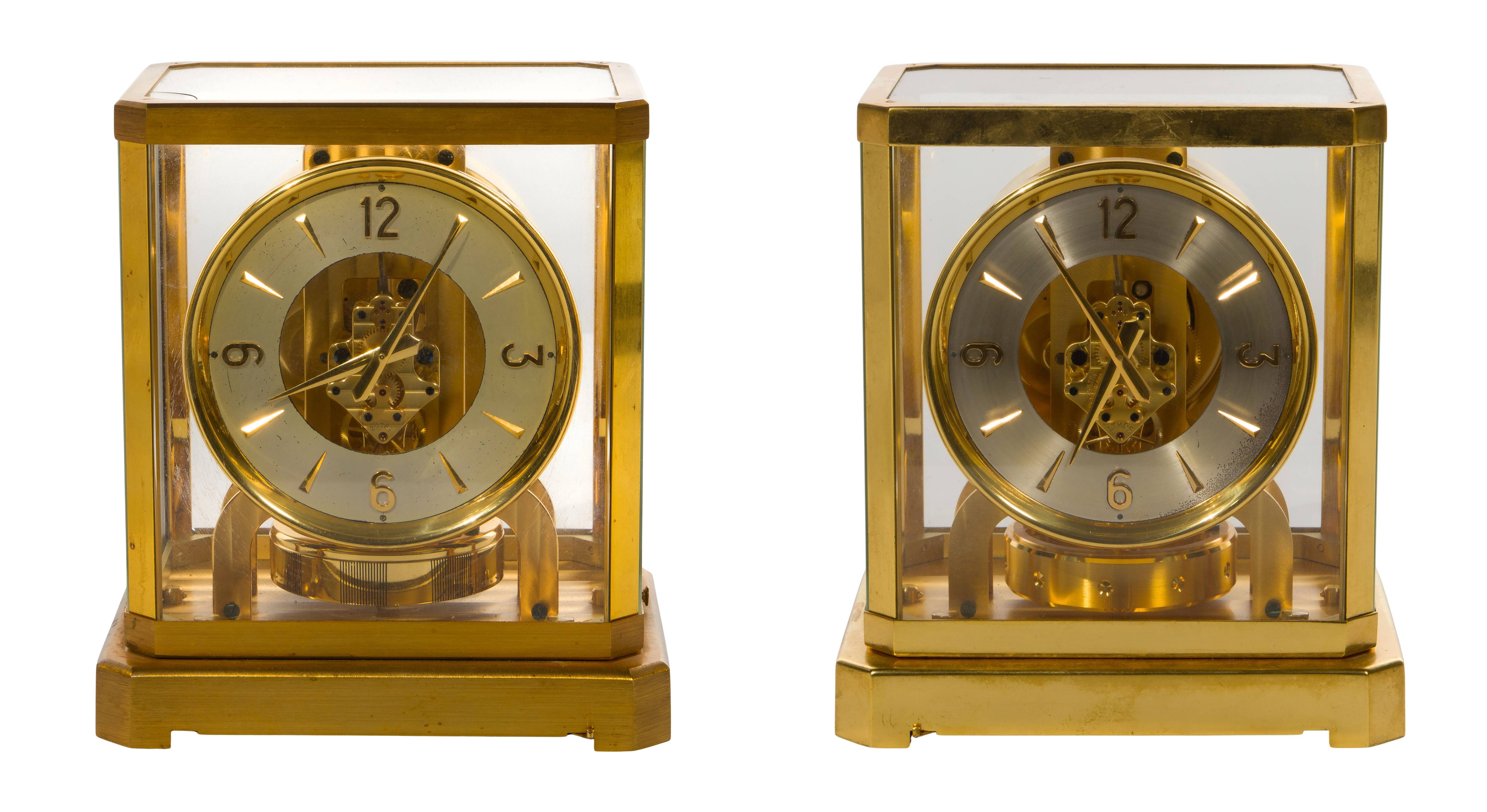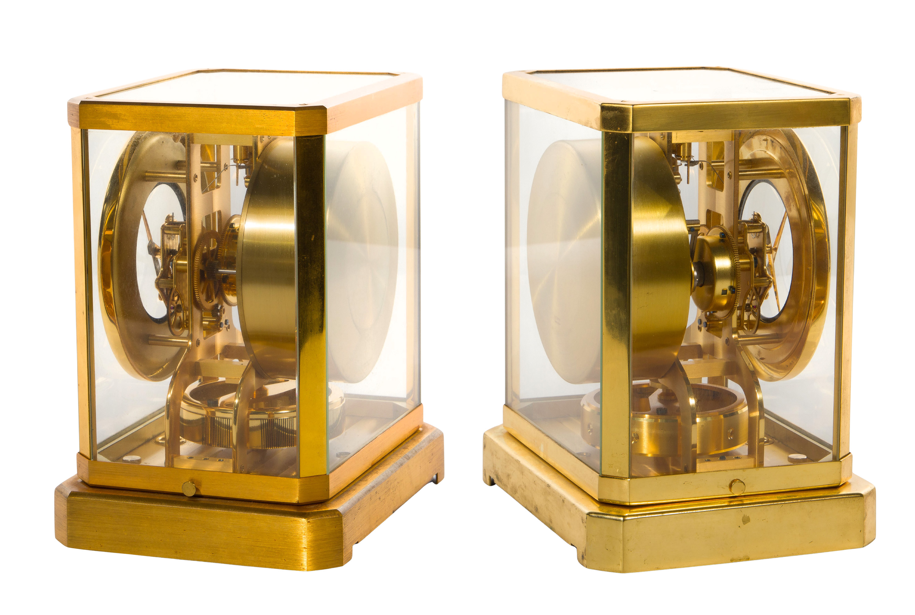 (2) clock including serial #720762, gilt brass and glass having a circular champagne ring face, brass markers and Arabic numerals, regulated by a torsion pendulum as well as serial #27174, gilt brass and glass having a circular silver ring face, brass markers and Arabic numerals, regulated by a torsion pendulum