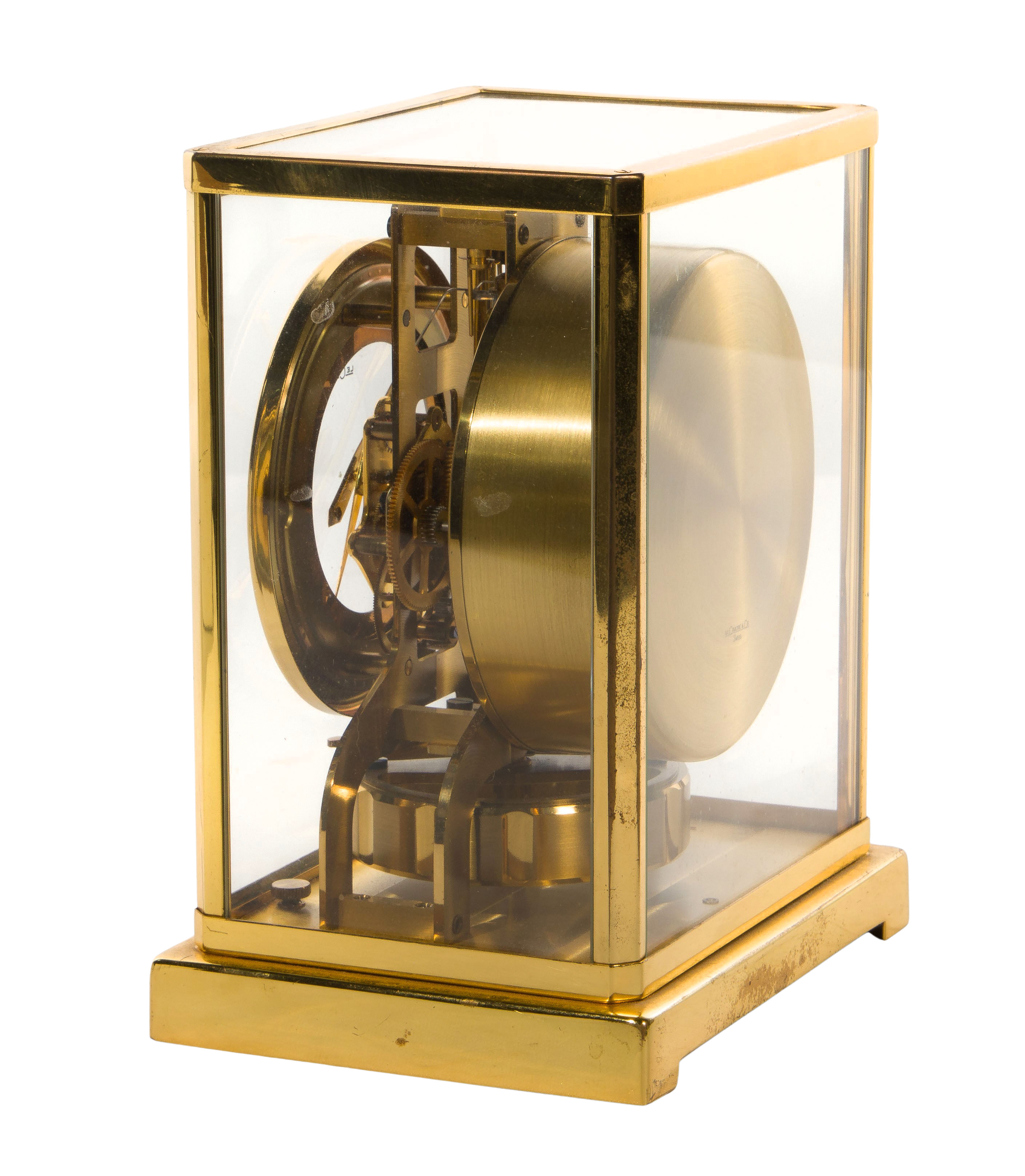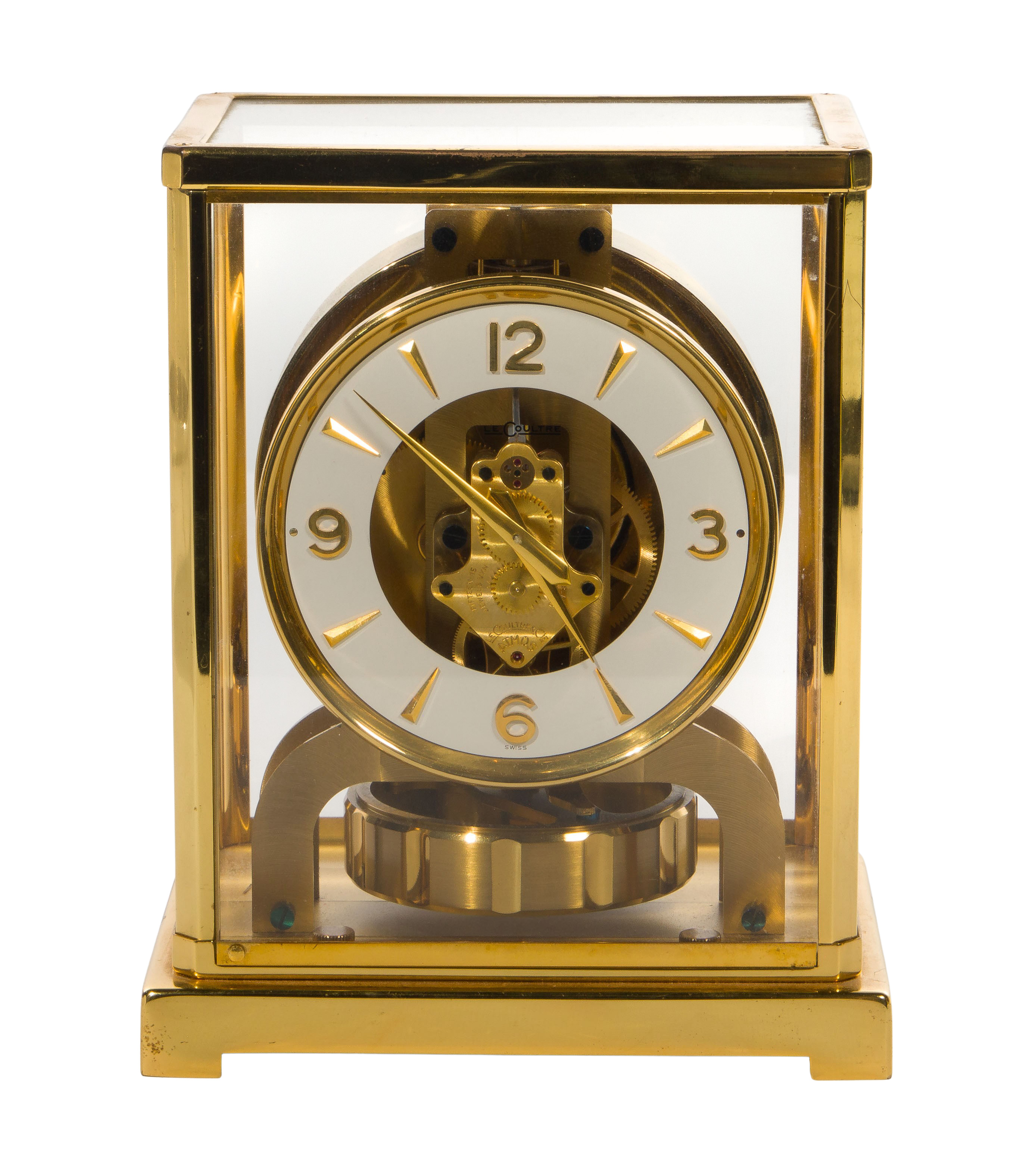 Serial #70369, gilt brass and glass having a circular white ring face, brass markers and Arabic numerals, regulated by a torsion pendulum