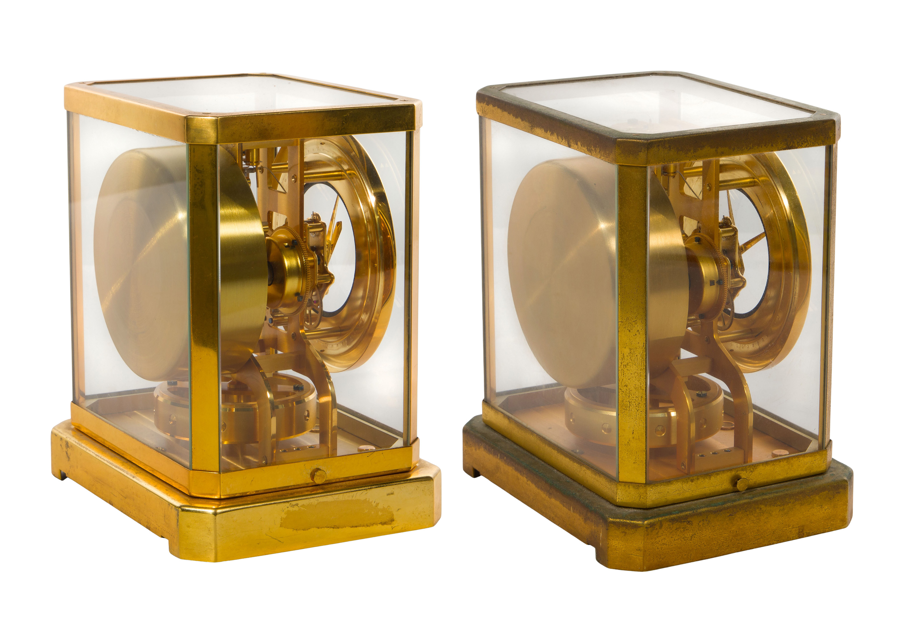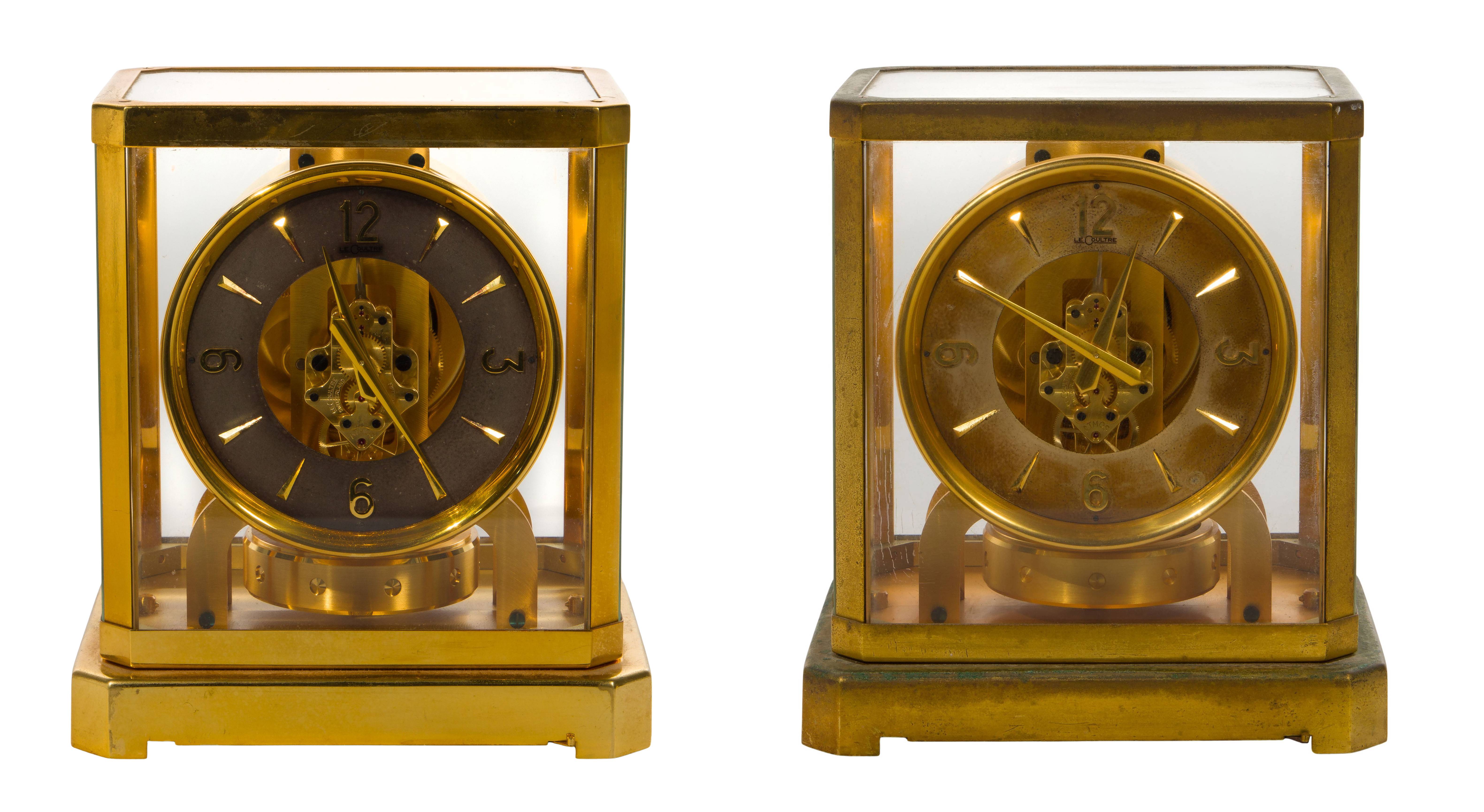 (2) clocks including serial #527097, gilt brass and glass having a circular graphite ring face, brass markers and Arabic numerals, regulated by a torsion pendulum as well as serial #42434, gilt brass and glass having a circular brass ring face, brass markers and Arabic numerals, regulated by a torsion pendulum