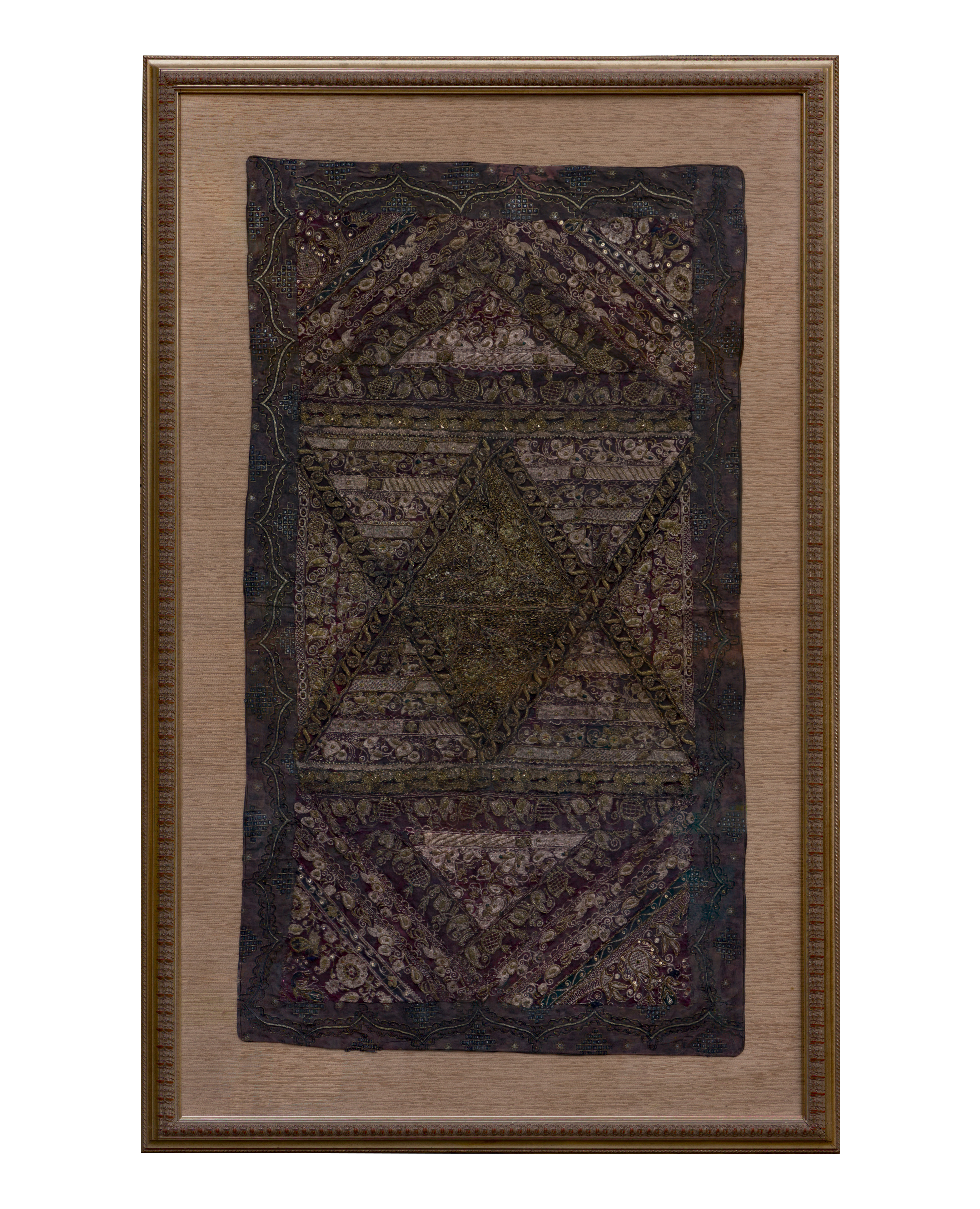 A textile having metallic thread and sequins, float mounted, under acrylic in a gold-tone painted frame