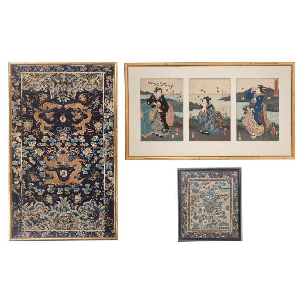 (3) total items including the triptych having printed signatures, matted behind glass in a faux bamboo wood frame; together with (2) Chinese tapestry panels behind glass / acrylic in wood frames