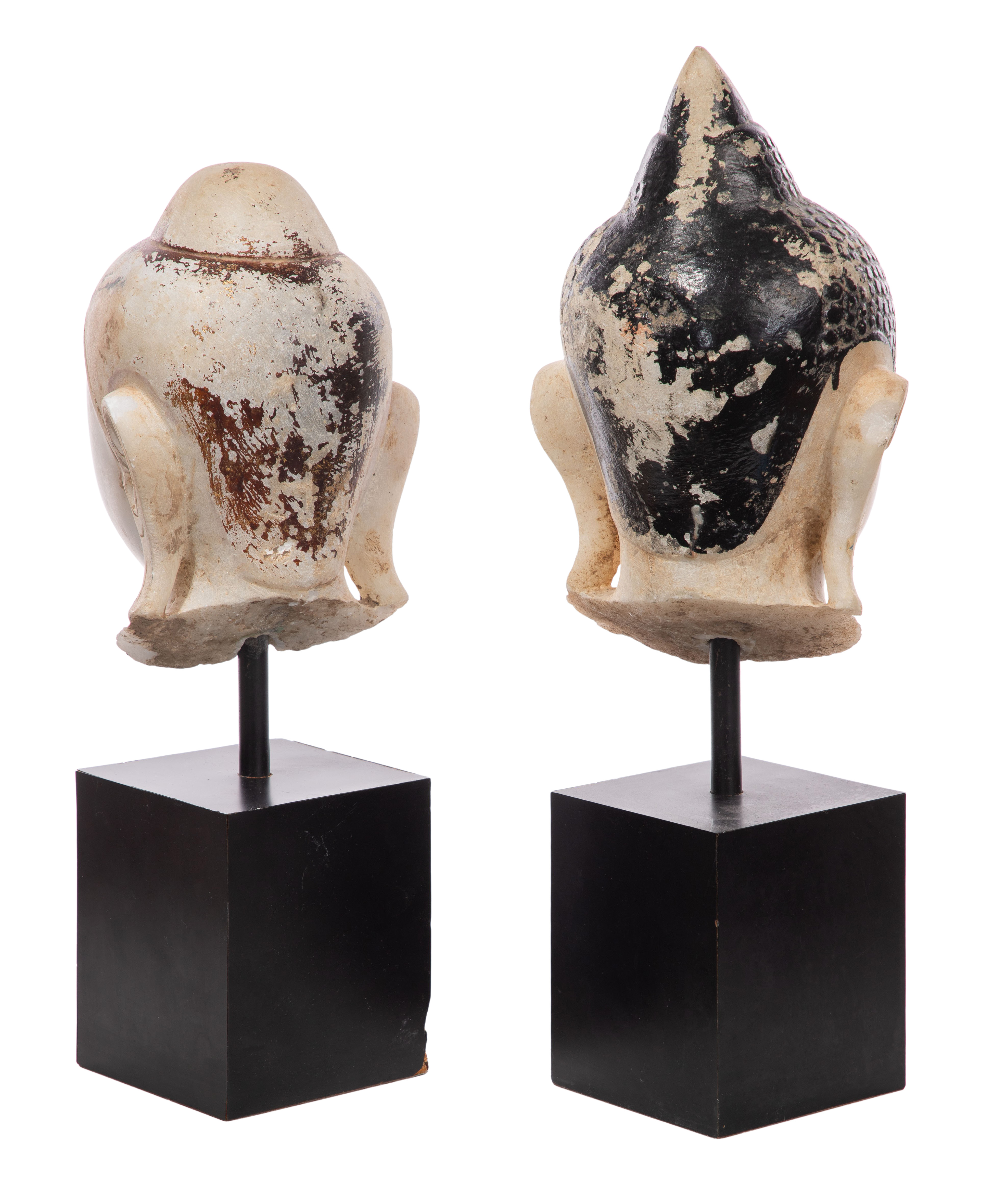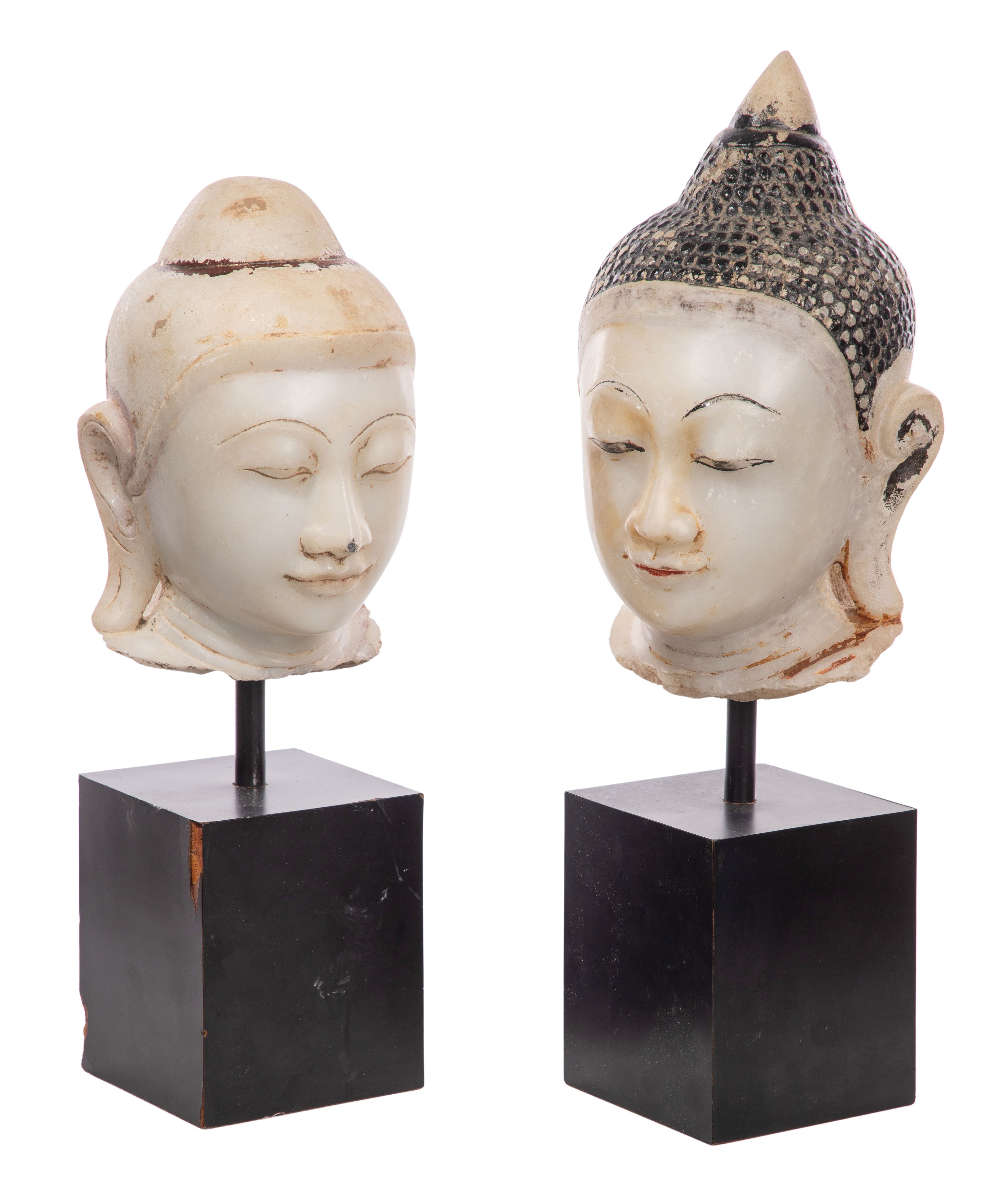 (2) similar heads, hand carved from alabaster, larger having black hair and areas of paint and gilt, both on wood stands