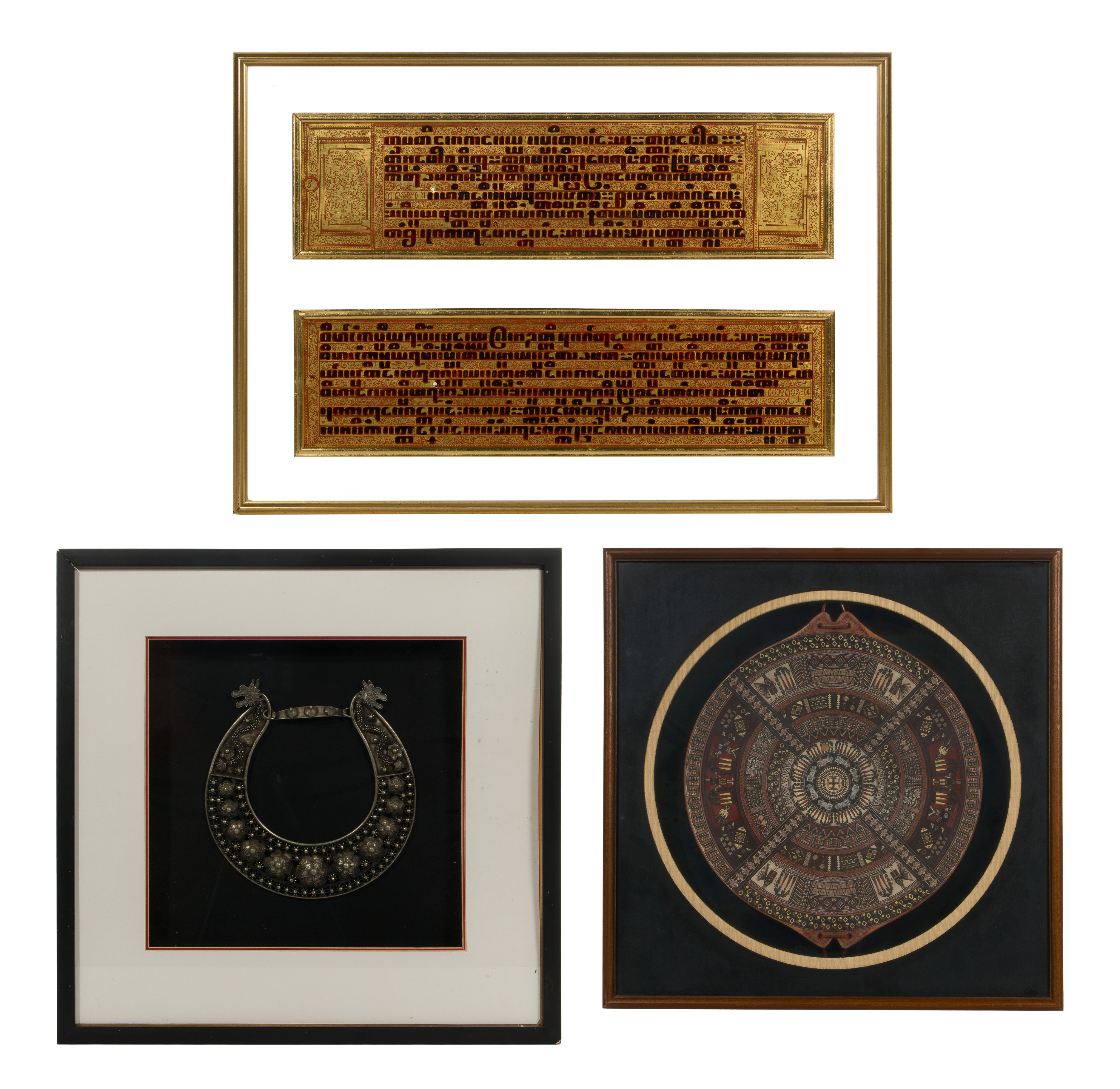 (3) items including a set of two Burmese Buddhist teak wood Kammavaca pages having red and black lacquer decoration and text on gold-tone ground, in individual frames mounted to acrylic (for viewing backs) in a gold-tone wood frame, a Chinese ethnic minority Miao low purity silver dragon headed necklace mounted within a mat behind acrylic in a black wood shadowbox frame and a Peruvian Inca style polychrome pottery plate mounted within a mat behind acrylic in a wood shadowbox frame