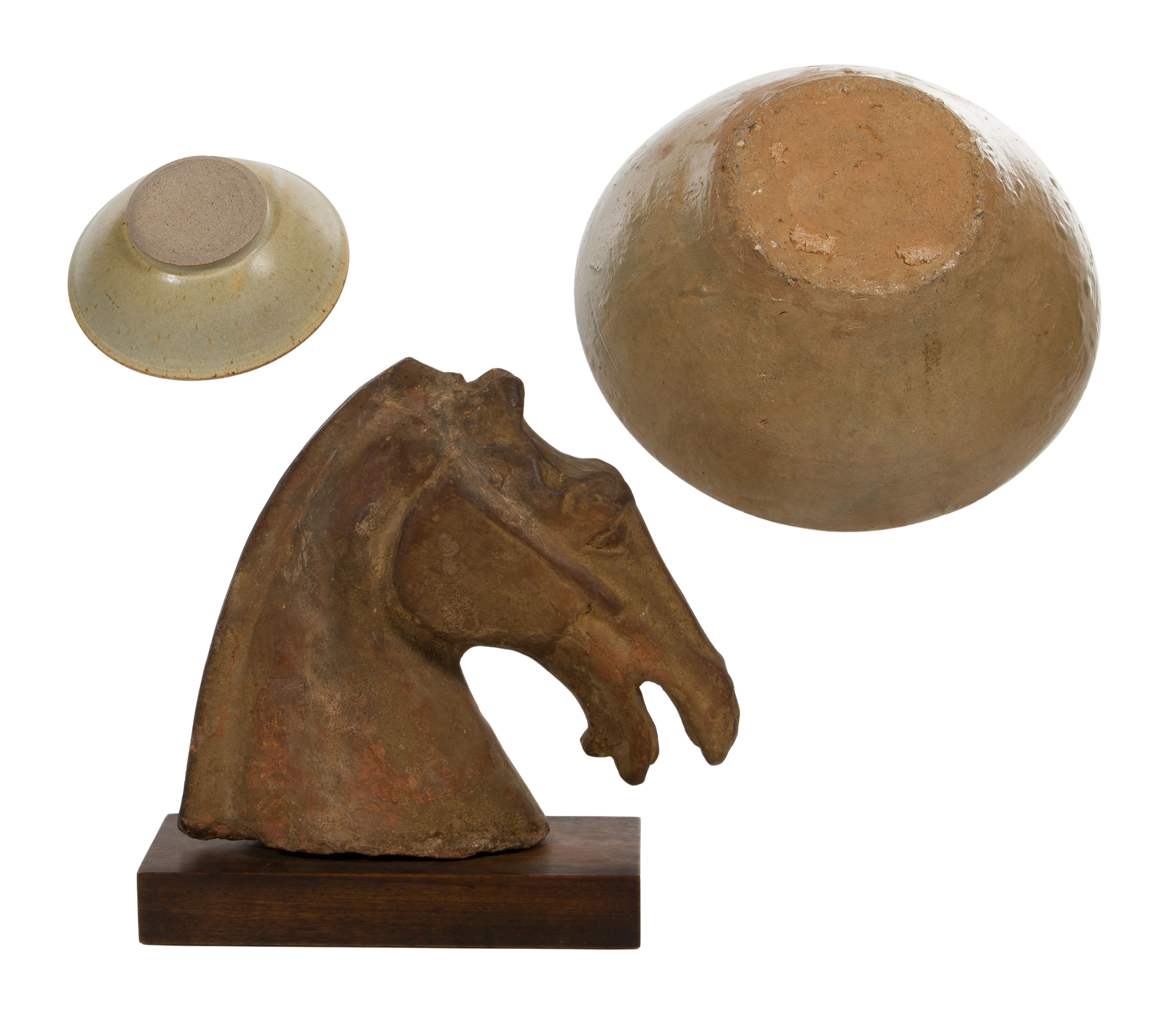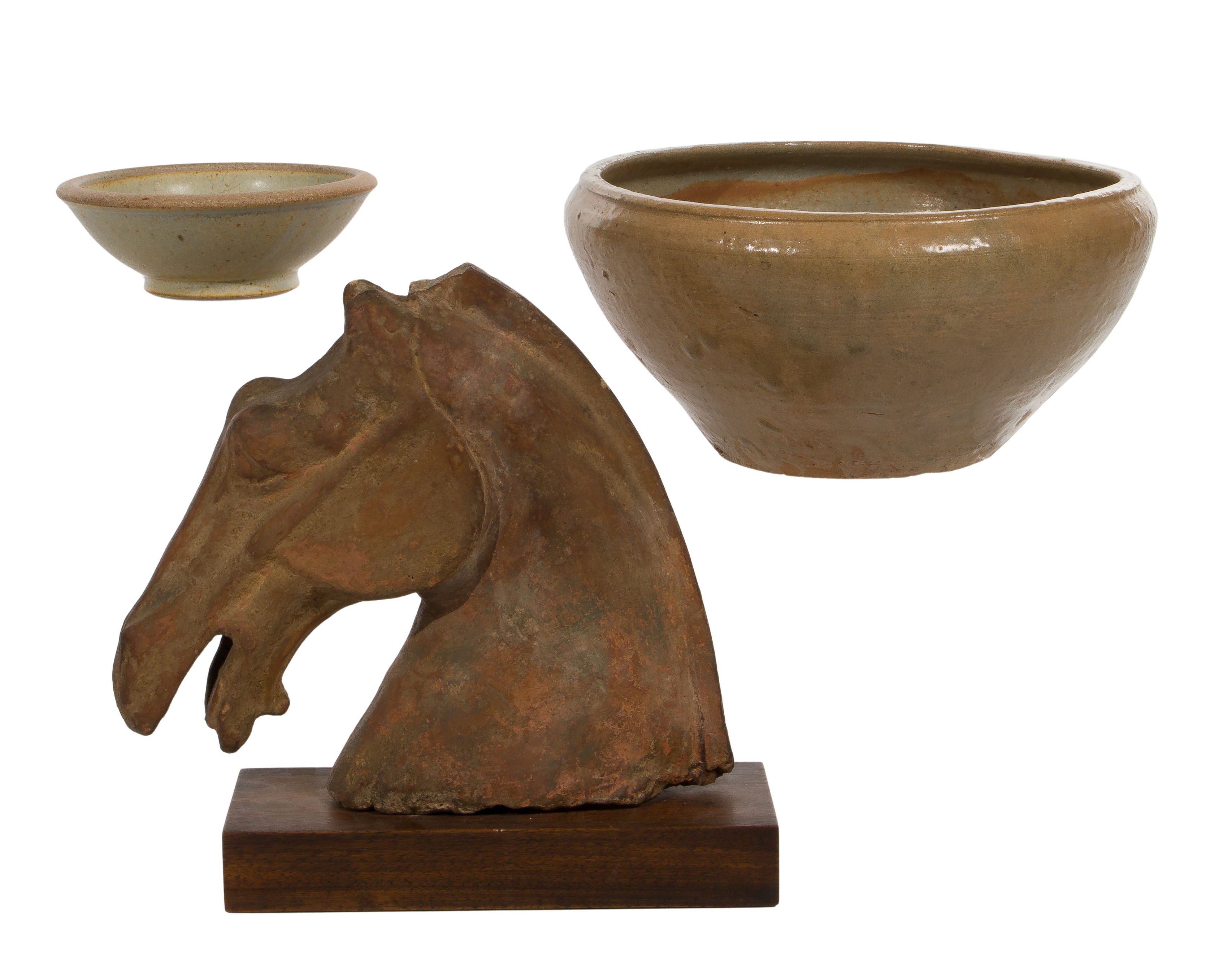 (3) items including a Haji style bowl, a speckled glaze footed bowl and a horse head on wood base