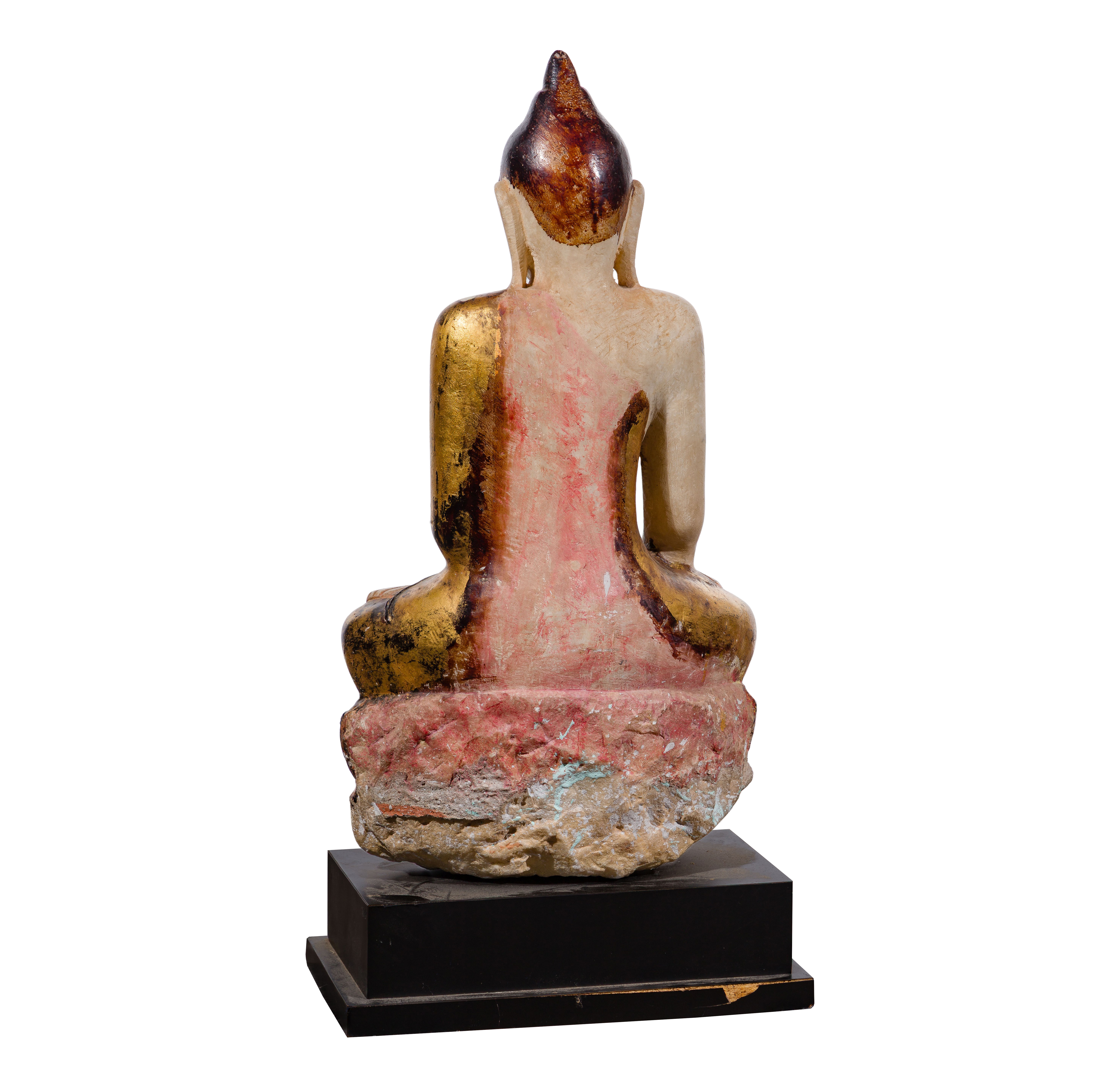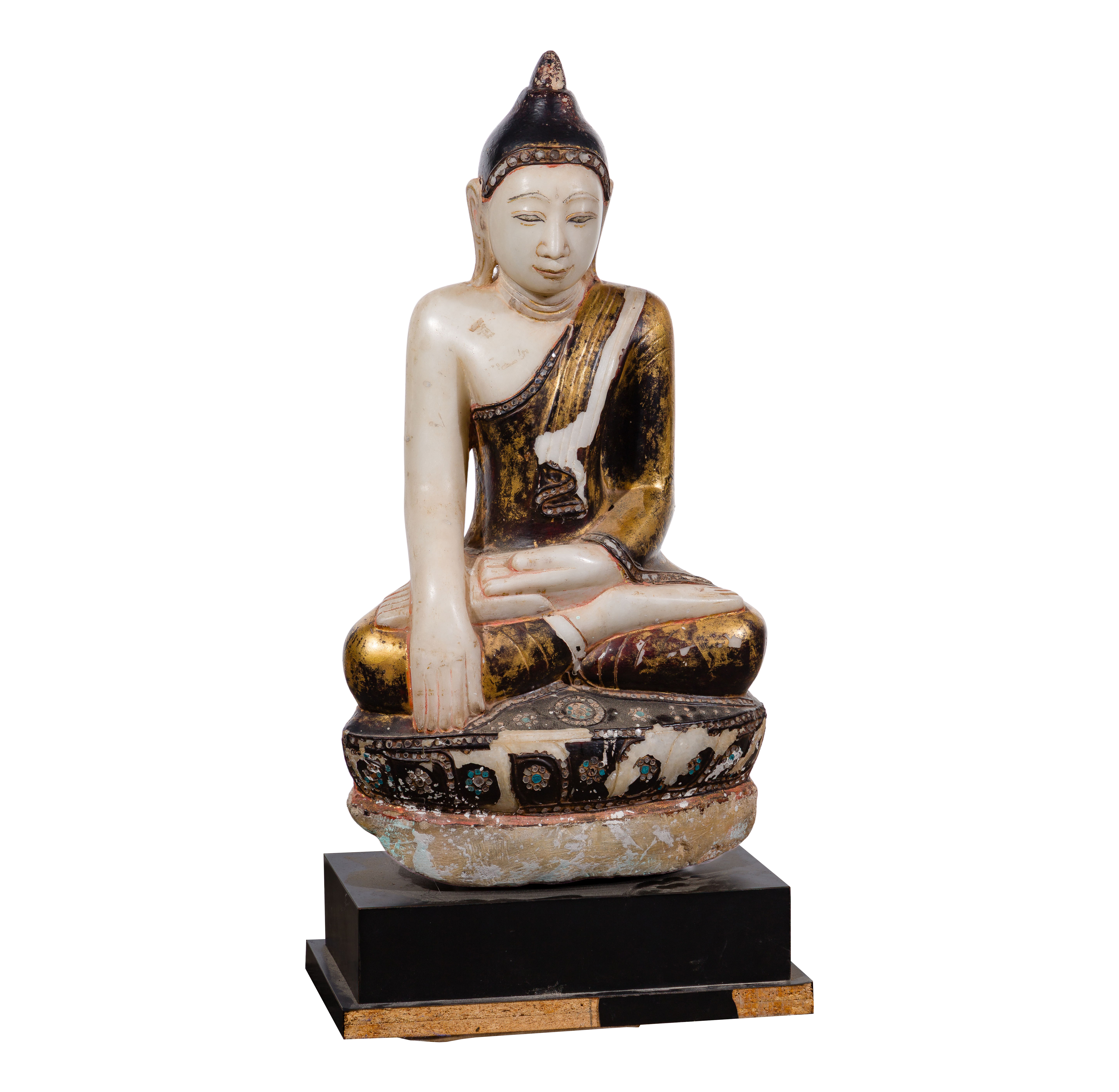 Having gilt over black lacquer decoration, nacre and turquoise colored stone inlays to drapery and base, sitting in the ‘calling the Earth to witness’ mudra, on black laminate on wood base